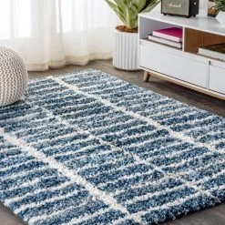 Merida Stacked Grid Shag Indigo Blue/Ivory 5 ft. 3 in. x 7 ft. 7 in. Area Rug by JONATHAN Y