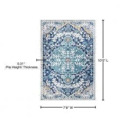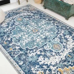 With its indigo tones, this medallion rug adds Bohemian style to a living room, bedroom, entry or kitchen. Ivory and gold geometric accents on a deep blue background give this rug a hand-woven, vintage vibe. The busy allover pattern is pet-friendly and great for kids too.