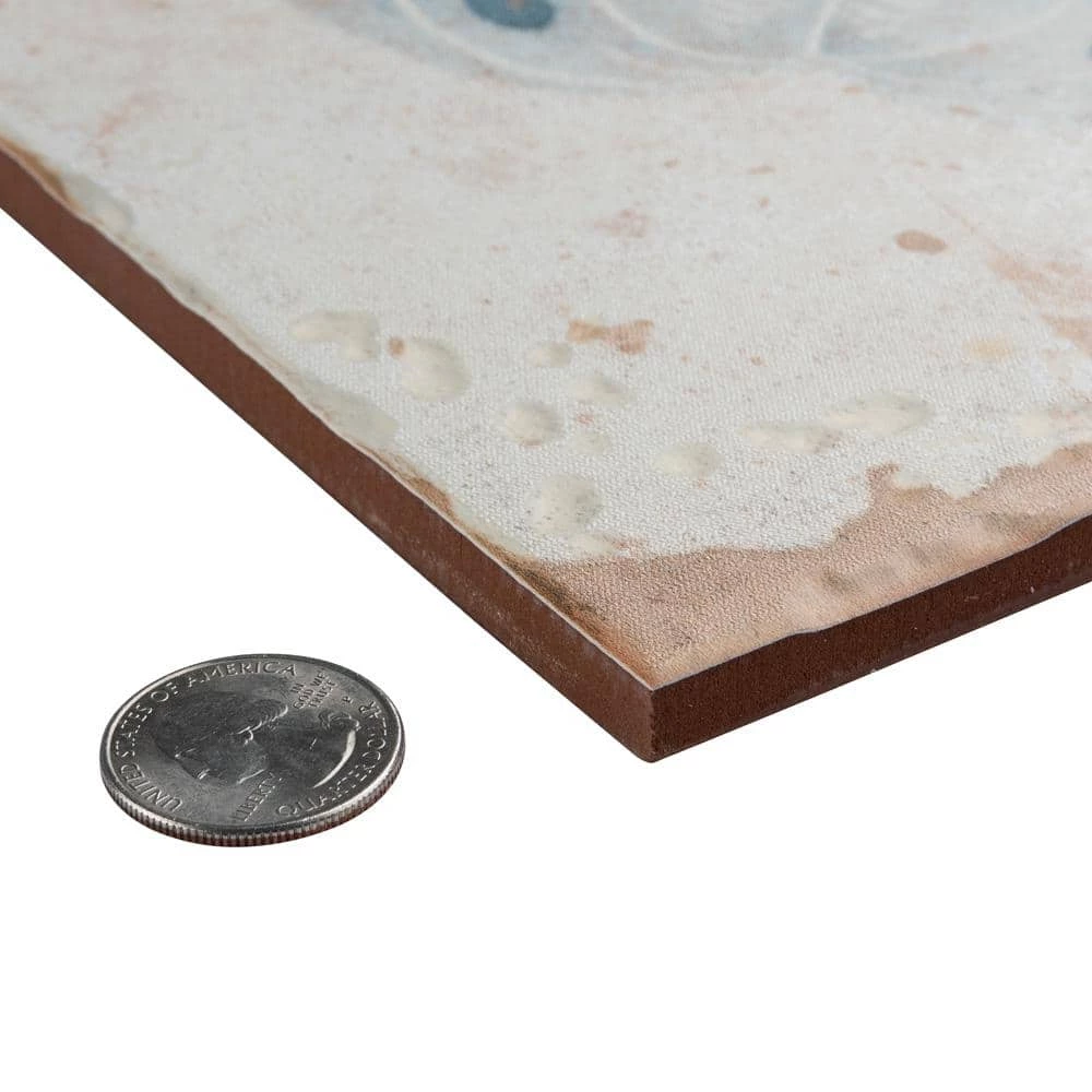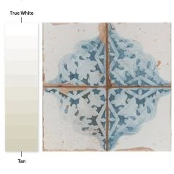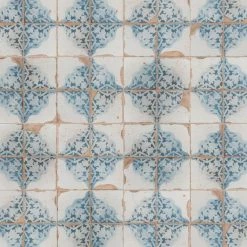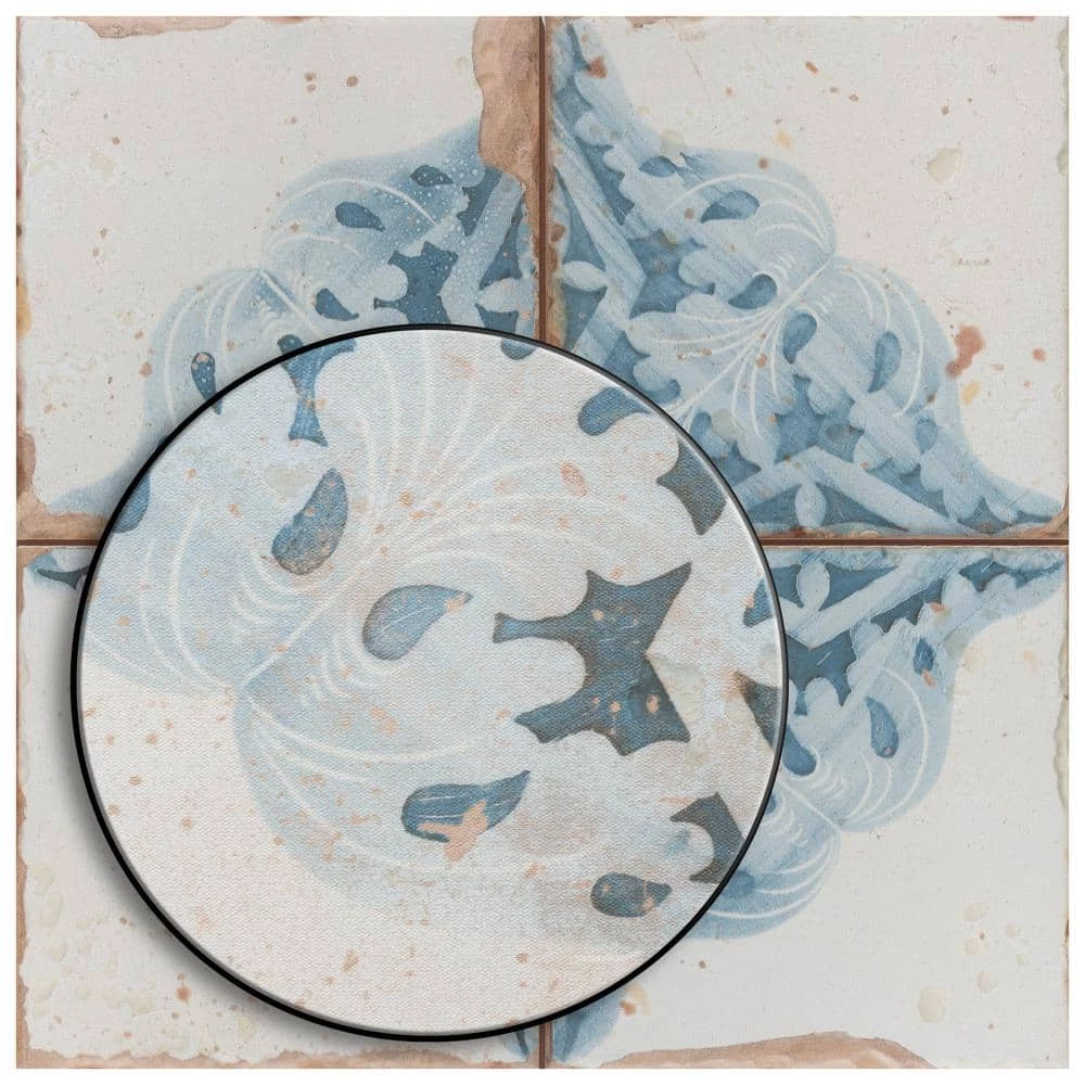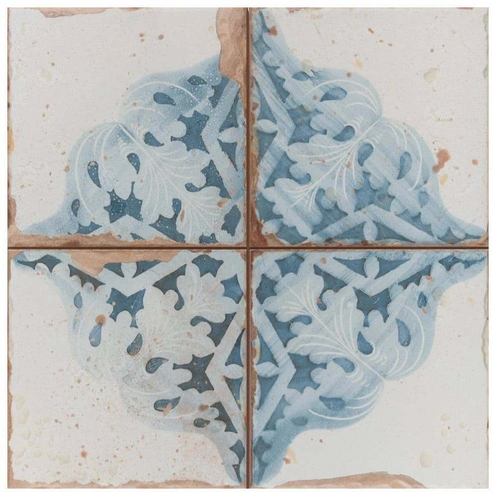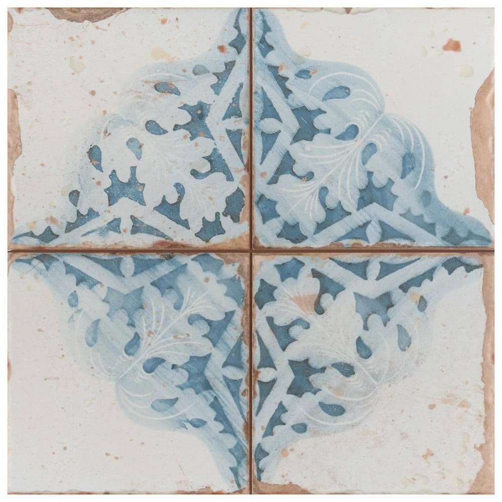 It is easy to picture sun-drenched streets of Spain when looking at the Merola Tile Artisan Azul Decor 13 in. x 13 in. Ceramic Floor and Wall Tile. Save time and labor spent arranging smaller square tiles and instead install these durable ceramic slabs, which have four squares with realistic lines in between to mimic grout. The low-sheen white glaze is offset by a blue floral design in the center of the tile. Imitations of scuffs and spots mark well-loved, century-old tiles. Rich red tones from the ceramic underneath peek through, adding a worn finishing touch on this uniquely aged piece. There are 8 different variations available that are randomly scattered throughout each case. The scored grout lines can be grouted with the color of your choice, or left ungrouted for a rugged finish. Bring rustic charm to your interior with this easy-to-maintain look.