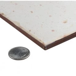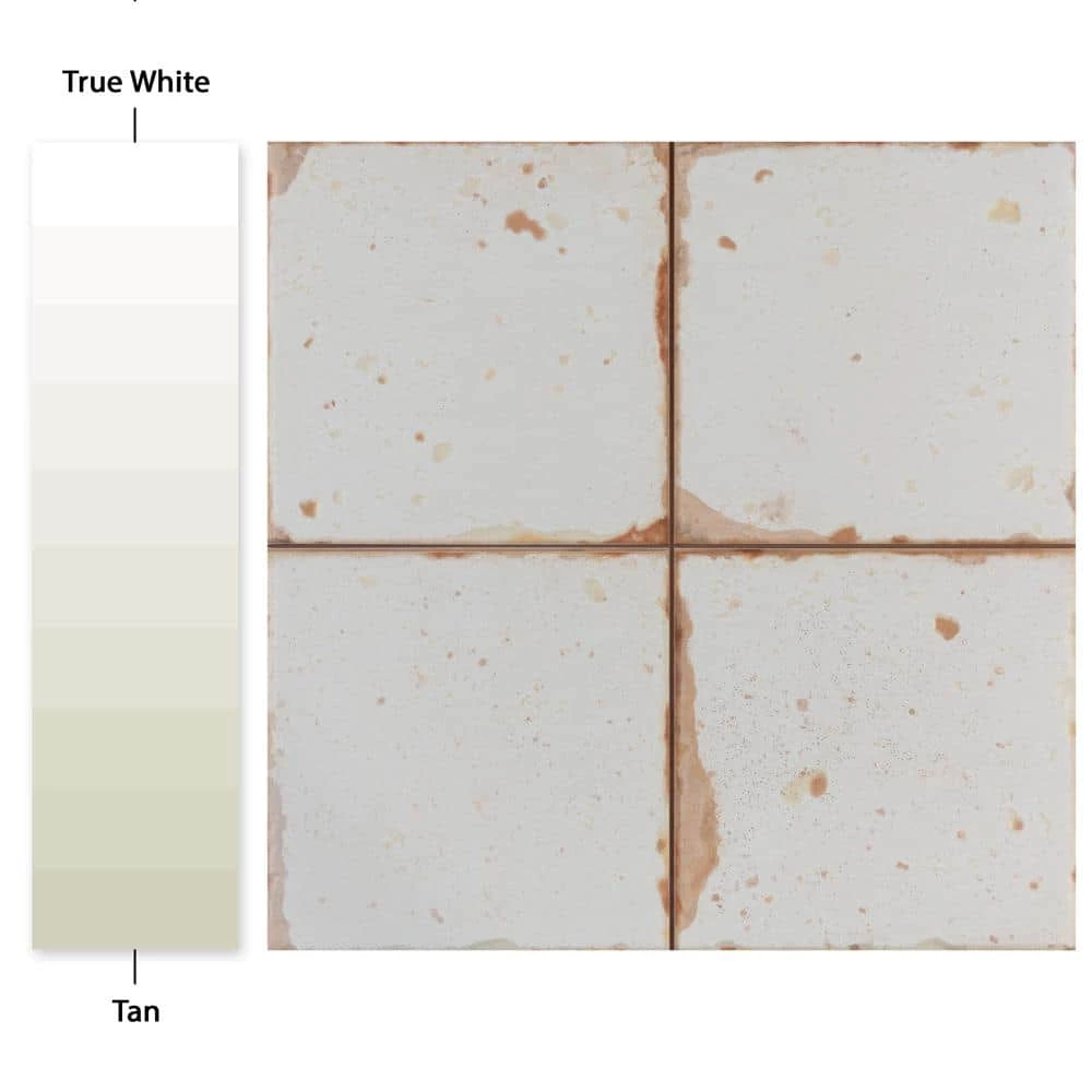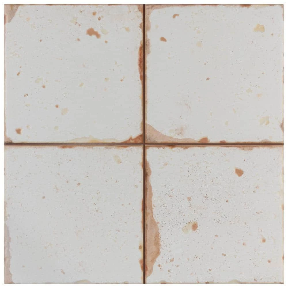 It is easy to picture sun-drenched streets of Spain when looking at the Merola Tile Artisan Blanco 13 in. x 13 in. Ceramic Floor and Wall Tile. Save time and labor spent arranging smaller square tiles and instead install these durable ceramic slabs, which have four squares with realistic lines in between to mimic grout. The low-sheen white glaze is offset by imitations of scuffs and spots that mark well-loved, century-old tiles. Rich red tones from the ceramic underneath peek through, adding a worn finishing touch on this uniquely aged piece. There are 8 different variations available that are randomly scattered throughout each case. The scored grout lines can be grouted with the color of your choice, or left ungrouted for a rugged finish. Bring rustic charm to your interior with this easy-to-maintain look.