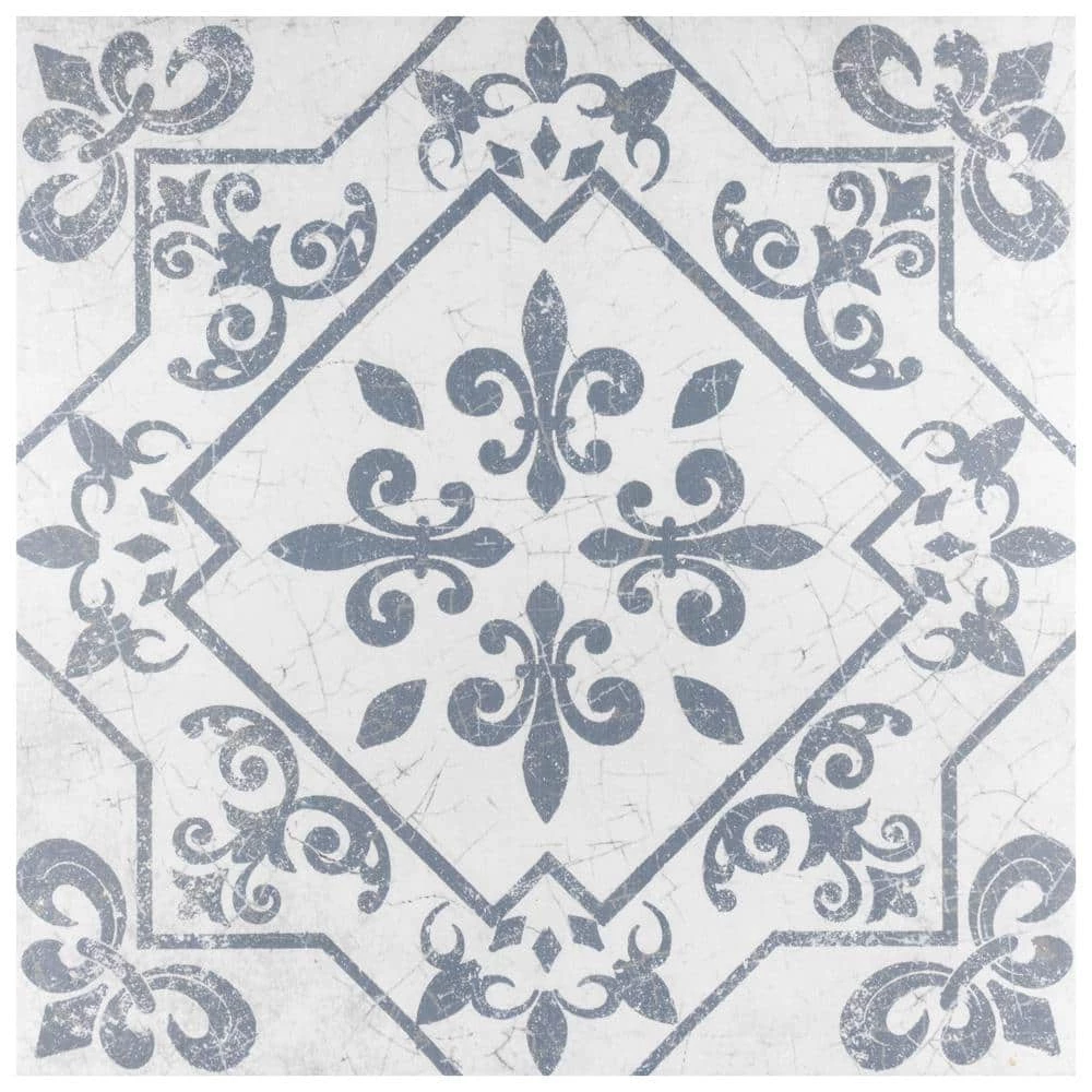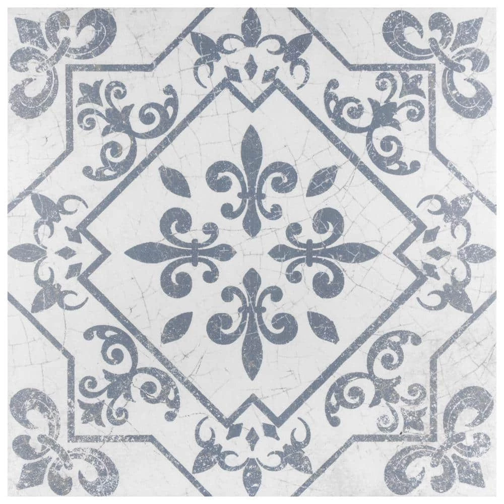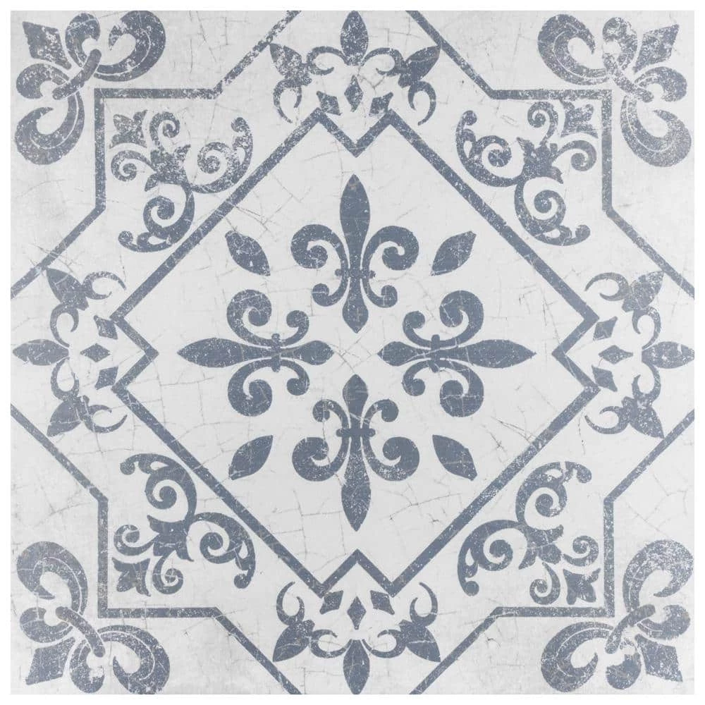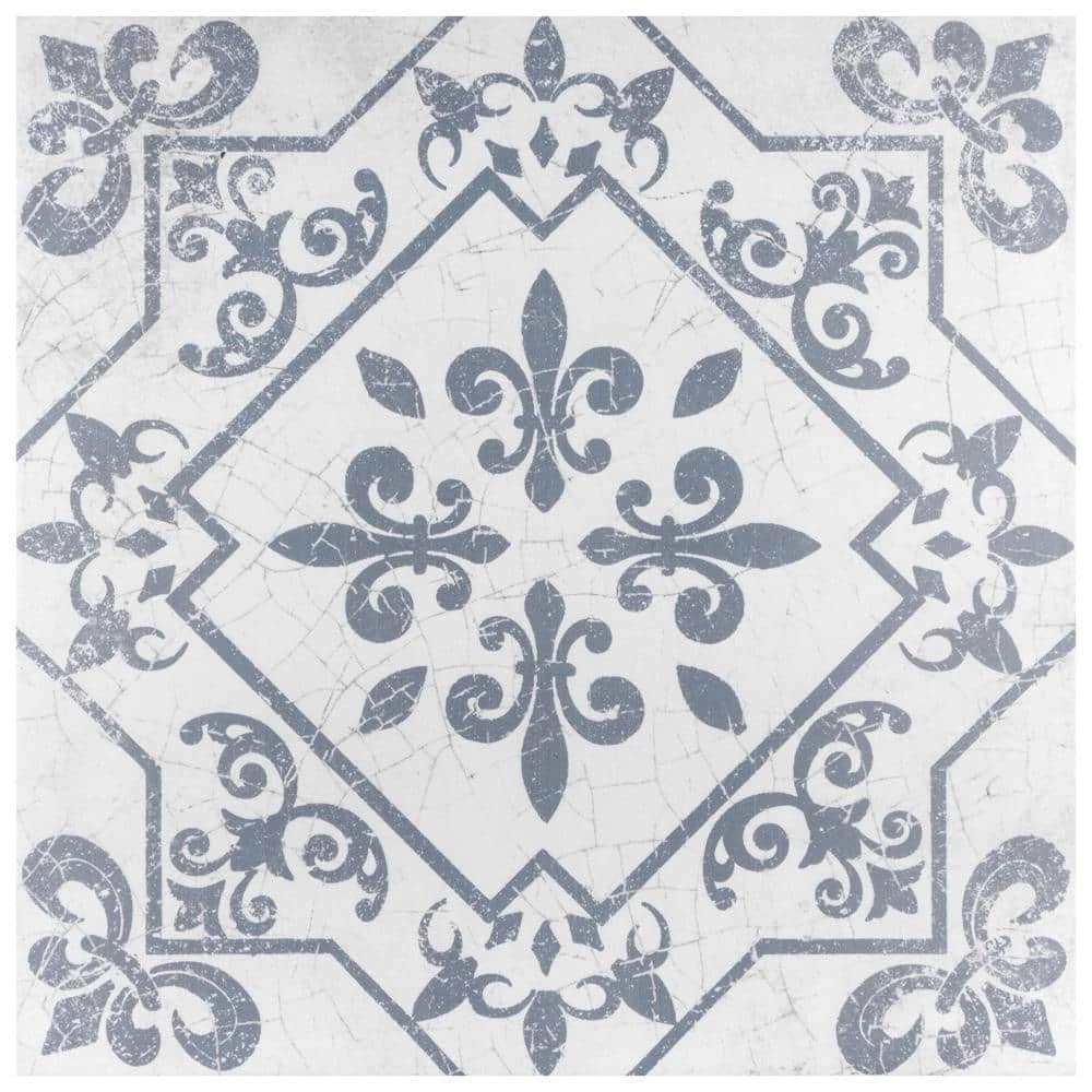 Vintage European design was the inspiration behind the Merola Tile Atlantic Azul Ceramic Floor and Wall Tile. With a crackling cool white surface, this Spanish tile rivals antique, old-world design. Slate blue lines diagonally intersect, creating sharp angles and offset framing patterns. Set within the center diamond are four fleur-de-lis configurations, creating an appealing, elegant centered design. Flourishing patterns in the four corners further express its encaustic inspiration. All of these patterns are distressed, convincing that this tile is truly aged. The medium-sheen finish further convinces that this is an age-old tile. This durable tile is suitable for most interior installations, including kitchens, bathrooms, and showers. Tile is the better choice for your space. This tile is made from natural ingredients, making it a healthy choice as it is free from allergens, VOCs, formaldehyde and PVC.