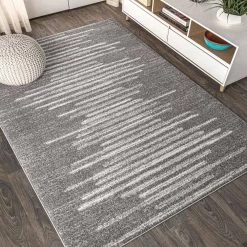 Inspired by vintage Moroccan rugs, our modern striped rug is power-loomed with a short pile. The central stripe pattern is woven in ivory on a gray background; the mingled threads recall traditional handwoven rugs. Add some Bohemian style to your home with this easy-care rug.
