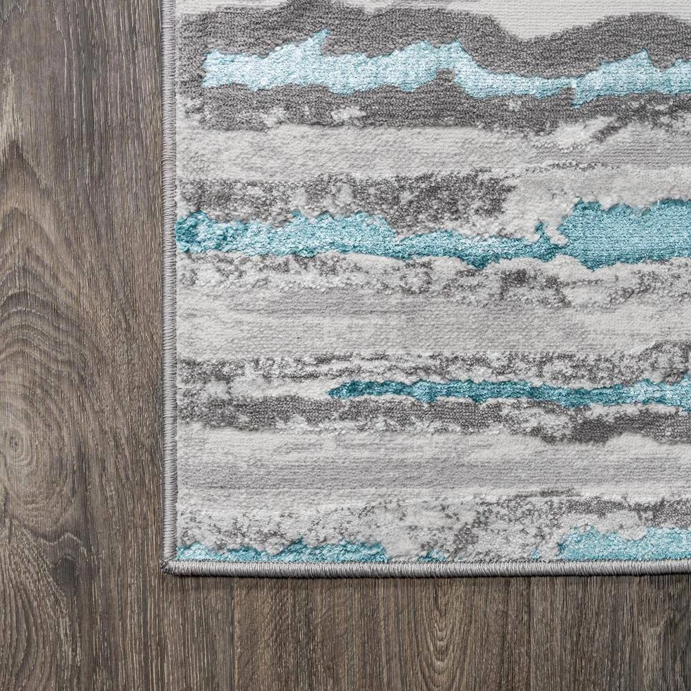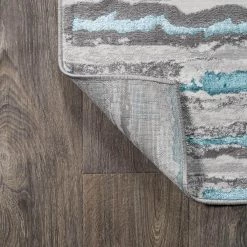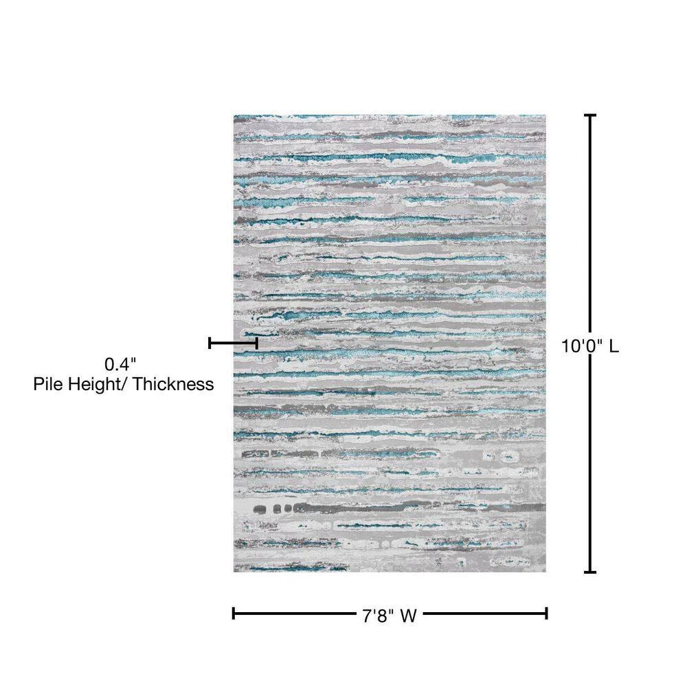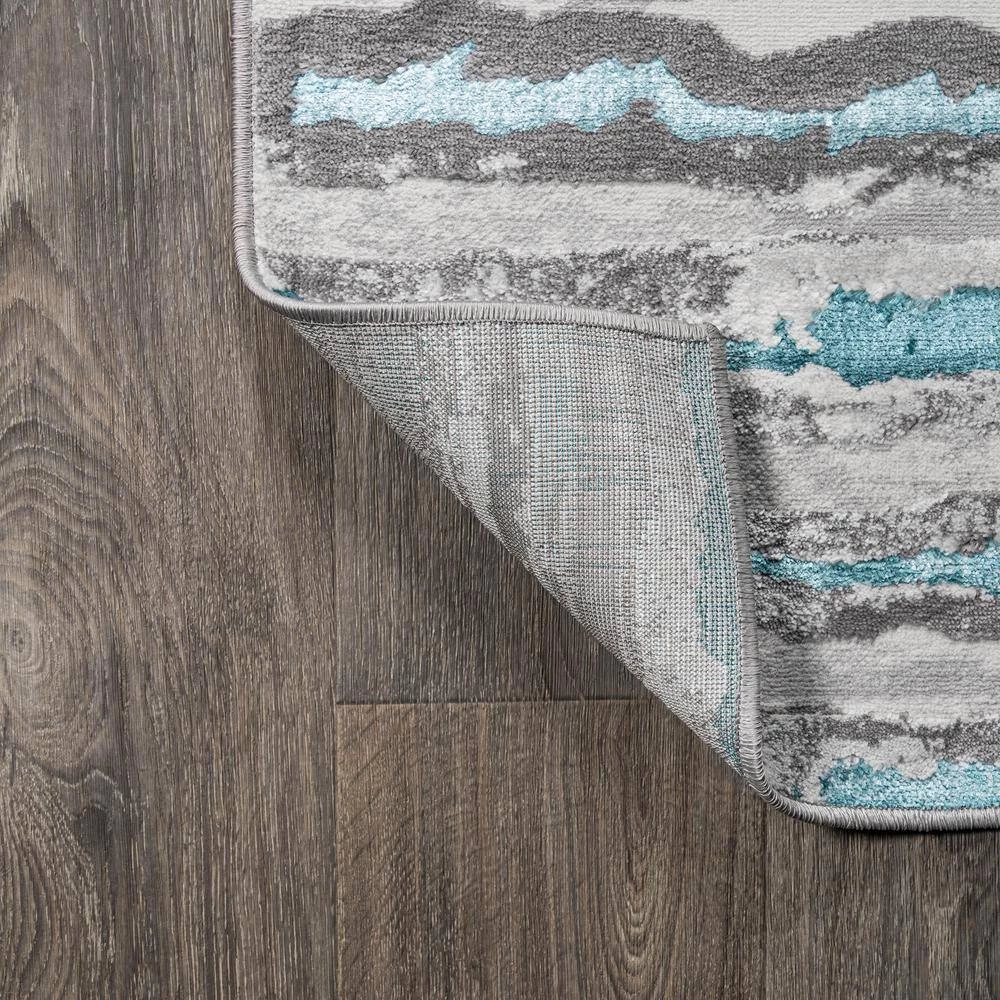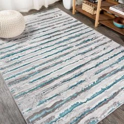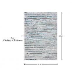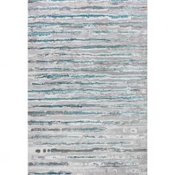 Mingled threads of turquoise, gray and ivory create a modern, abstract linear design with a mid-century look. This rug’s unique strie stripe pattern makes it perfect for homes with kids and pets. It’s the ideal centerpiece for a contemporary, coastal or minimalist interior.