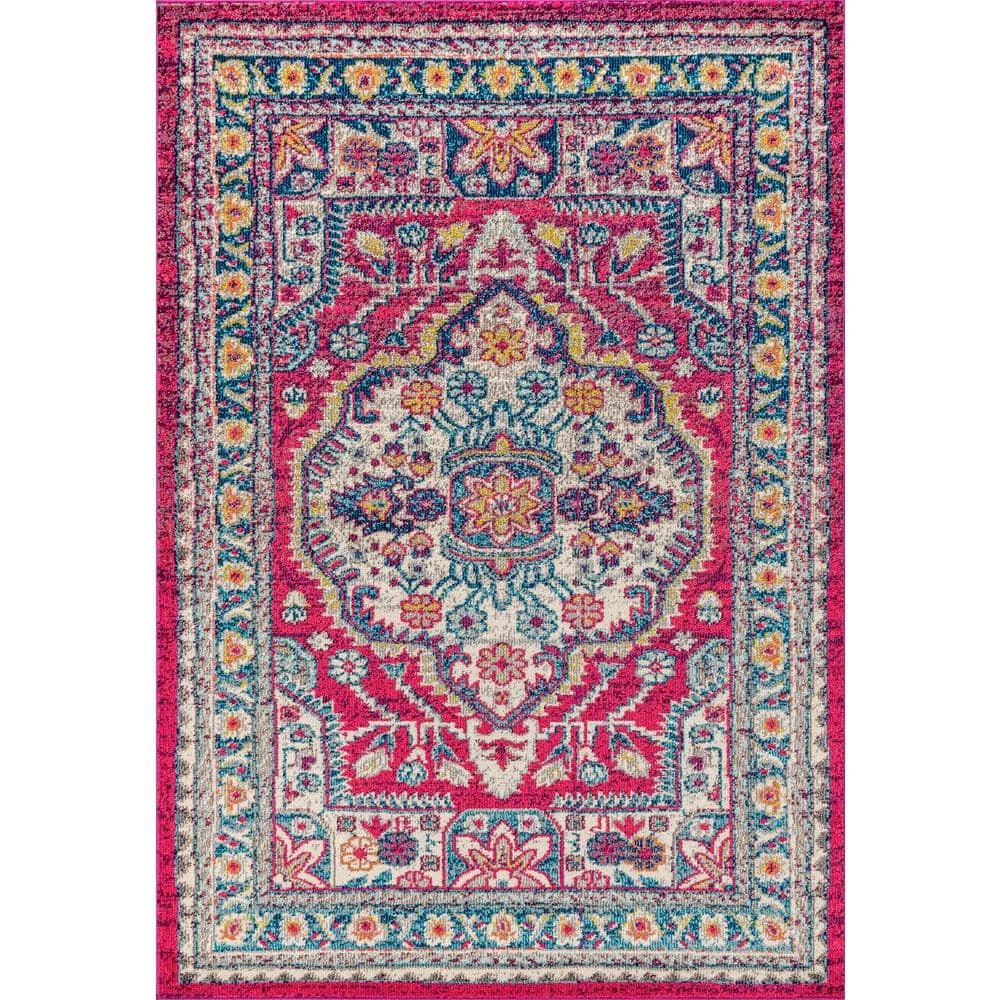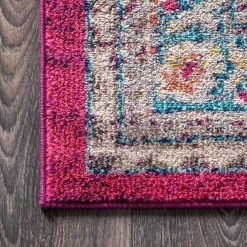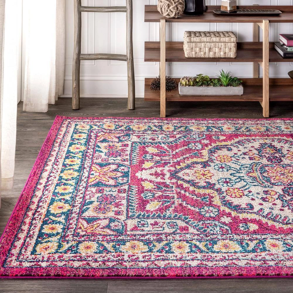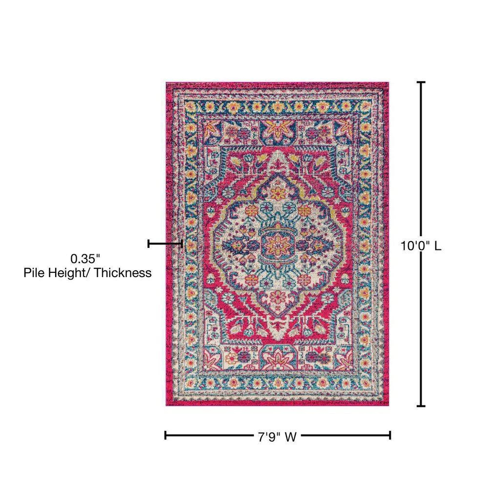 Old world style gets new life in a stunning fuchsia pink color in this bohemian rug inspired by the oriental masterpieces of antiquity. A large center medallion and thin border create an optical illusion that will make your space feel larger, all while creating a stunning accent for eclectic or modern decor. With only a 1/3 in. pile, it is durable enough for high traffic areas like a living room or foyer, but soft enough for bedrooms as well.