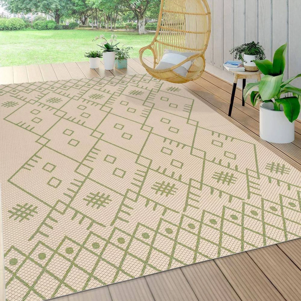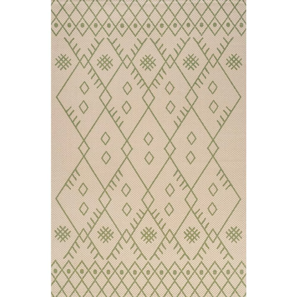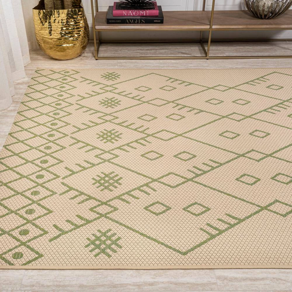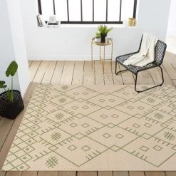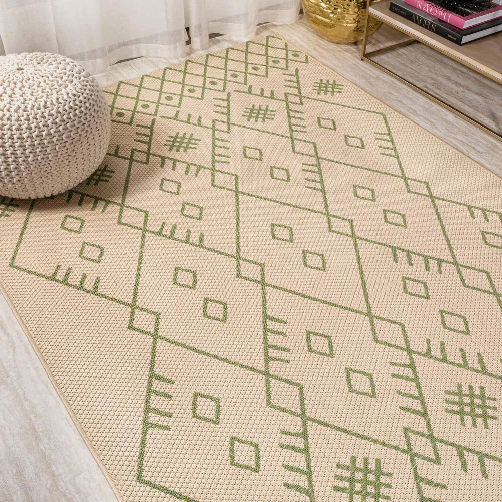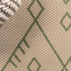 Inspired by vintage Beni Ourain Moroccan rugs, our indoor/outdoor rug adds modern Bohemian style to your porch, patio or sunroom. The classic Moroccan pattern has a geometric design of green diamonds on a field of beige. Mingled threads give this rug a handwoven, vintage vibe that’s perfect for an entry, kitchen, hallway, living room or bedroom too. The pet-friendly and kid-proof flatweave design makes it easy to clean, and perfect for the beach house.