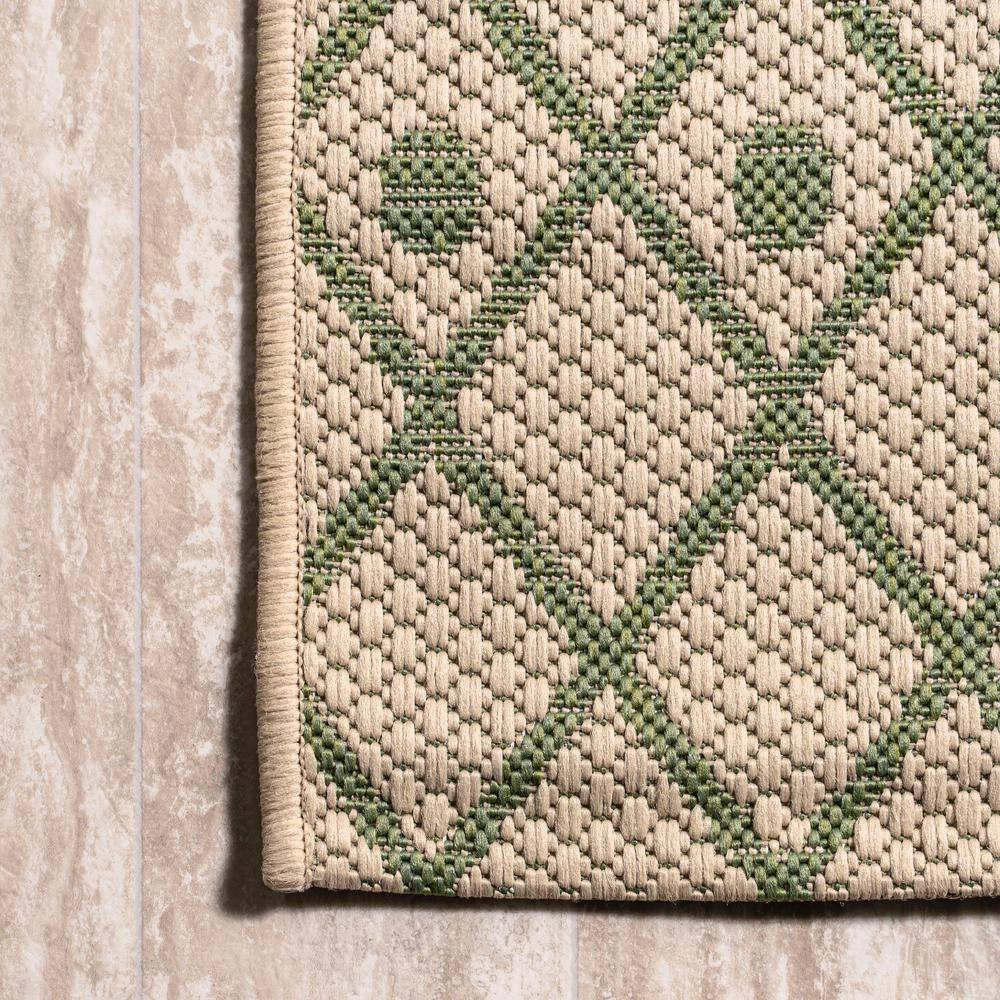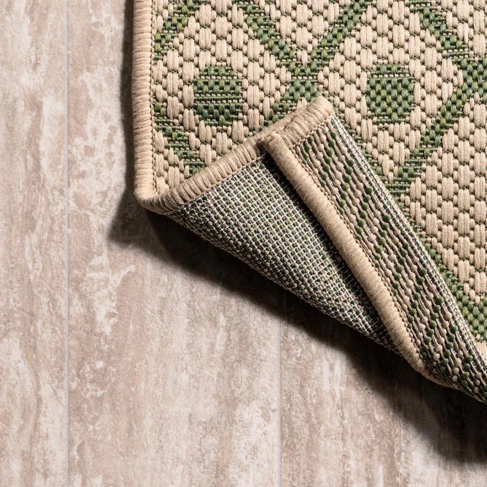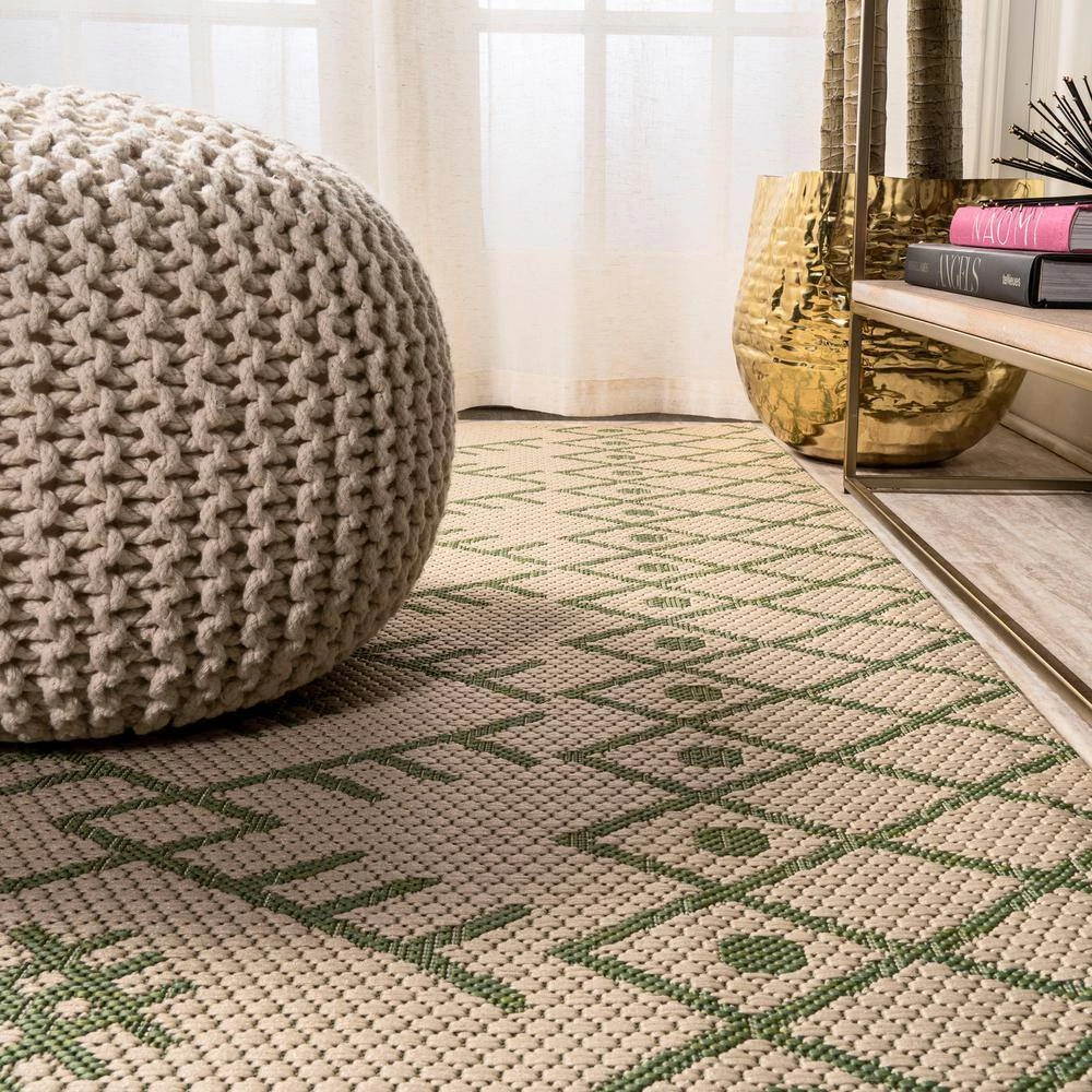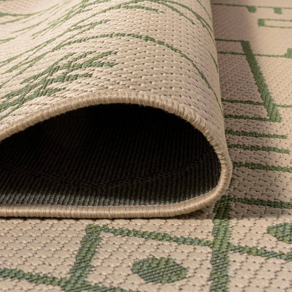 Inspired by vintage Beni Ourain Moroccan rugs, our indoor/outdoor rug adds modern Bohemian style to your porch, patio or sunroom. The classic Moroccan pattern has a geometric design of green diamonds on a field of beige. Mingled threads give this rug a handwoven, vintage vibe that’s perfect for an entry, kitchen, hallway, living room or bedroom too. The pet-friendly and kid-proof flatweave design makes it easy to clean, and perfect for the beach house.