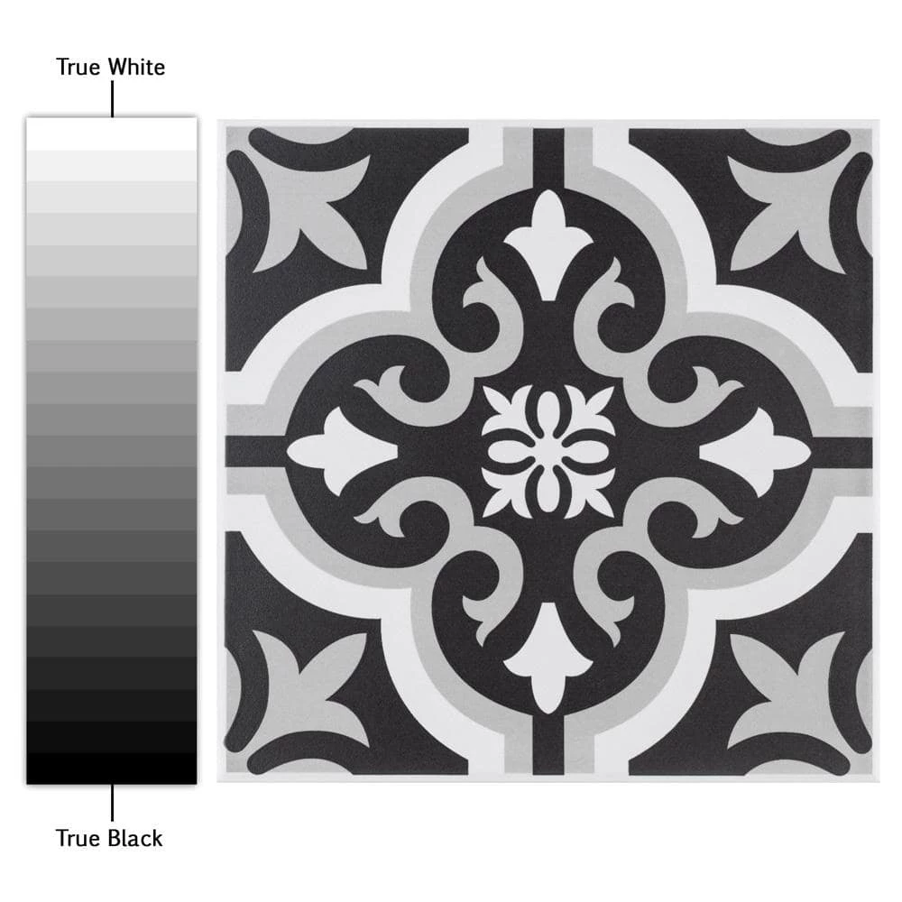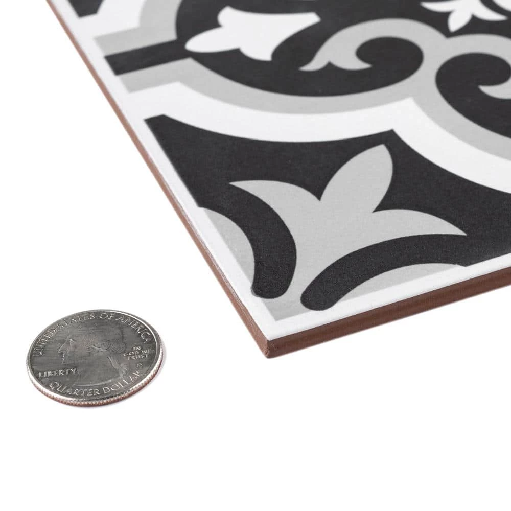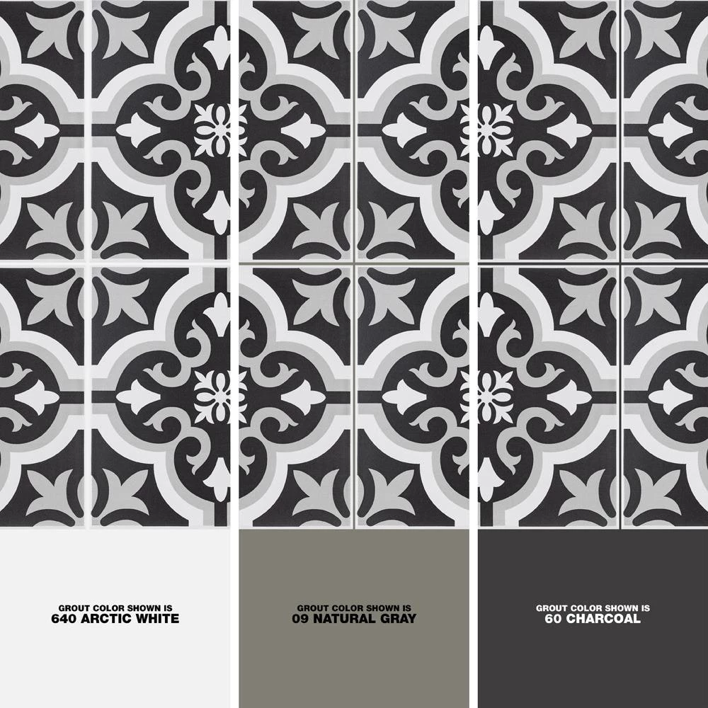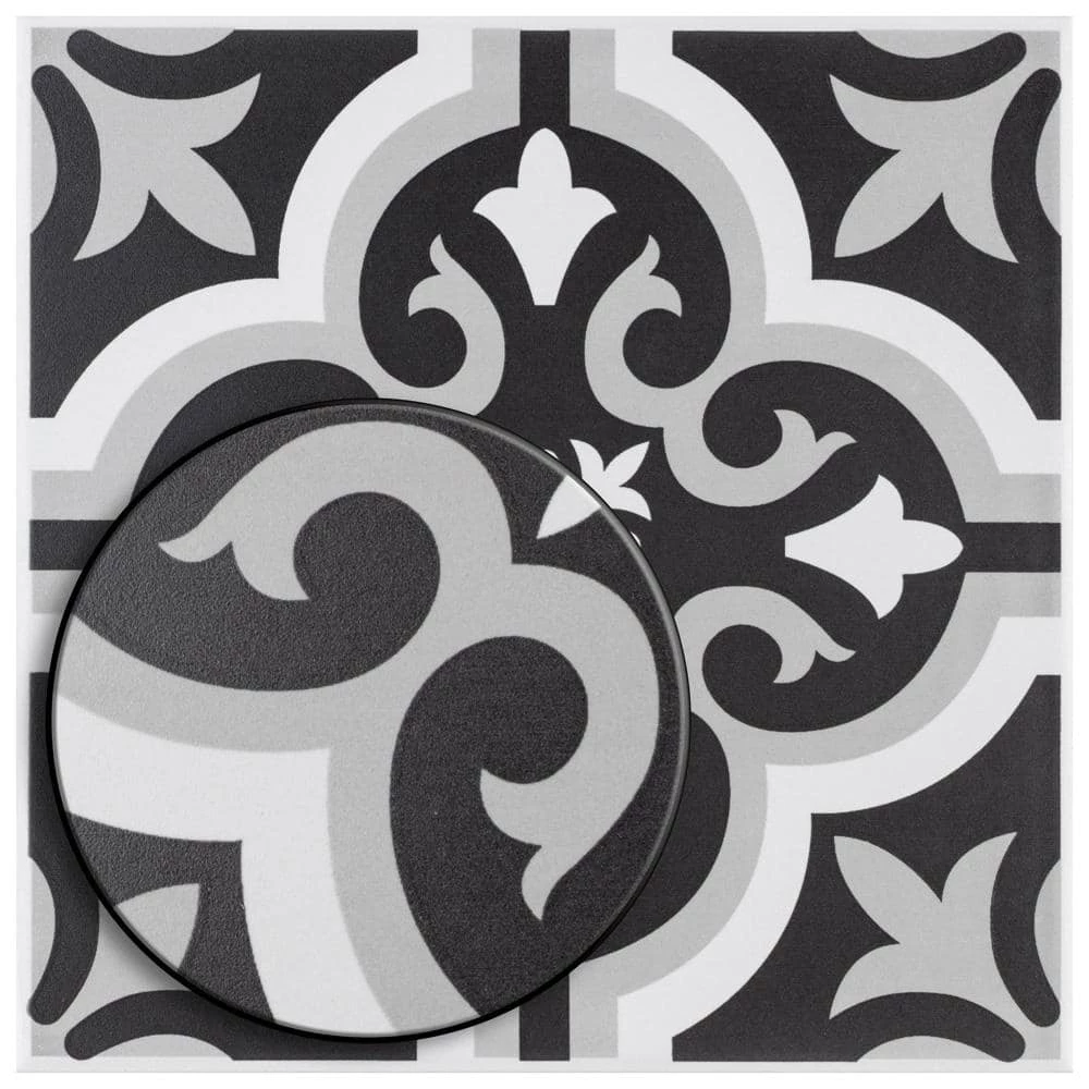 Capturing the beauty of artisanal cement tile, our Merola Tile Braga Classic II Encaustic 7-3/4 in. x 7-3/4 in. Ceramic Floor and Wall Tile is a gorgeous tribute to encaustic design. Set on a charcoal black base glaze, this tile features floral old-world patterns that frame dueling arcs at the center in varying shades of white and ash gray, offering contrast and dimension to the decoration. With a floral, geometric pattern and slightly textured surface, this tile adds a unique touch that can blend into virtually any design theme, ranging from modern projects to traditional installations. This tile is an excellent choice for most interior installations, including showers, kitchens and backsplashes. Tile is the better choice for your space. This tile is made from natural ingredients, making it a healthy choice as it is free from allergens, VOCs, formaldehyde and PVC.