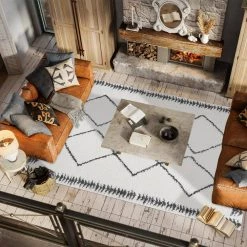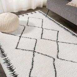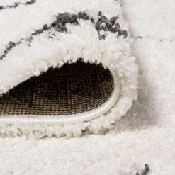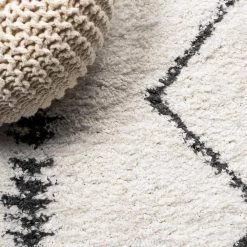 Inspired by vintage Beni Ourain Moroccan rugs, our soft and fluffy shag yarns make it easy to go barefoot. The classic Moroccan pattern has deep black diamonds and trees on a field of ivory. Anchor your Bohemian space; add softness to a bedroom, living room, or cozy reading nook; this is a low-pile shag rug with timeless style.