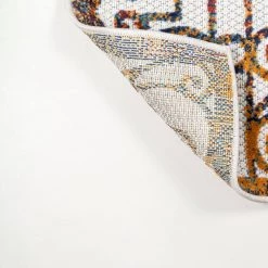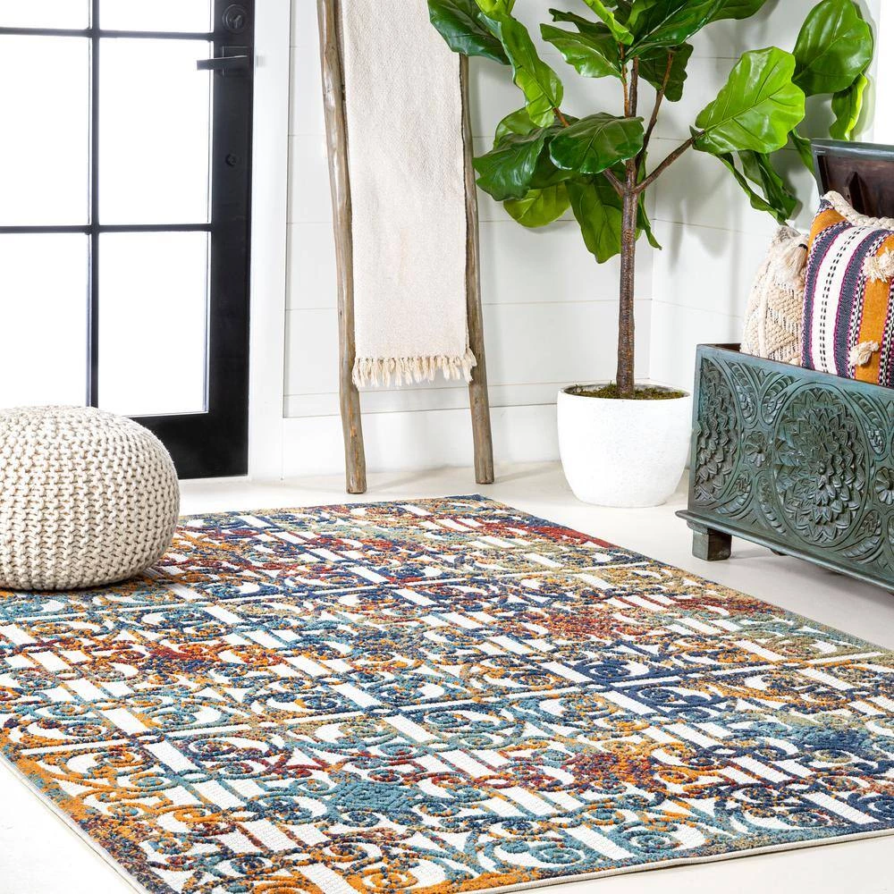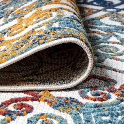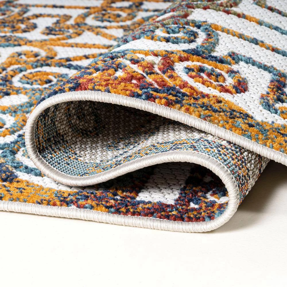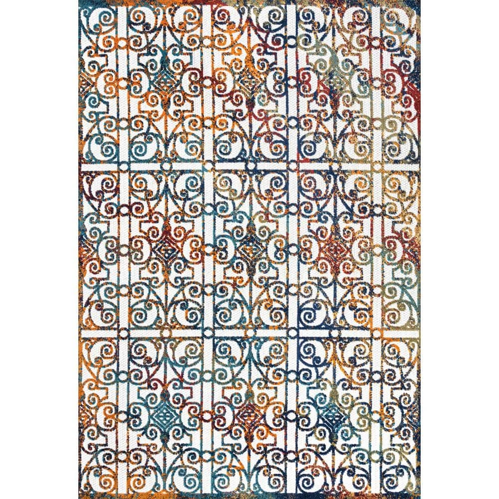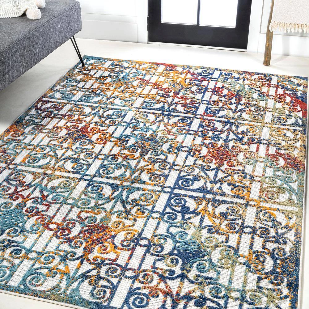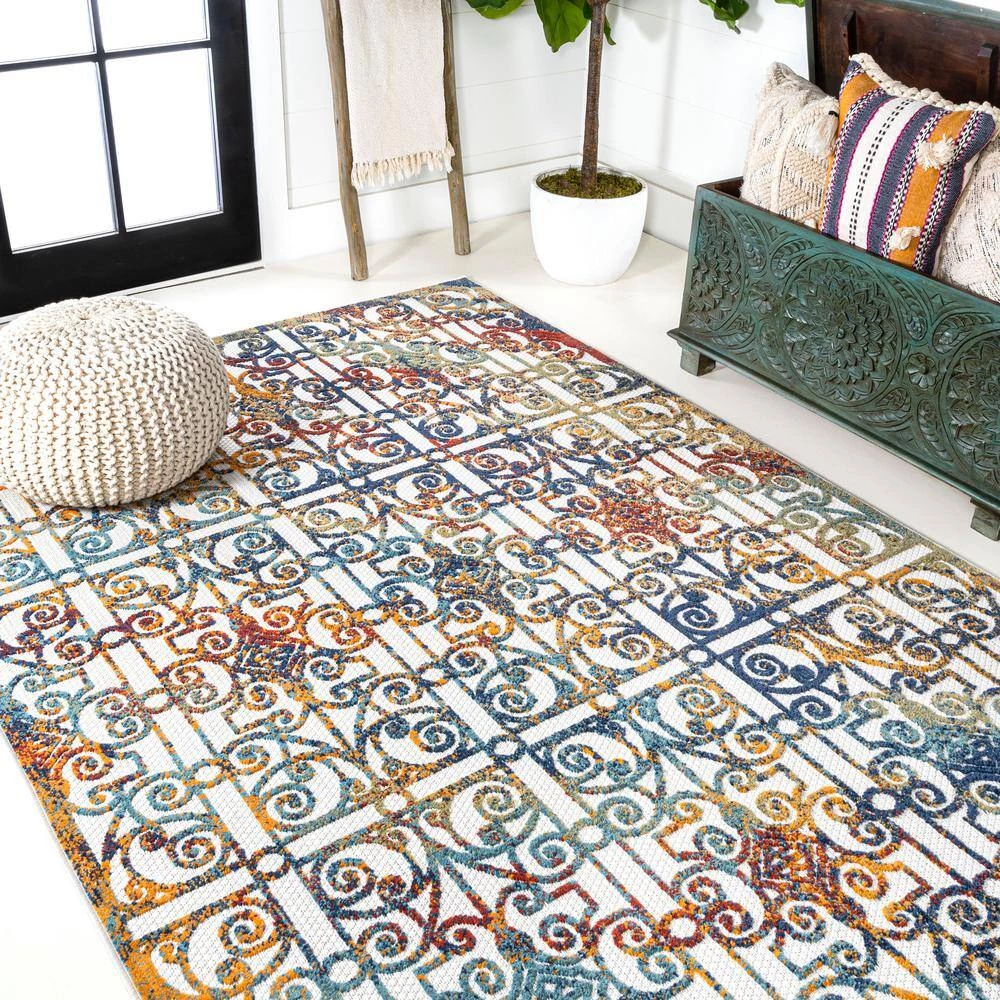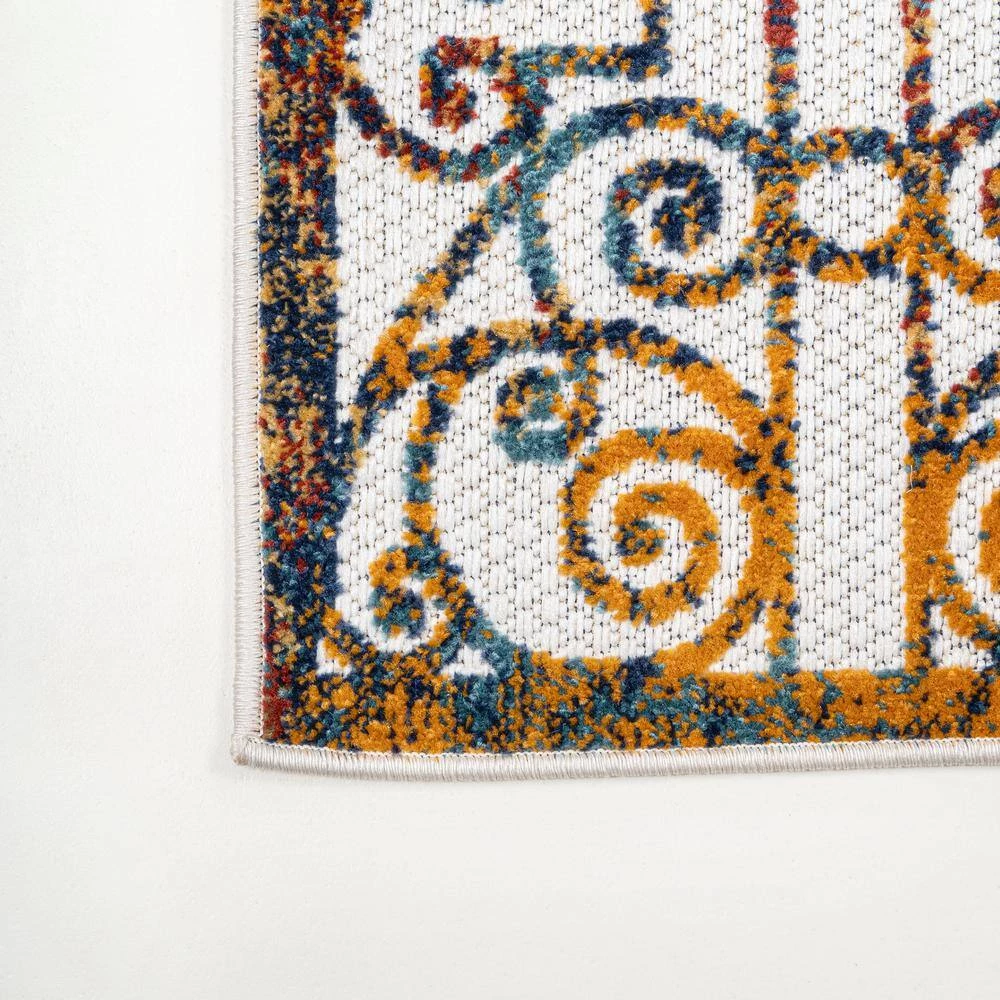 Inspired by scrolling Mediterranean wrought iron, this indoor-outdoor rug will cheer up a kitchen, living room, bedroom or dining room. The multicolored design is an easy maintenance solution for homes with kids and pets. Outdoors, this rug adds a splash of color and Bohemian style to your patio or porch.