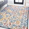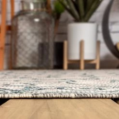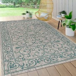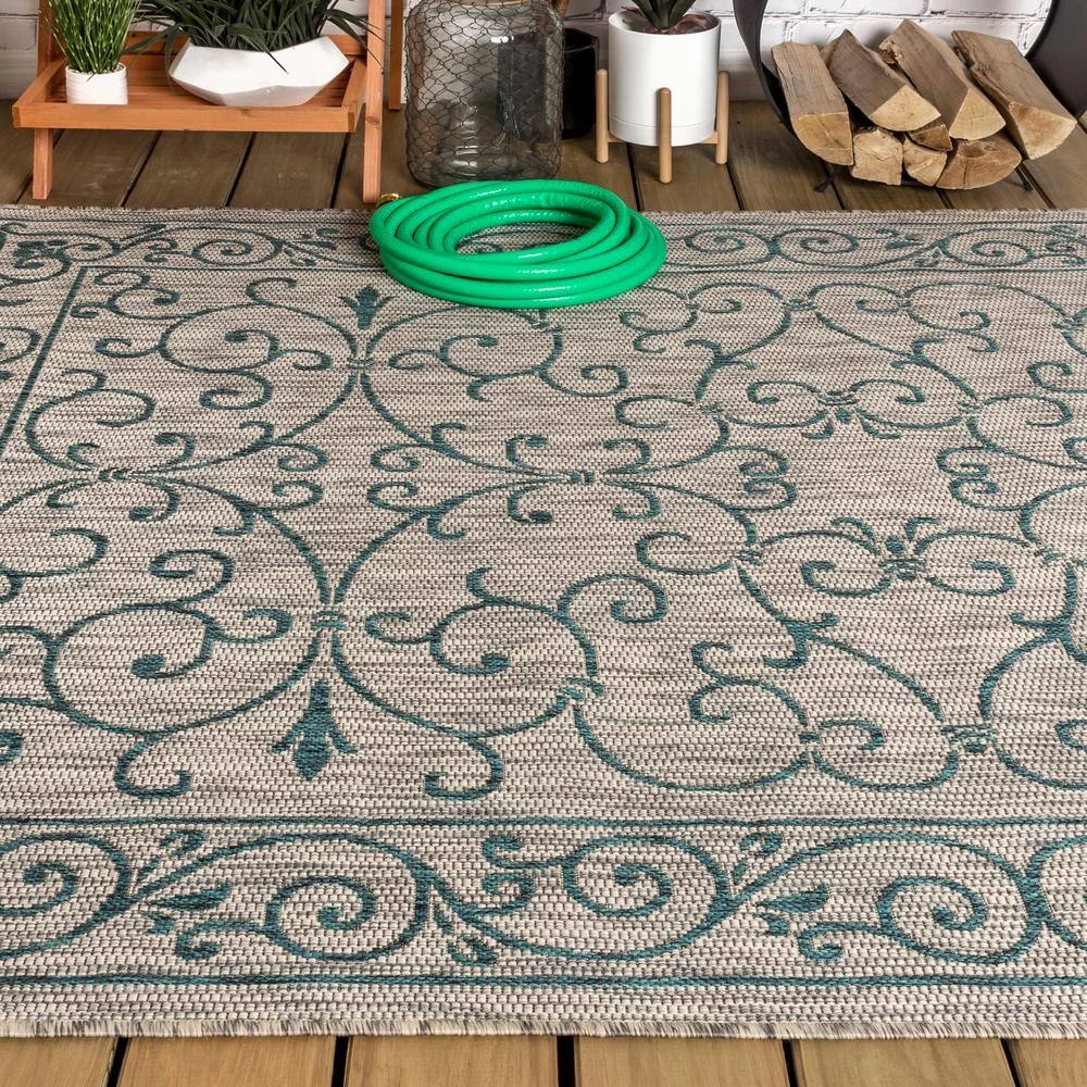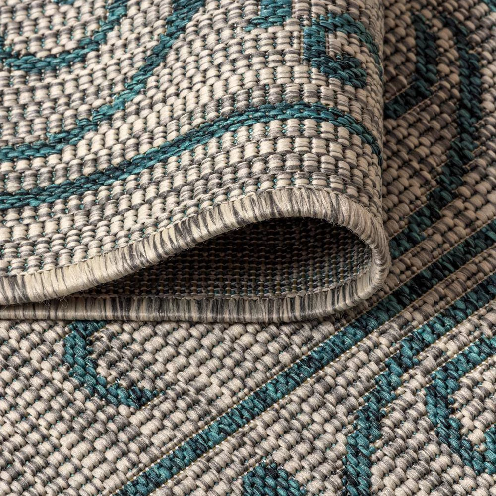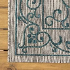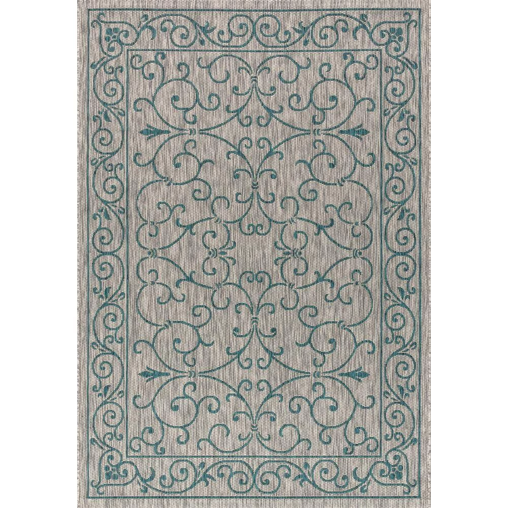 With a filigree design reminiscent of antique iron gates, our Boho-chic rug adds eclectic style to an outdoor porch or patio. Varied tones of gray and ivory mingled with a deep teal blue pattern give this rug a hand-woven, vintage vibe. The flatweave design is great for high-traffic spaces indoors too.