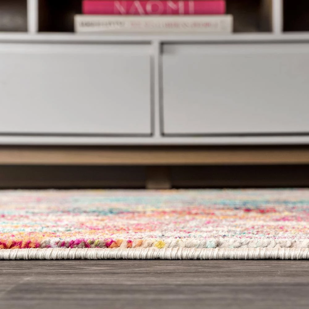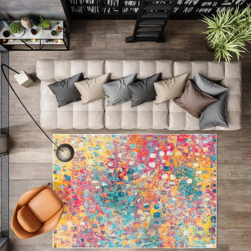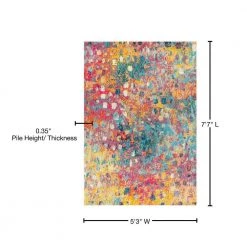 Dabs of colorful paint on canvas inspired this gorgeous rug – an artistic masterpiece – for your floors. Like a bed of spring flowers, the gold, blue, pink, aqua, cream, and yellow polypropylene yarns come together to create a fresh, feminine look that will liven any decor. Power loomed for durability, it won’t only stand out but will also withstand cleaning, high traffic, and the occasional spill.