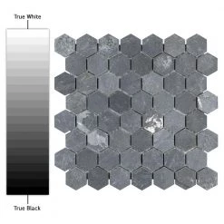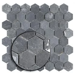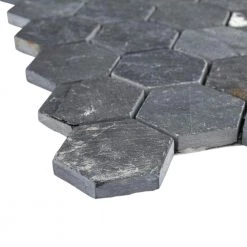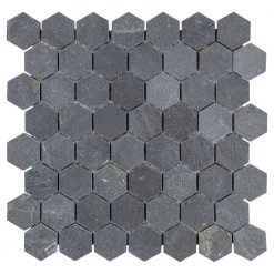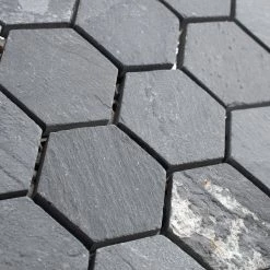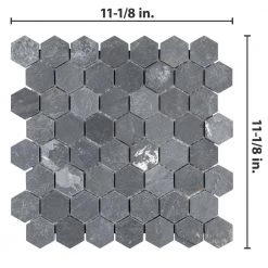 The Merola Tile Crag Hexagon Black 11-1/8 in. x 11-1/8 in. x 8 mm Slate Mosaic Tile is a dramatically colored adaptation of a classic hex pattern. The solid-slate tile sports all the natural striations and individuality within the stone, all in that familiar deep gray-black hue. This hardy tile is impervious to water and even offer frost resistance for exterior work. Its optimal versatility in use and color makes it a fantastic choice for your installation.