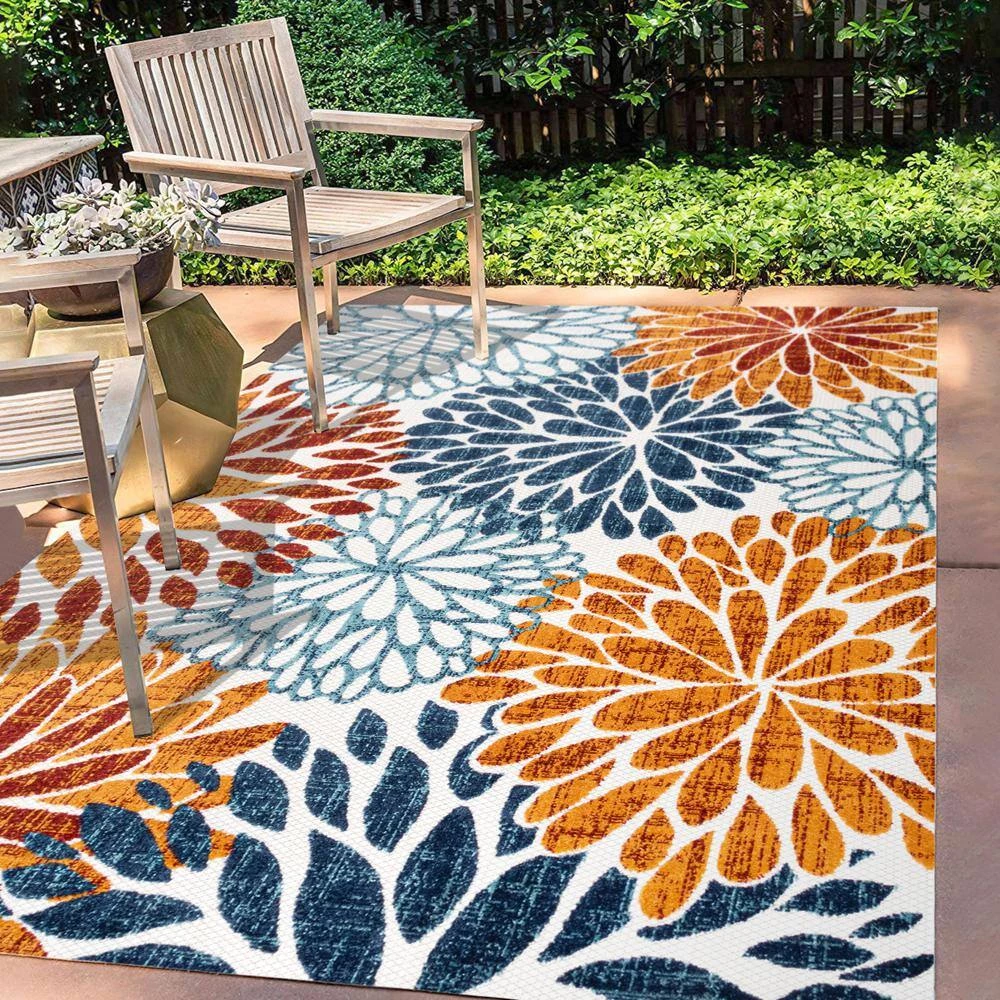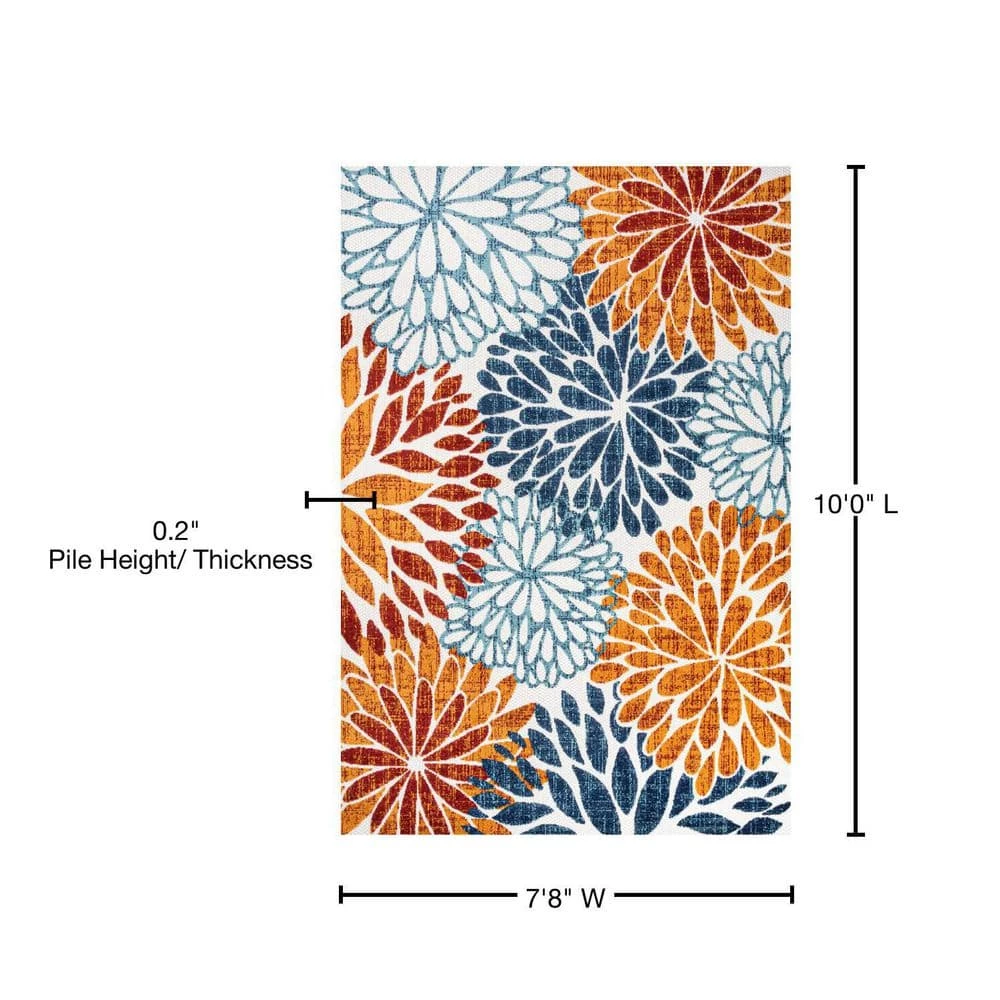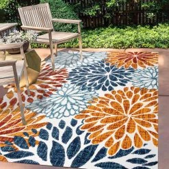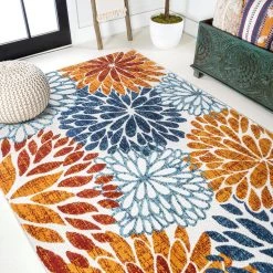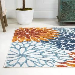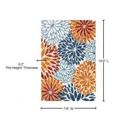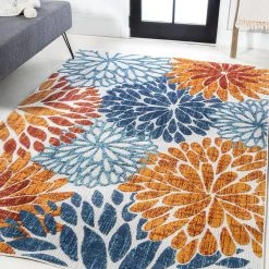 With its splashy, modern floral pattern in blue and orange, this indoor-outdoor rug has a fresh look that’s ideal for a family room, dining room, bedroom, or kids’ rooms. Soft, durable synthetic fibers are an easy maintenance solution for homes with kids and pets. Choose from several colorways and add a splash of style to your porch or patio.