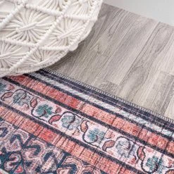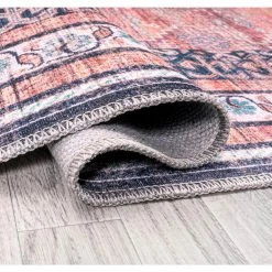 The diamond-shaped medallion in the center of this rug’s design recalls vintage Persian rugs with their vibrant color palettes. A geometric border adds to the vintage charm. This pet friendly rug is forgiving of spills and easy to care for; it’s a versatile classic perfect for a dining room, living room, kitchen, bedroom, or porch.