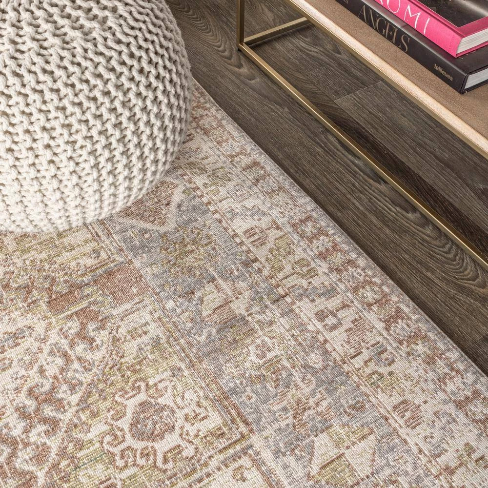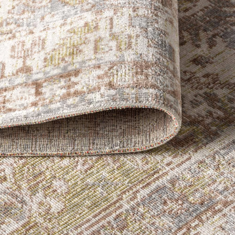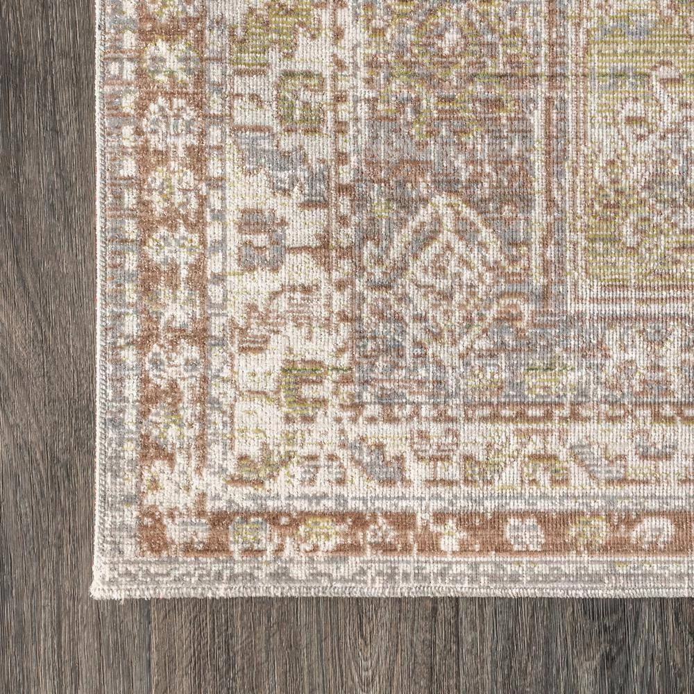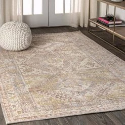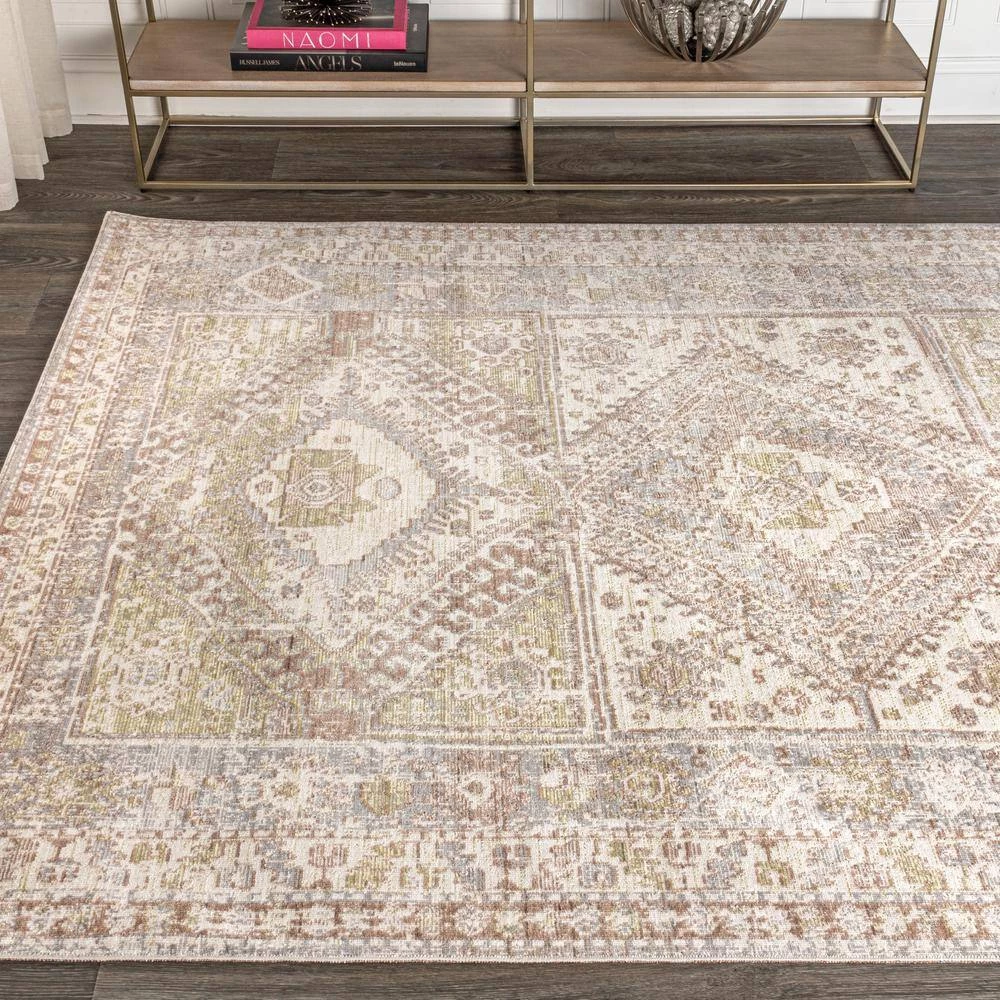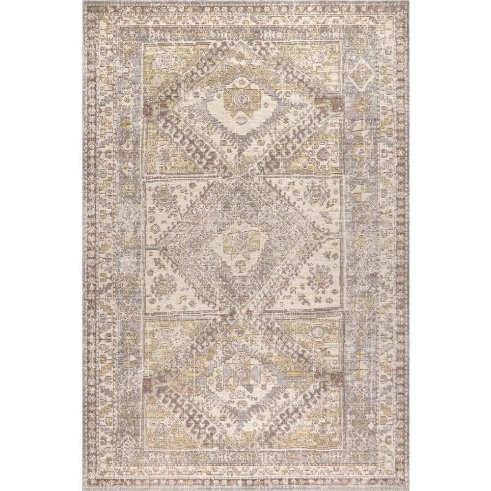 Three diamond-shaped medallions in the center of this design recall Moroccan tribal rugs. The neutral gray color scheme adds a modern twist. With its Bohemian-inspired, distressed look, this rug would be perfect for a dining room, living room, entry or bedroom.