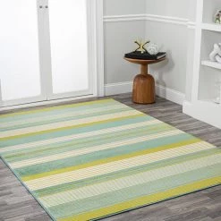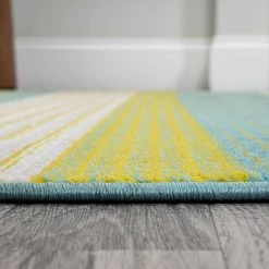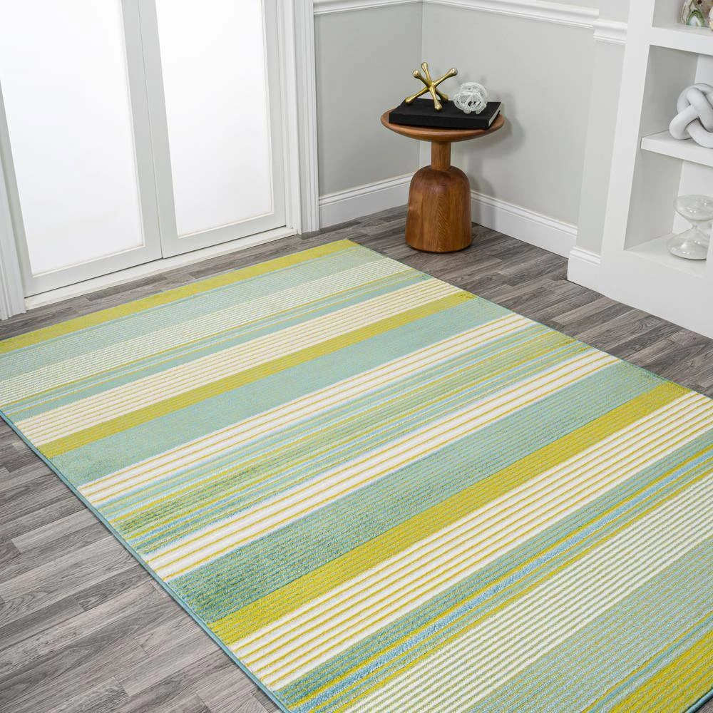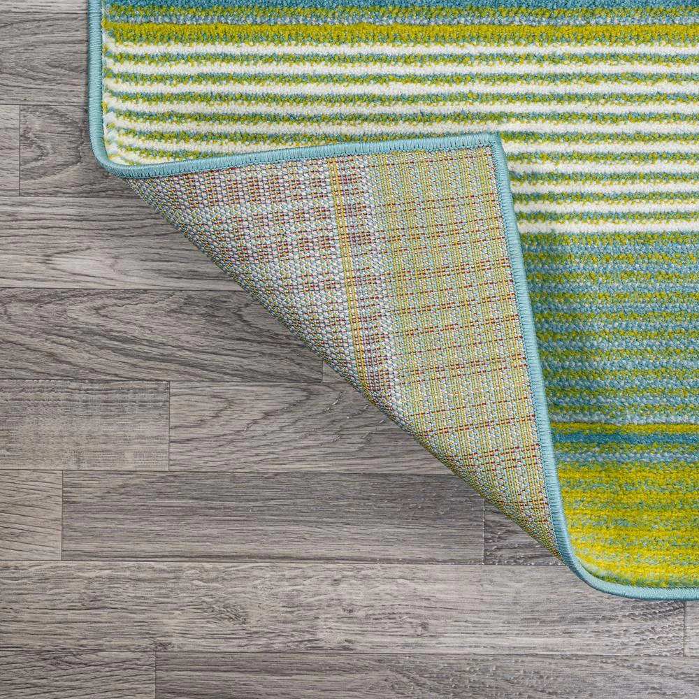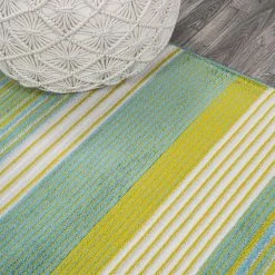 - Shades of teal, aqua and lime green create gradient stripes that are accented by gray and ivory
