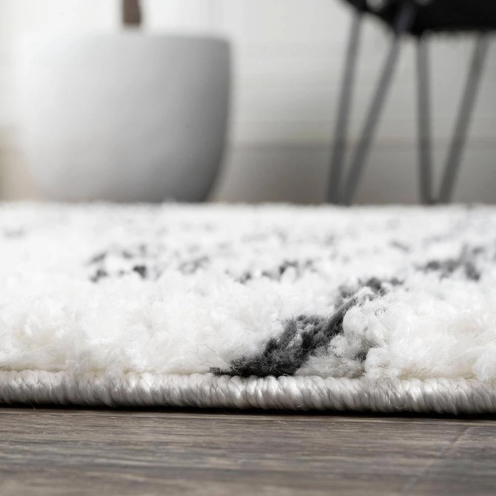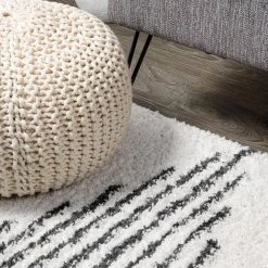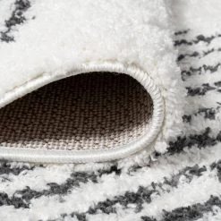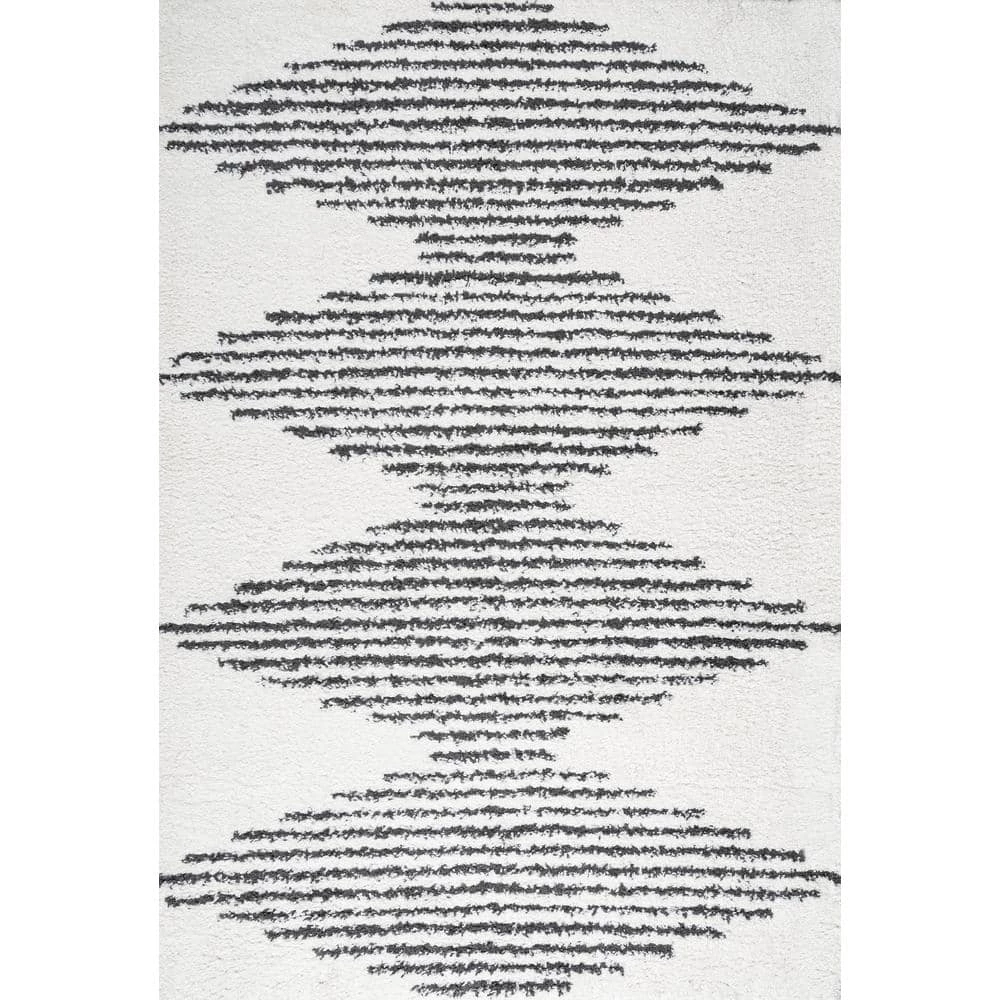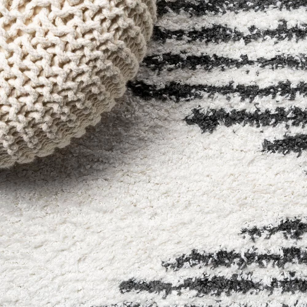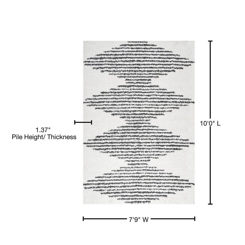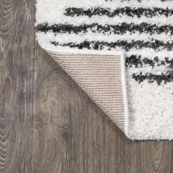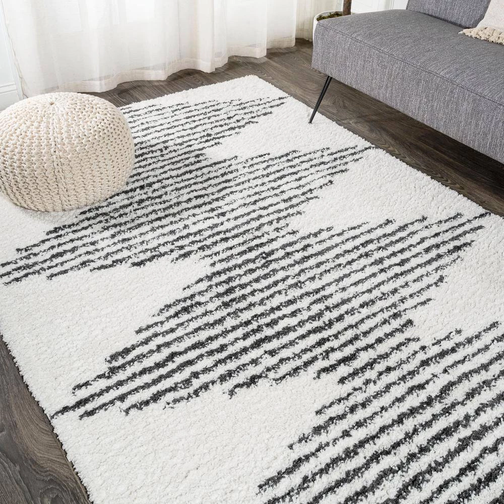 Inspired by Moroccan rugs, our modern striped rug has a soft, low shag pile. The geometric pattern is woven in black on an ivory background; our diamond stripe design has mid-century flair. Add graphic punch to your living room, bedroom, or reading nook with this easy-care rug.
