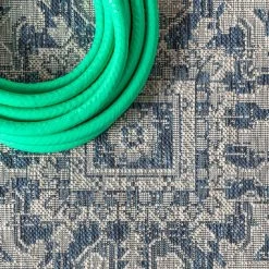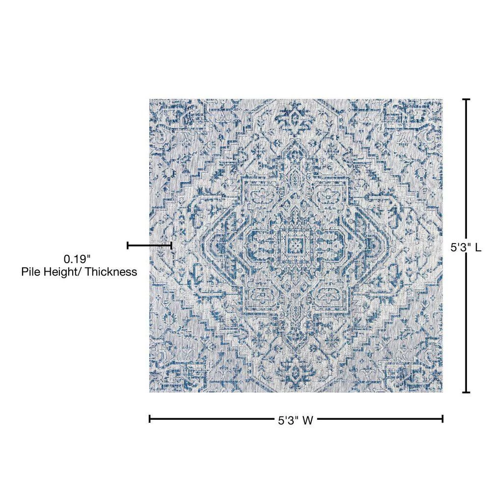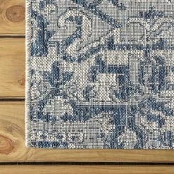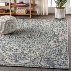 With its star-inspired medallion, this borderless rug adds dreamy Bohemian style to an outdoor porch or patio. Varied tones of navy and blue on a mingled gray background give this rug a hand-woven, vintage vibe. The flatweave design is great for high-traffic spaces indoors too.
