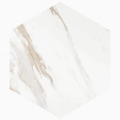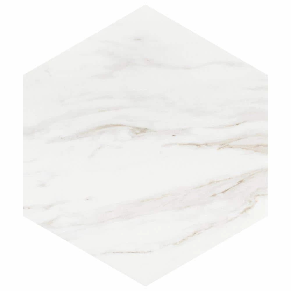 The Merola Tile Eterno Carrara Hex 8-5/8 in. x 9-7/8 in. Porcelain Floor and Wall Tile features a smooth, medium sheen. Meant to capture the appearance of classic Carrara marble, this marbleized porcelain tile offers this timeless look in a durable, easy to maintain option. This hexagonal tile is perfect for any setting, traditional enough for historical renovations or modern enough for new construction. Being impervious to water, these tiles are ideal for backsplashes and even offer frost resistance for some exterior work. Use these alone or mix and match with other products to create your own custom look.