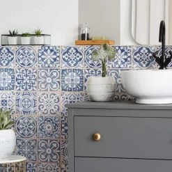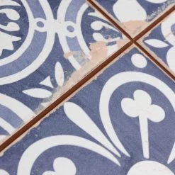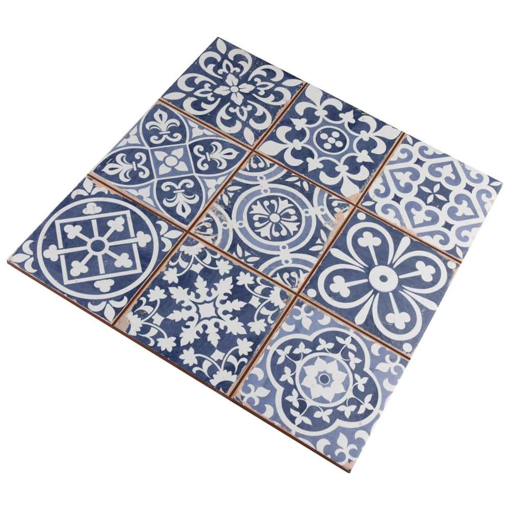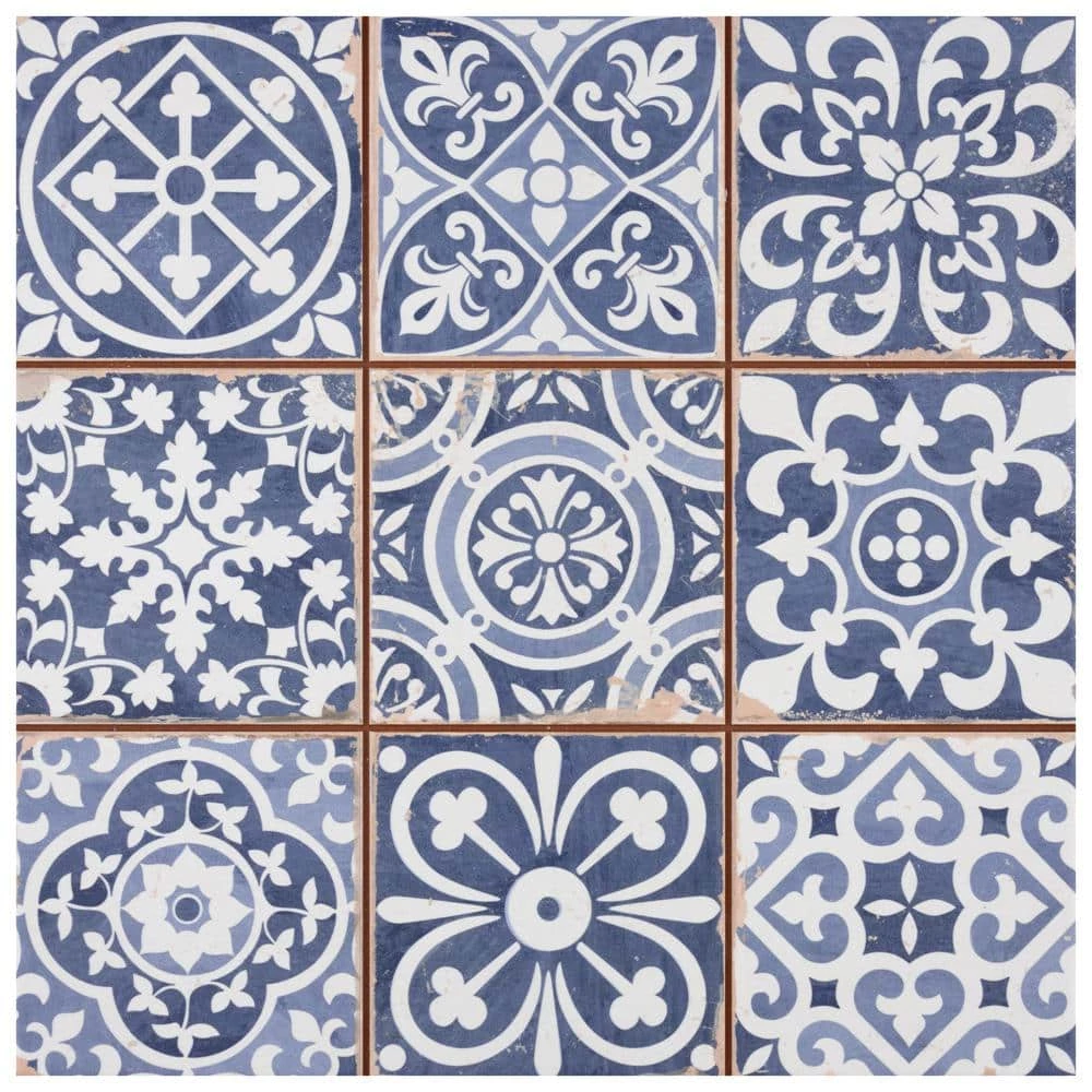 It is easy to picture sun-drenched streets of Spain when looking at the Merola Tile Faenza Azul Encaustic 13 in. x 13 in. Ceramic Floor and Wall Tile. Save time and labor spent arranging smaller square tiles and instead install these durable ceramic slabs, which have nine squares separated by scored grout lines. This breathtaking blue glaze features a collection of encaustic-inspired designs. Imitations of the scuffs and spots that are the marks of well-loved, worn, century-old tile and the rich red tones peeking through are the perfect contrast to the faded shades of denim blue. These rustic scuffs and spots convince that this tile is truly aged. There are 3 different variations of scuffs and pattern arrangements available that are randomly scattered throughout each case, offering a sporadic patchwork look. Designed by interior architect and furniture designer Francisco Segarra, this tile is a true reflection of vintage industrial design. The scored grout lines can be grouted with the color of your choice or left ungrouted for a rugged finish. Bring rustic charm to your interior with this easy-to-maintain look.