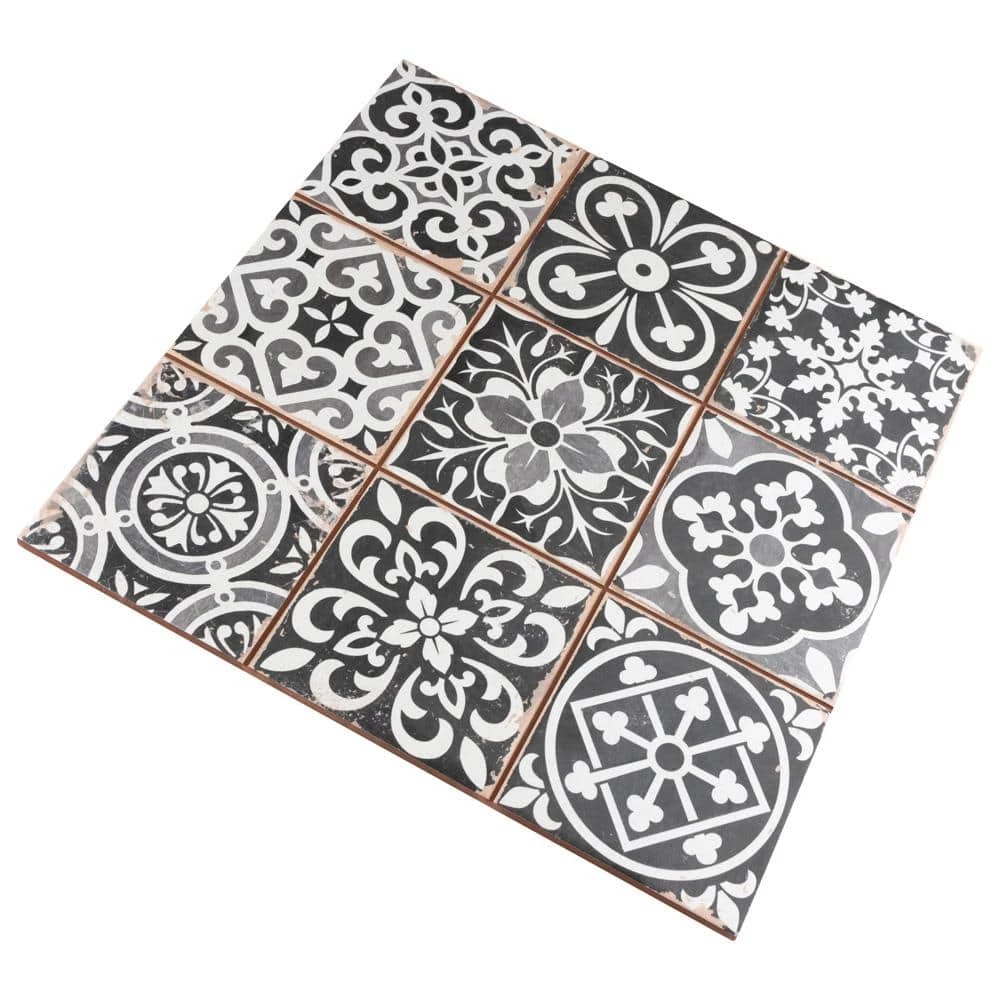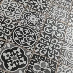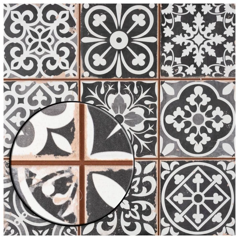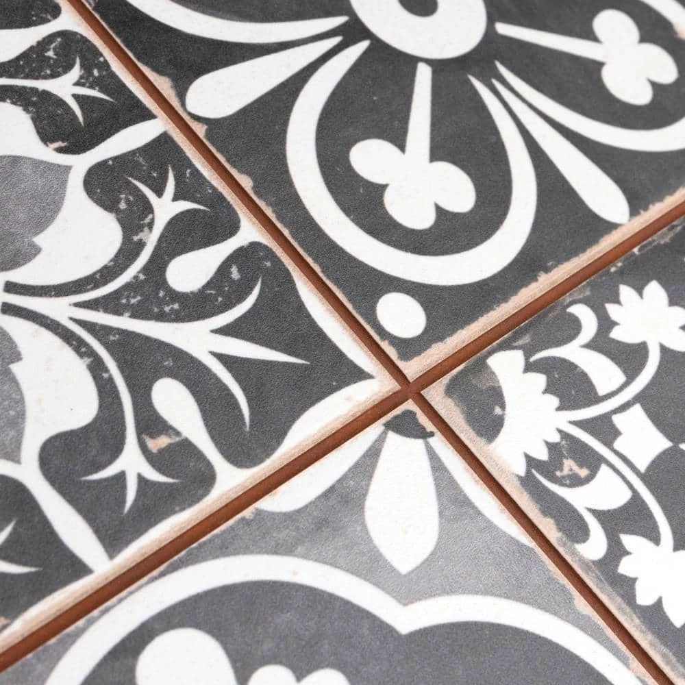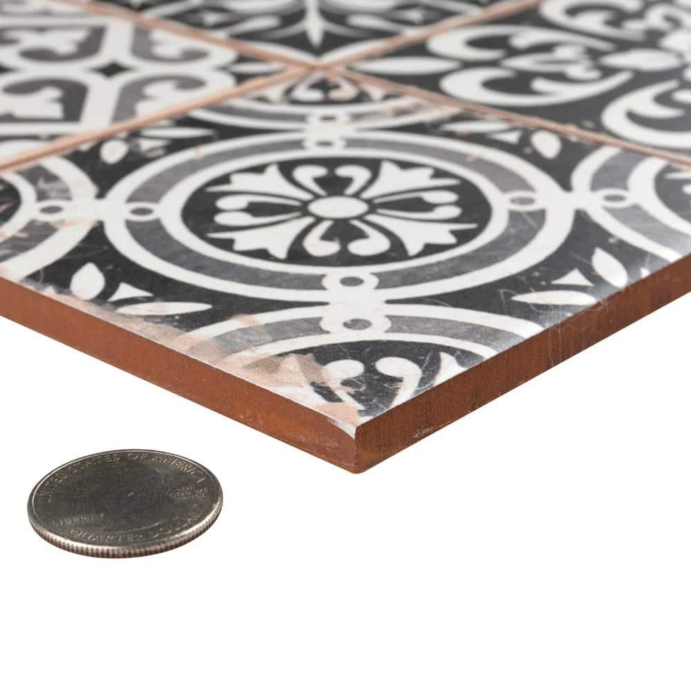 Bring new life to your floors with the Merola Tile Faenza Nero Encaustic 13 in. x 13 in. Ceramic Floor and Wall Tile. Unlike smaller tiles, these durable ceramic tiles have nine squares separated by scored grout lines, so you spend less time on installation. Imitation scuffs and spots mimic the look of century-old tile, giving it an aged appearance. Rich red tones peek through faded grays and black and provide a stylish contrast. Three variations of pattern arrangements are randomly scattered throughout each case, giving it a patchwork look. Designed by furniture designer and interior architect Francisco Segarra, this tile is perfect for vintage or industrial decor.