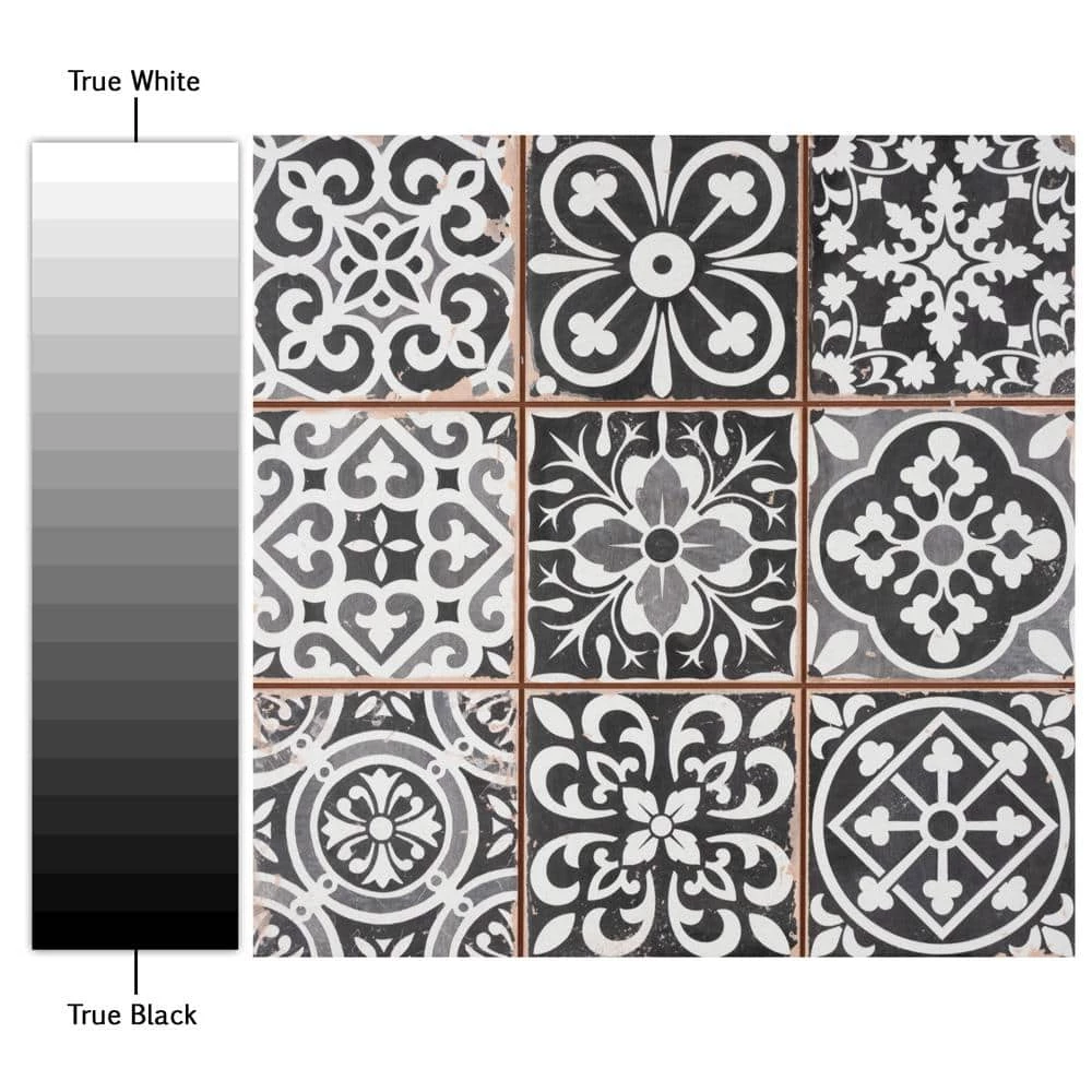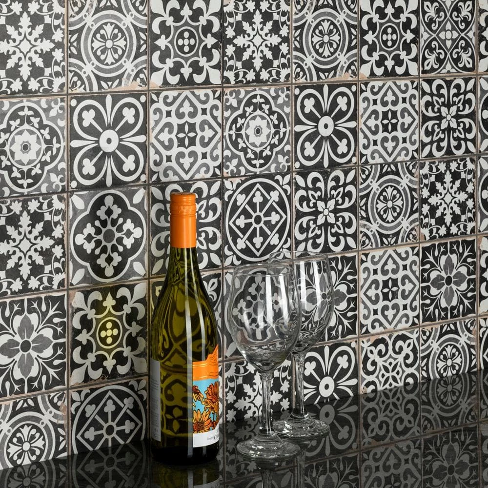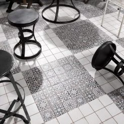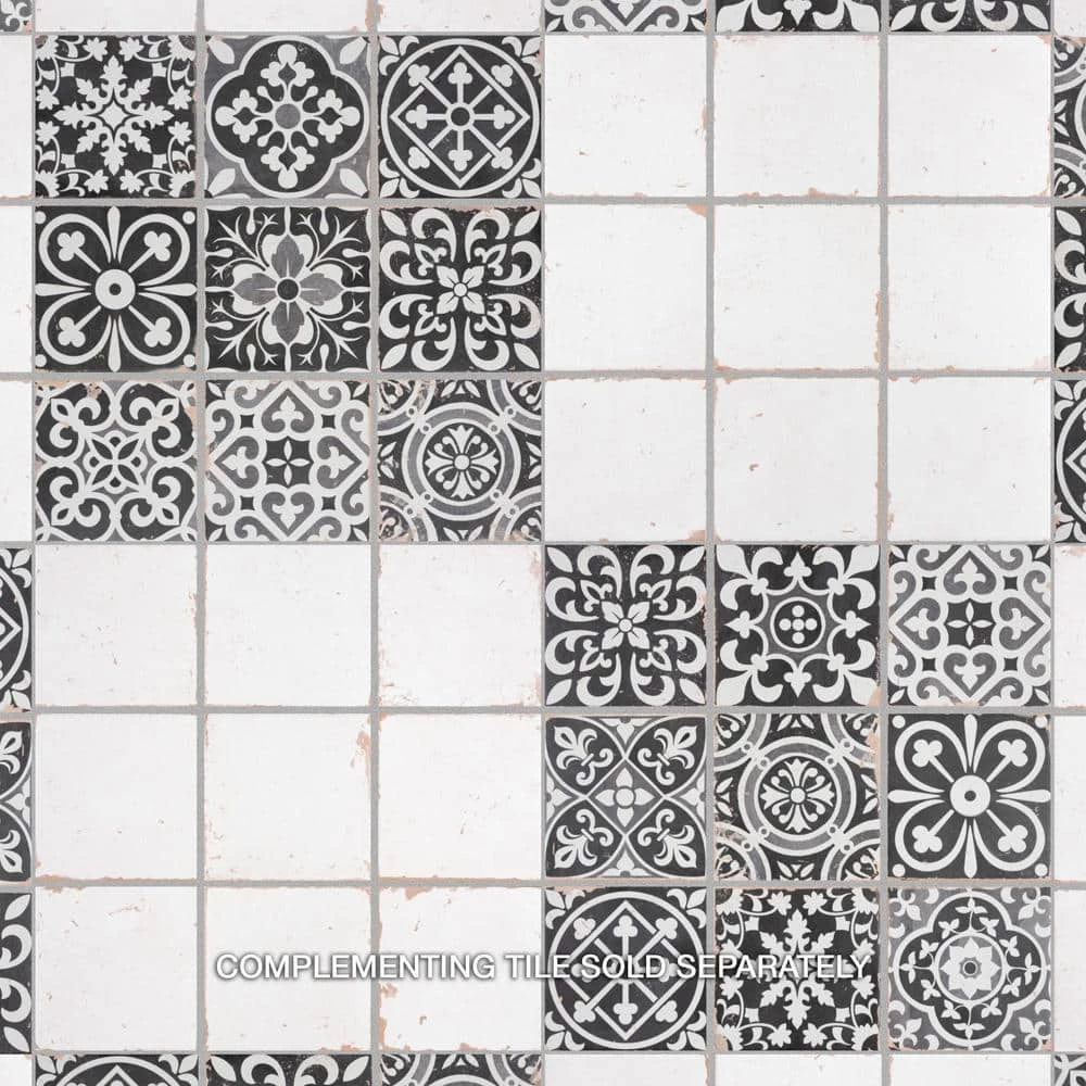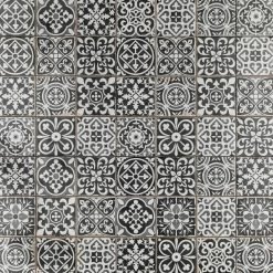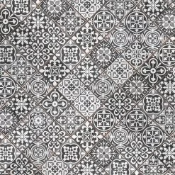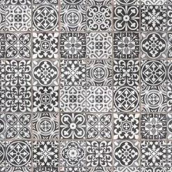 Bring new life to your floors with the Merola Tile Faenza Nero Encaustic 13 in. x 13 in. Ceramic Floor and Wall Tile. Unlike smaller tiles, these durable ceramic tiles have nine squares separated by scored grout lines, so you spend less time on installation. Imitation scuffs and spots mimic the look of century-old tile, giving it an aged appearance. Rich red tones peek through faded grays and black and provide a stylish contrast. Three variations of pattern arrangements are randomly scattered throughout each case, giving it a patchwork look. Designed by furniture designer and interior architect Francisco Segarra, this tile is perfect for vintage or industrial decor.