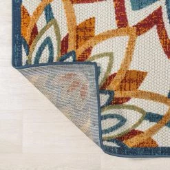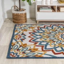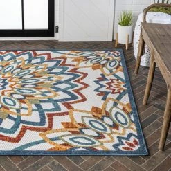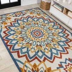 This rug’s jewel colors and bold mandala-inspired pattern add a Bohemian touch to your modern cottage. With its kid-friendly busy pattern, our textured rug is ideal for a kitchen, living room, den, bedroom or entry. The large geometric central medallion and rich colors give this easy-care rug its unique style.