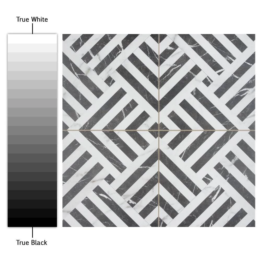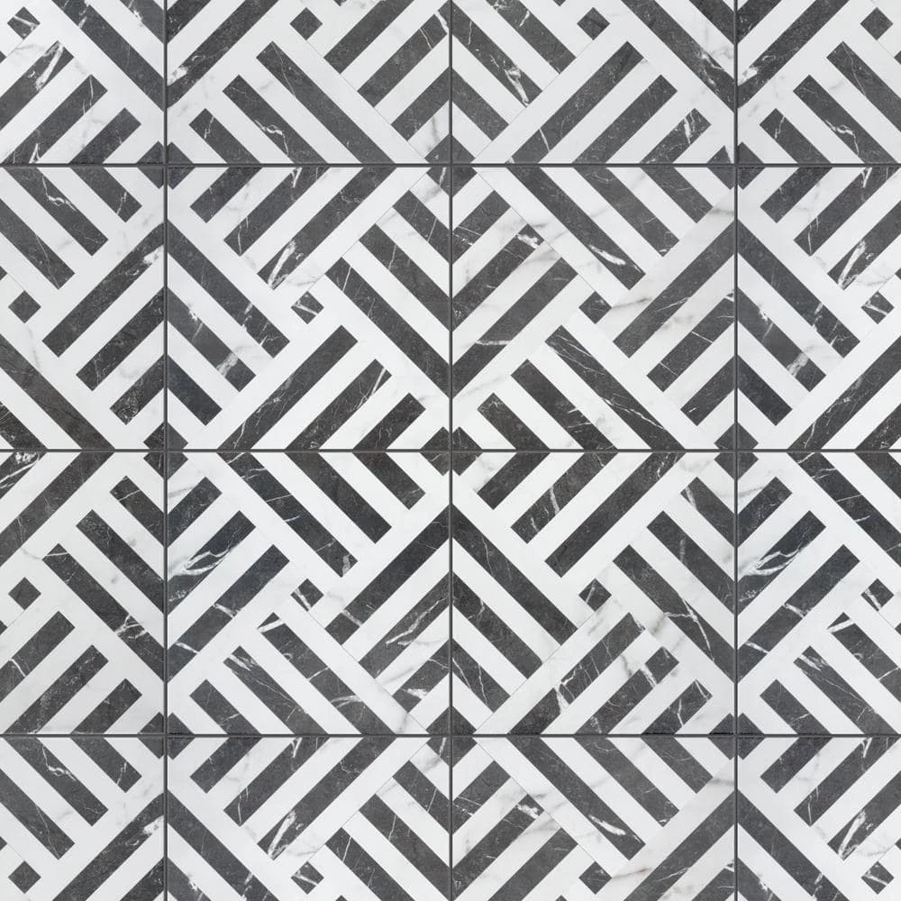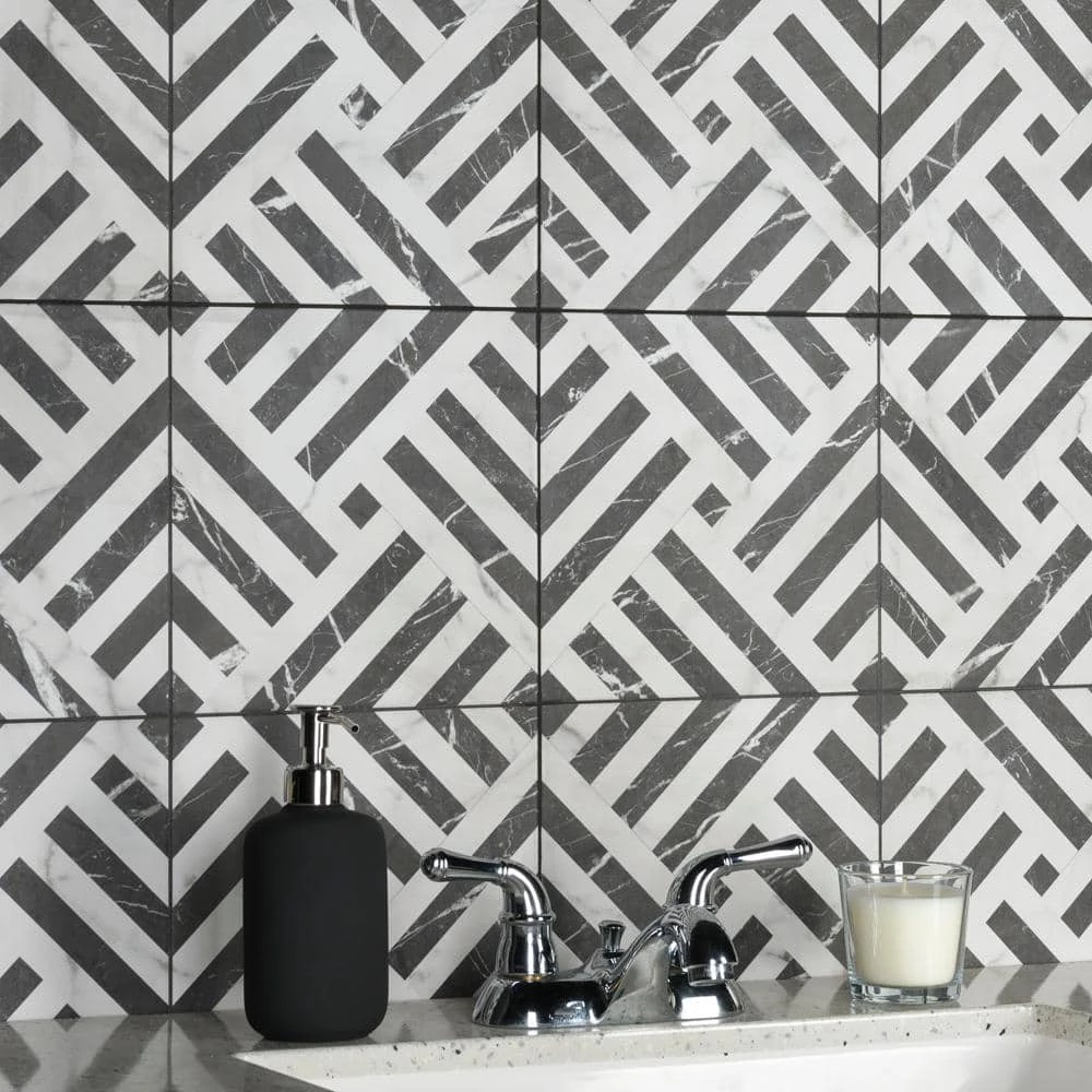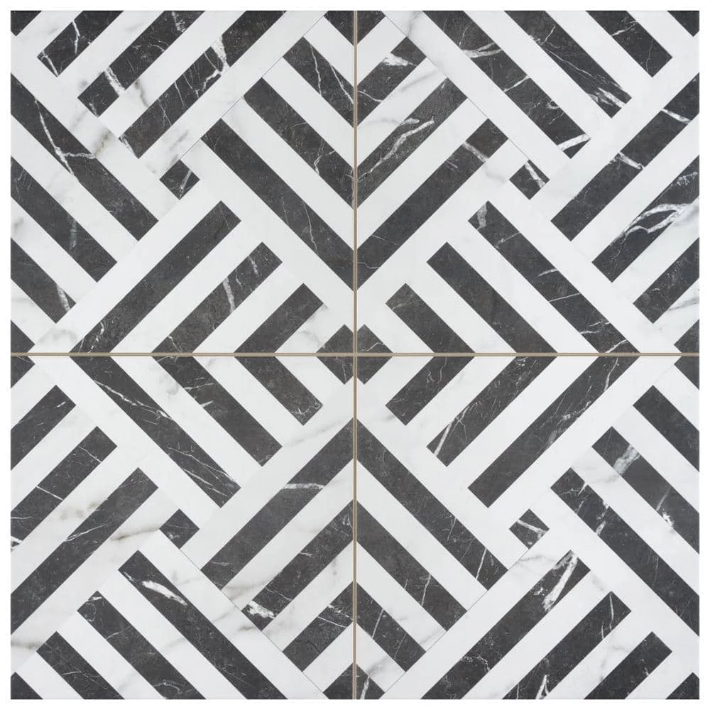 Emulating the timeless beauty of marble, our Gatzby 17-3/4 in. x 17-3/4 in. Porcelain Floor and Wall Tile offers elegance and glamour with striking decorative appeal. This square tile transforms any space into a work of art through sharp linear patterns that diagonally intertwine to create captivating designs reminiscent of extravagant art deco style. A smooth, matte white glaze is complemented with stormy grey veining, which varies per tile for added authenticity. The opposing charcoal black lines are accented with white veining as well, offering balance to the contrasting colors. With a classic monochromatic color palette and marble-look finish, this bold geometric floor and wall tile creates an effortless statement in any space. Save time and labor spent arranging smaller square tiles and instead install these durable porcelain slabs, which have four squares separated by scored grout lines. The scored grout lines can be grouted with the color of your choice to further customize your installation. Its impervious, frost-resistant and durable features make this an ideal tile for both commercial and residential indoor and outdoor installations including, kitchens, bathrooms, backsplashes, showers, entryways and patios. Tile is the better choice for your space. This tile is made from natural ingredients, making it a healthy choice as it is free from allergens, VOCs, formaldehyde and PVC.