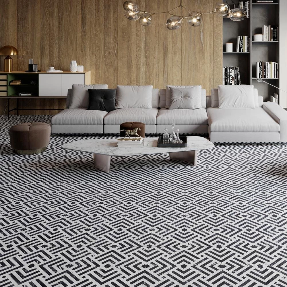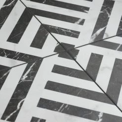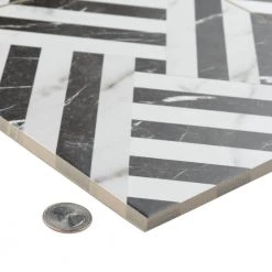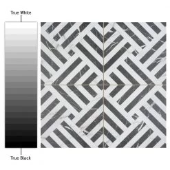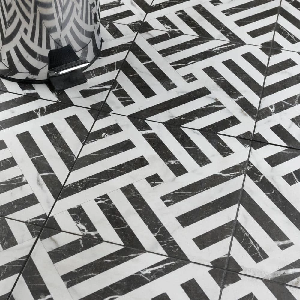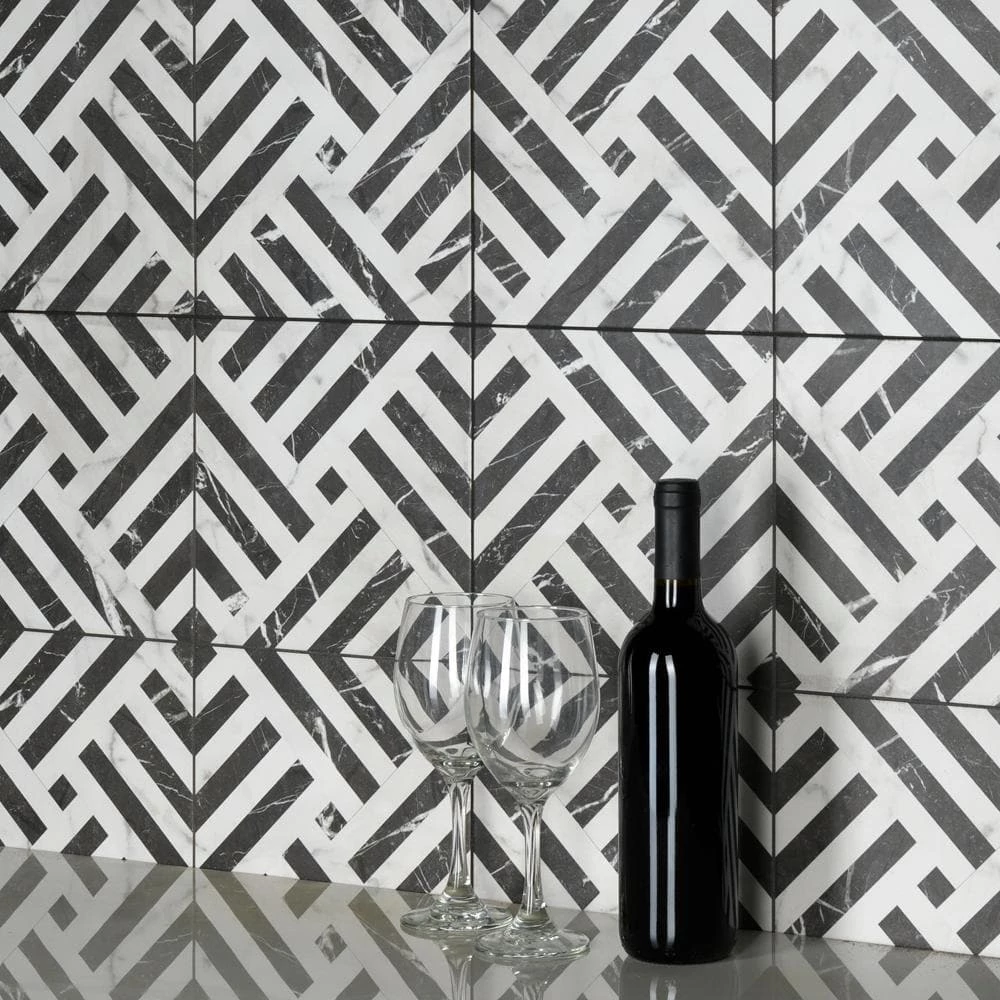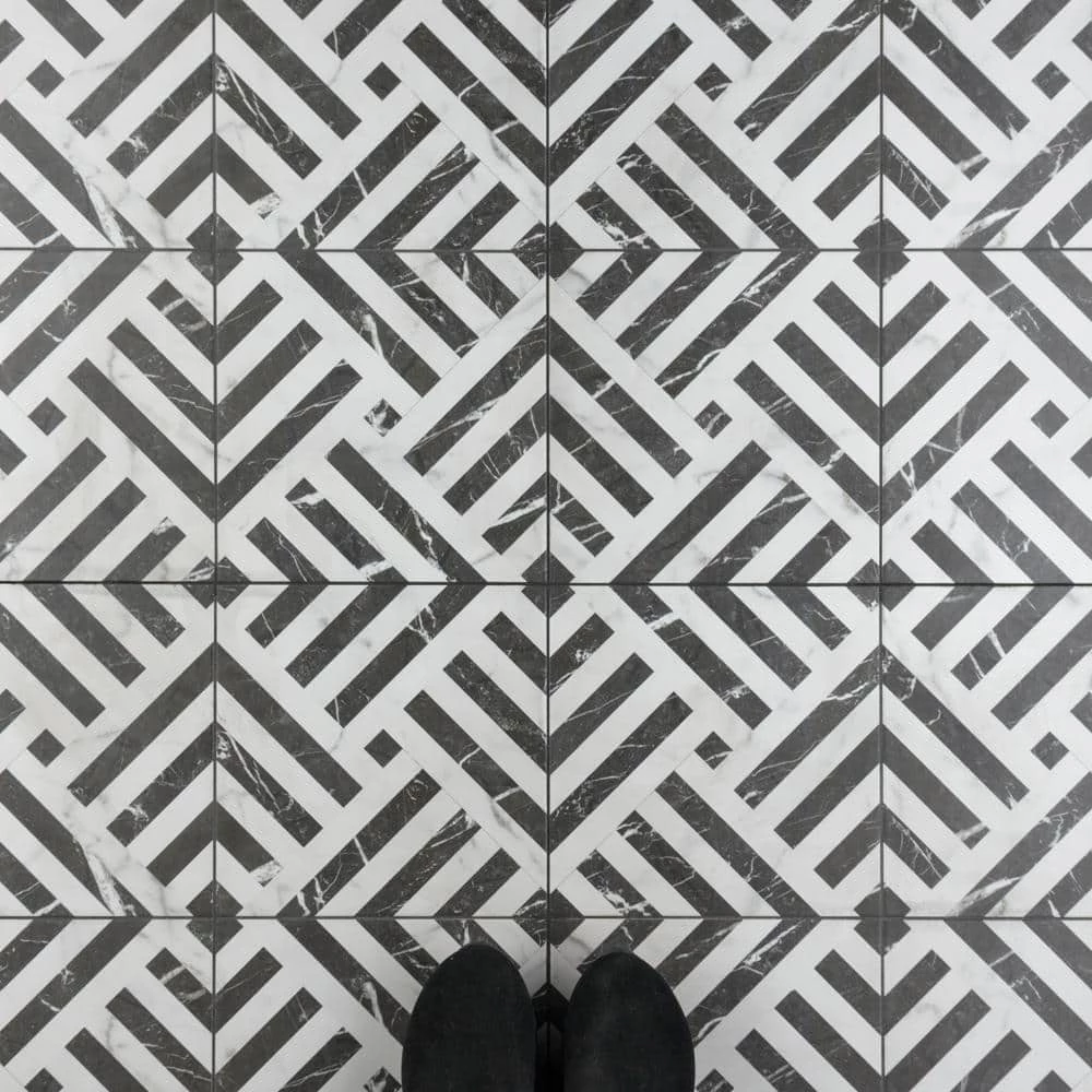Emulating the timeless beauty of marble, our Gatzby 17-3/4 in. x 17-3/4 in. Porcelain Floor and Wall Tile offers elegance and glamour with striking decorative appeal. This square tile transforms any space into a work of art through sharp linear patterns that diagonally intertwine to create captivating designs reminiscent of extravagant art deco style. A smooth, matte white glaze is complemented with stormy grey veining, which varies per tile for added authenticity. The opposing charcoal black lines are accented with white veining as well, offering balance to the contrasting colors. With a classic monochromatic color palette and marble-look finish, this bold geometric floor and wall tile creates an effortless statement in any space. Save time and labor spent arranging smaller square tiles and instead install these durable porcelain slabs, which have four squares separated by scored grout lines. The scored grout lines can be grouted with the color of your choice to further customize your installation. Its impervious, frost-resistant and durable features make this an ideal tile for both commercial and residential indoor and outdoor installations including, kitchens, bathrooms, backsplashes, showers, entryways and patios. Tile is the better choice for your space. This tile is made from natural ingredients, making it a healthy choice as it is free from allergens, VOCs, formaldehyde and PVC.
