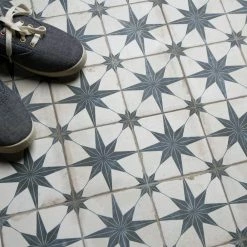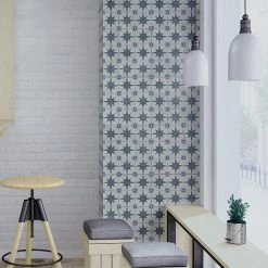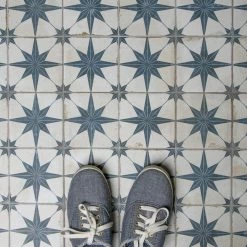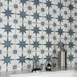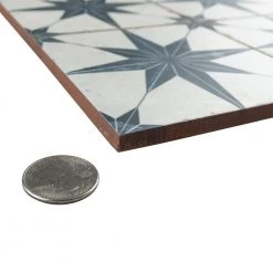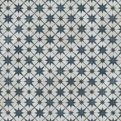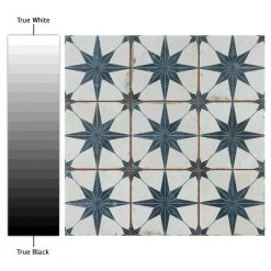 Our Harmonia Kings Star Blue 13 in. x 13 in. Ceramic Floor and Wall Tile creates the look of a stunning leading-edge mosaic-like design with the harmonious, easy installation of a square tile. Inspired by our best-selling Kings Star Blue, this ceramic encaustic-inspired tile similarly features a unique, low-sheen glaze in faded antique white tones with centered denim blue star patterns in each square. With realistic imitations and scuffs and spots that are the marks of well-loved, worn, century-old tile, this floor and wall tile is a true reflection of vintage industrial design. These scuffs and spots convince that this tile is truly aged, bringing rustic charm to any interior setting. Save time and labor spent arranging mosaic sheets and instead install these durable ceramic slabs, which have squares separated by scored grout lines. The scored grout lines can be grouted with the color of your choice to further customize your installation. Its glazed and durable features make it an ideal choice for both commercial and residential indoor installations including kitchens, bathrooms, backsplashes, showers, and entryways. Tile is the better choice for your space. This tile is made from natural ingredients, making it a healthy choice as it is free from allergens, VOCs, formaldehyde and PVC.