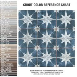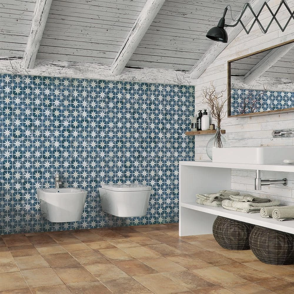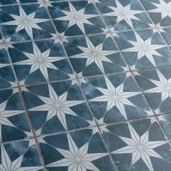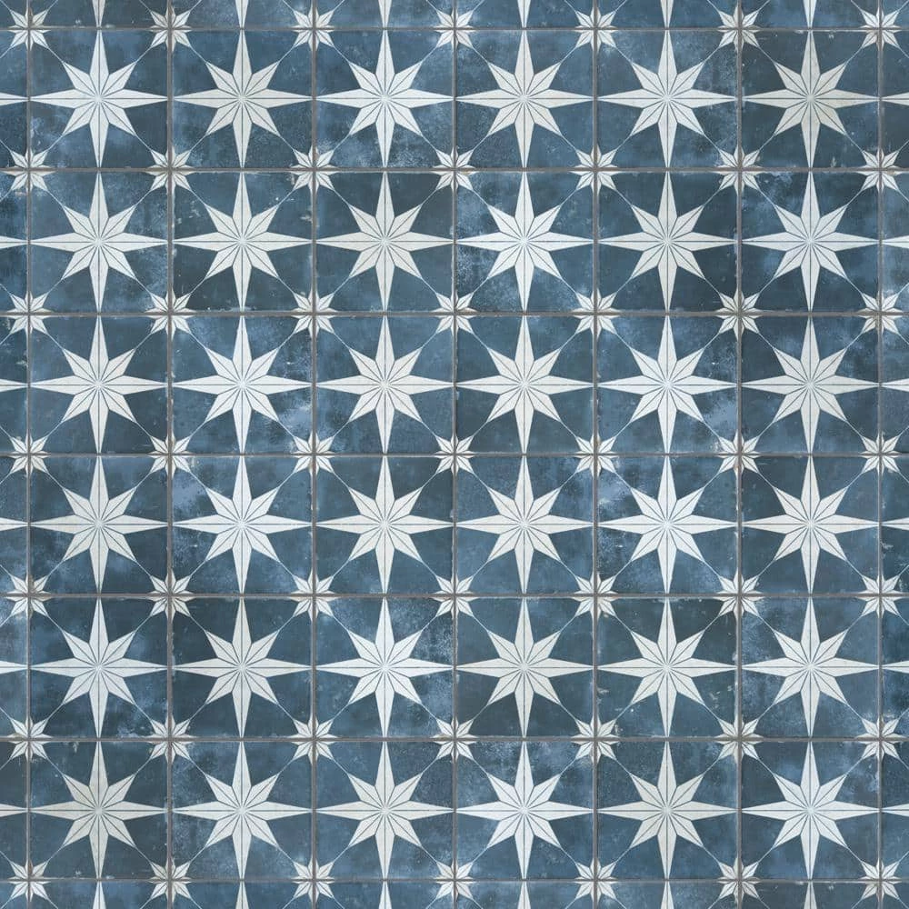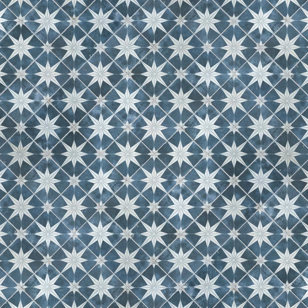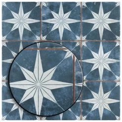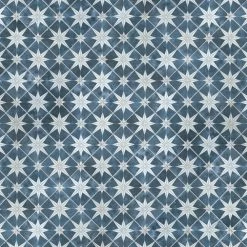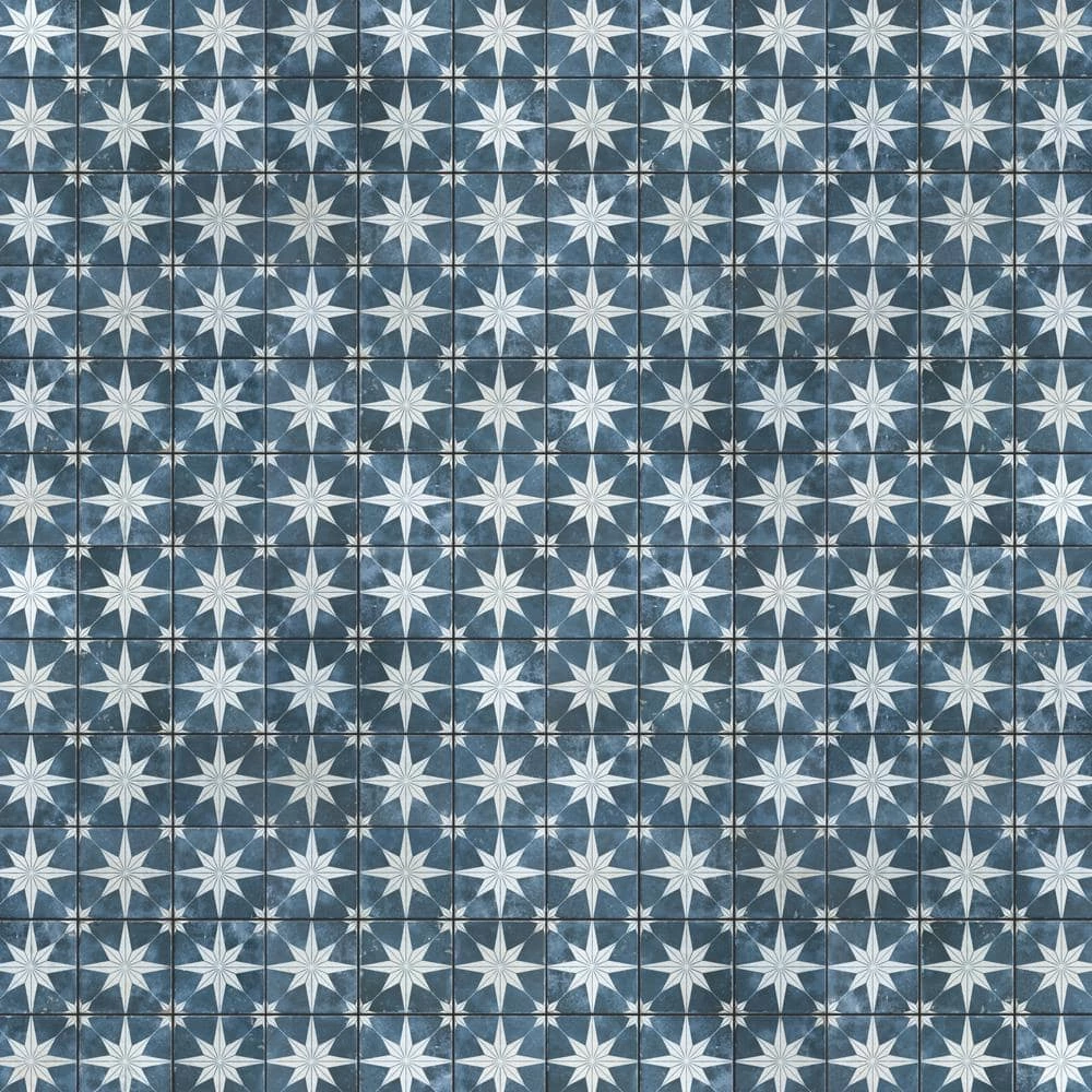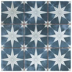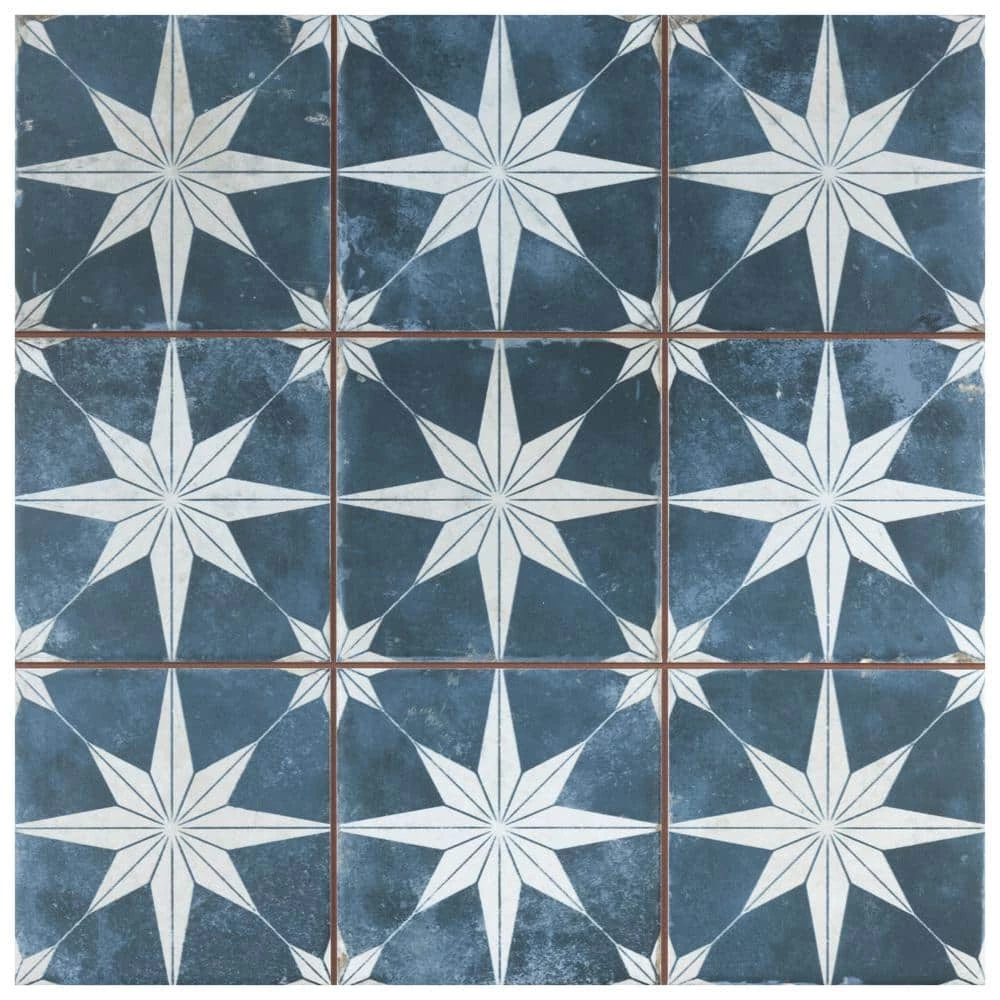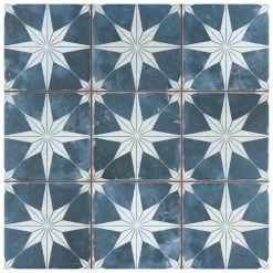 Our Harmonia Kings Star Sky 13 in. x 13 in. Ceramic Floor and Wall Tile creates the look of a stunning leading-edge mosaic-like design with the harmonious, easy installation of a square tile. Inspired by our best-selling Kings Star Sky, this ceramic encaustic-inspired tile similarly features a unique, low-sheen glaze in faded denim blue tones with centered antique white star patterns in each square. With realistic imitations and scuffs and spots that are the marks of well-loved, worn, century-old tile, this floor and wall tile is a true reflection of vintage industrial design. These scuffs and spots convince that this tile is truly aged, bringing rustic charm to any interior setting. Save time and labor spent arranging mosaic sheets and instead install these durable ceramic slabs, which have squares separated by scored grout lines. The scored grout lines can be grouted with the color of your choice to further customize your installation. Its glazed and durable features make it an ideal choice for both commercial and residential indoor installations including kitchens, bathrooms, backsplashes, showers, and entryways. Tile is the better choice for your space. This tile is made from natural ingredients, making it a healthy choice as it is free from allergens, VOCs, formaldehyde and PVC.