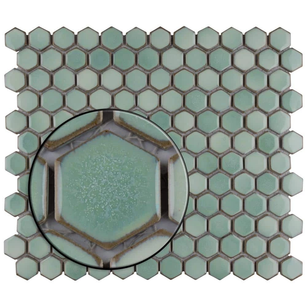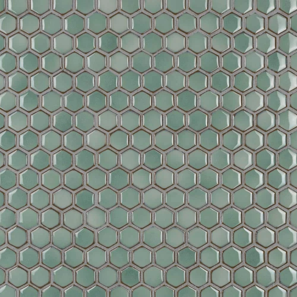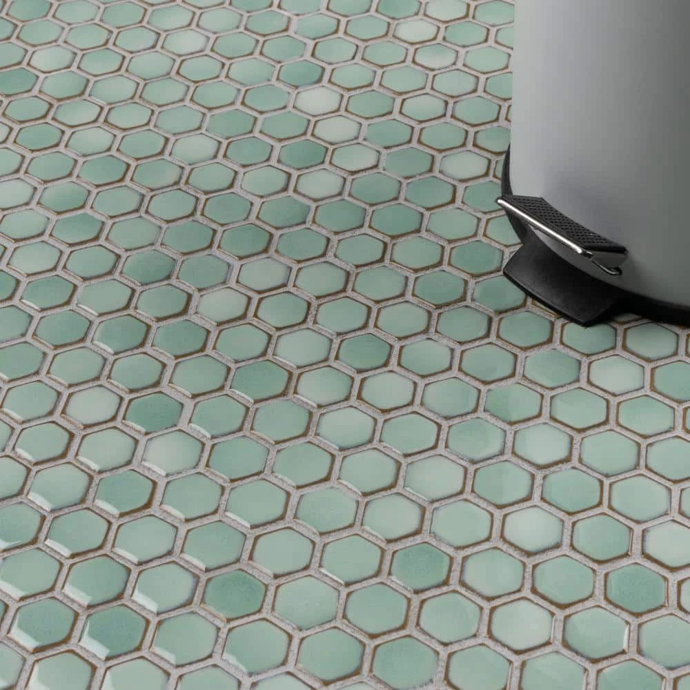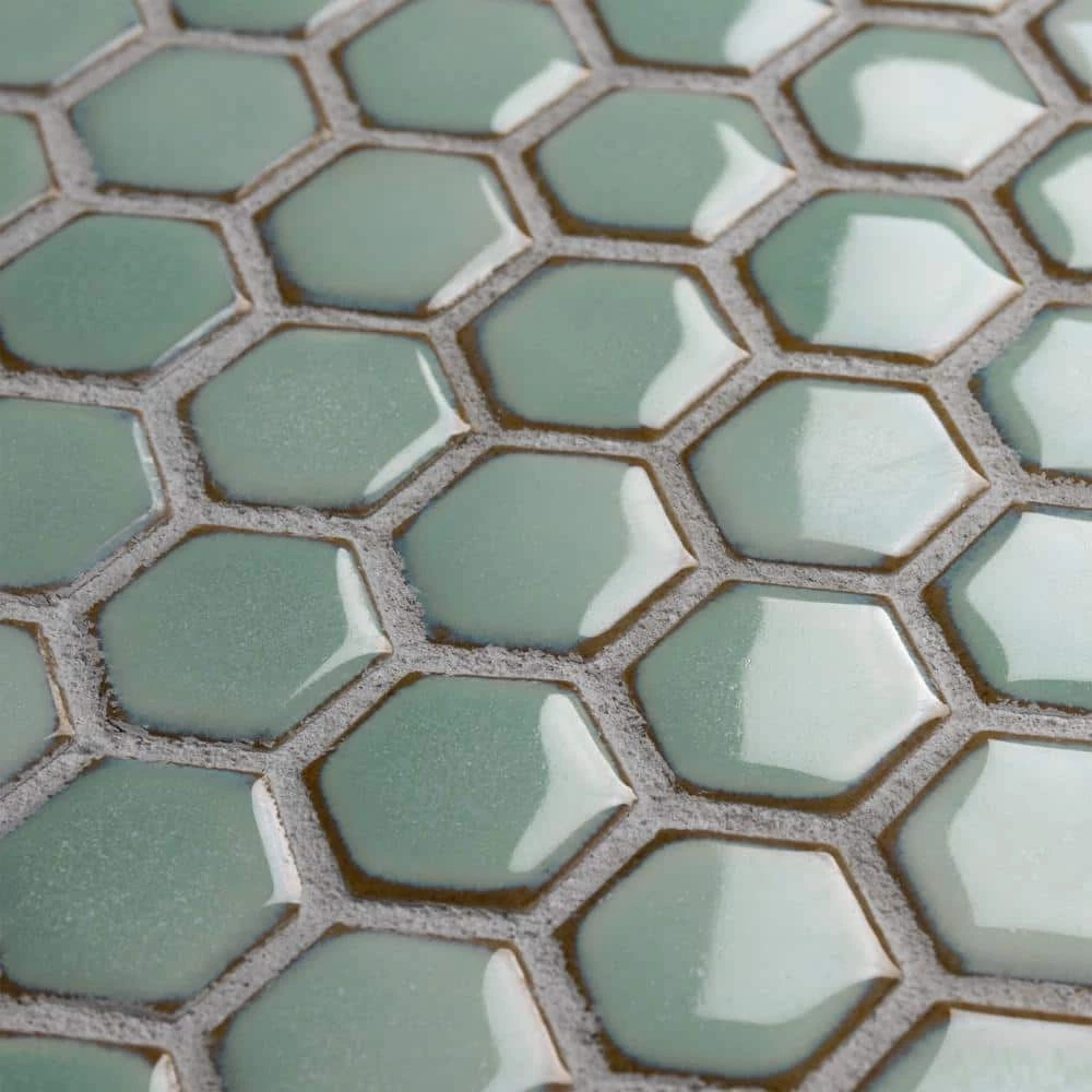 Our Hudson 1 in. Hex Mint Green Porcelain Mosaic Floor and Wall Tile instantly elevates spaces through a refreshing dose of geometric design. Featuring a reactive glaze with an eye-drop effect, these tiles have varying mint green color tones that blend to taupe around the edges. This mosaic is a pleasing mixture of cool-toned tints with additional dimension added by the smooth, high-gloss finish. This porcelain mosaic floor and wall tile is unique yet simplistic enough to integrate into any design, ranging from traditional style renovations to modern home projects. Its impervious and frost-resistant features make this an ideal choice for both commercial and residential indoor and outdoor floor and wall installations including, kitchen backsplashes, bathroom showers and accent walls. This hexagon mosaic can be used as a whole sheet or cut into smaller strips as an accent piece. It is a perfect choice on its own or coordinated with other colors in our Hudson Hex series. Tile is the better choice for your space. This tile is made from natural ingredients, making it a healthy choice as it is free from allergens, VOCs, formaldehyde and PVC.