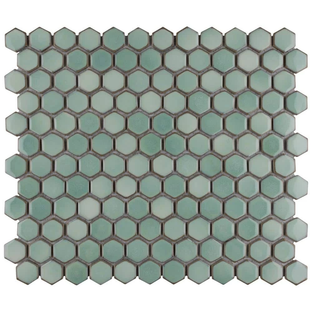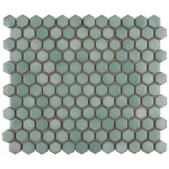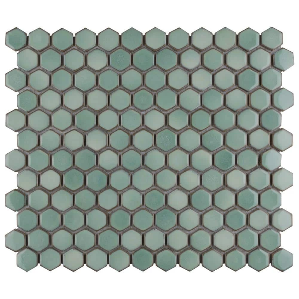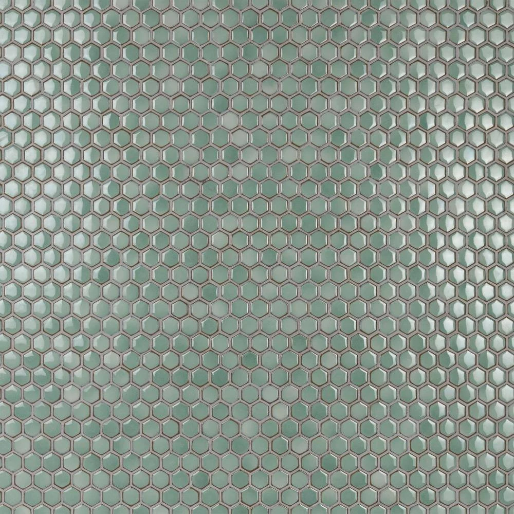 Our Hudson 1 in. Hex Mint Green Porcelain Mosaic Floor and Wall Tile instantly elevates spaces through a refreshing dose of geometric design. Featuring a reactive glaze with an eye-drop effect, these tiles have varying mint green color tones that blend to taupe around the edges. This mosaic is a pleasing mixture of cool-toned tints with additional dimension added by the smooth, high-gloss finish. This porcelain mosaic floor and wall tile is unique yet simplistic enough to integrate into any design, ranging from traditional style renovations to modern home projects. Its impervious and frost-resistant features make this an ideal choice for both commercial and residential indoor and outdoor floor and wall installations including, kitchen backsplashes, bathroom showers and accent walls. This hexagon mosaic can be used as a whole sheet or cut into smaller strips as an accent piece. It is a perfect choice on its own or coordinated with other colors in our Hudson Hex series. Tile is the better choice for your space. This tile is made from natural ingredients, making it a healthy choice as it is free from allergens, VOCs, formaldehyde and PVC.