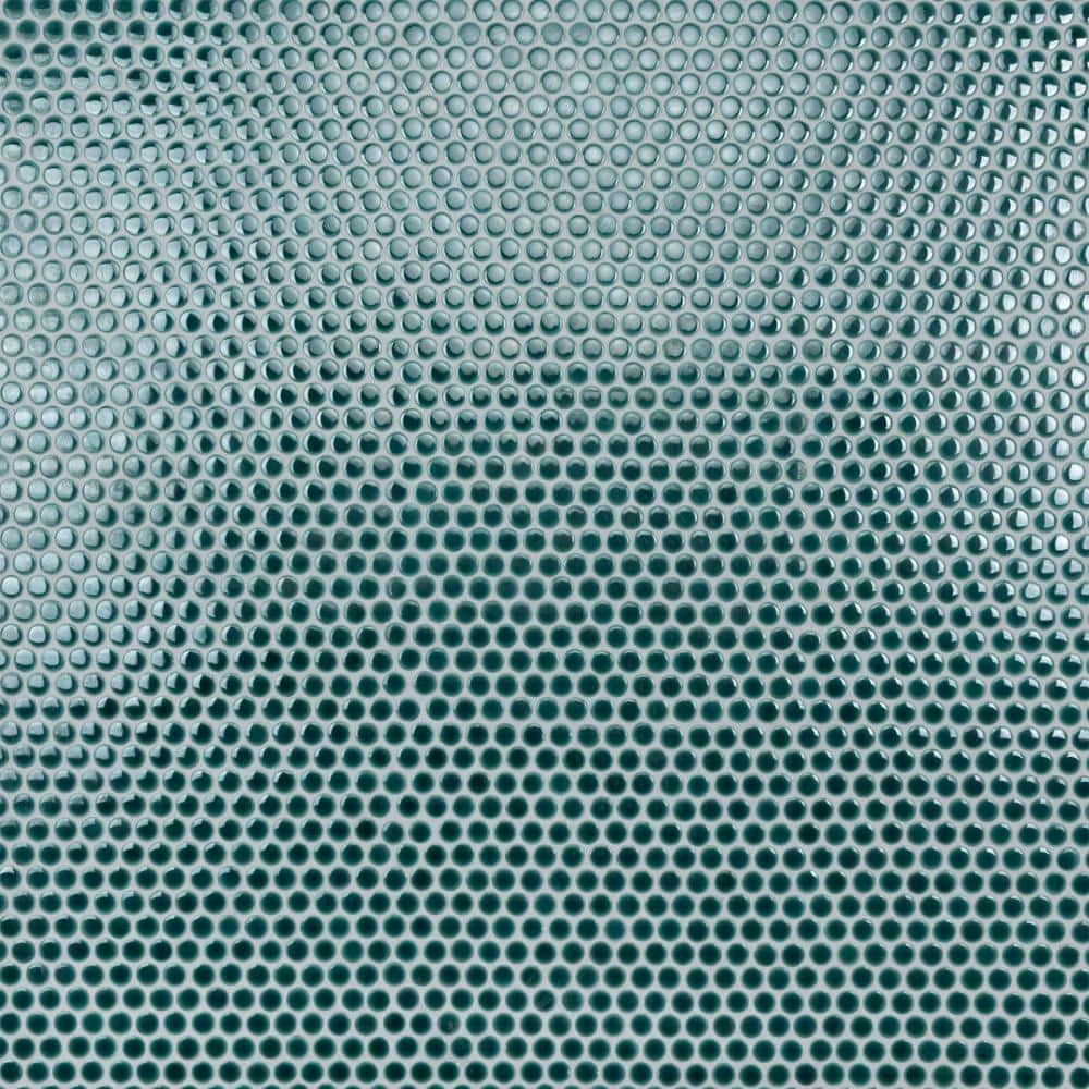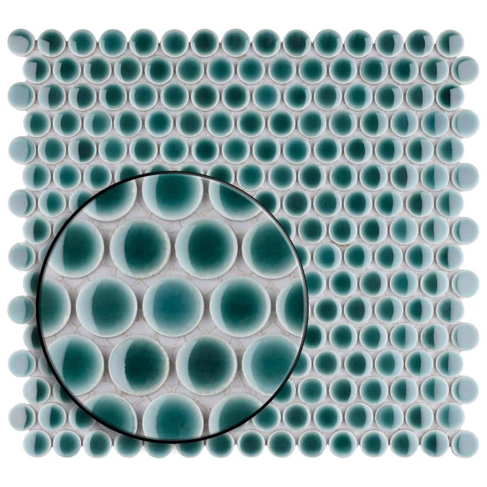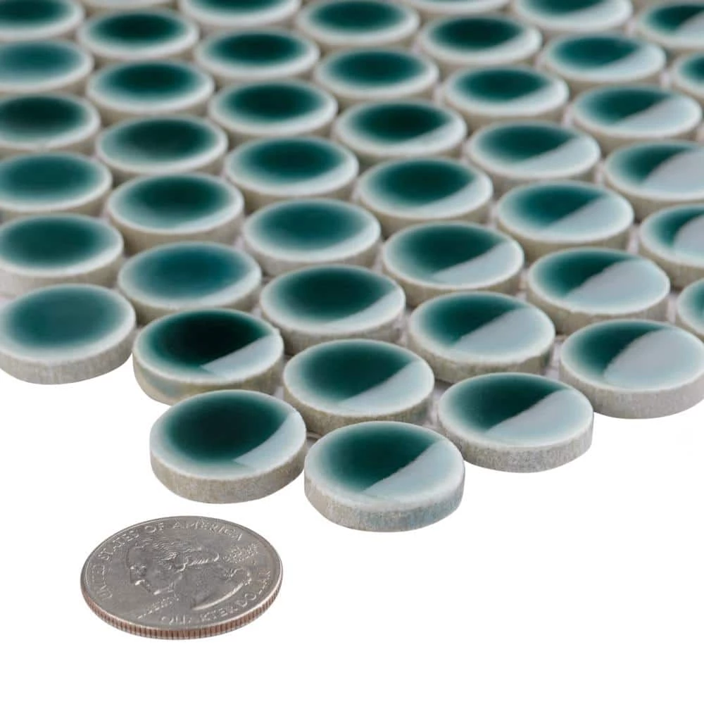 Merola Tile’s Hudson Penny Round Glossy Emerald 12 in. x 12-5/8 in. x 5 mm Porcelain Mosaic Tile lends a refreshing aesthetic to the classic penny round shape. With subtle variations in color tone that gradually fade to white around the border, each piece is truly unique. Its rich reactive glaze echoes deep emerald hues with a high glossy finish that is unique yet simplistic enough to integrate into any design, ranging from traditional style renovations to modern home projects. Its impervious and frost-resistant features make this penny tile an ideal choice for indoor and outdoor floor and wall installations including, kitchen backsplashes, bathroom showers and accent walls. This penny round tile can be used as a whole sheet or cut into smaller strips as an accent piece. It is a perfect choice on its own or coordinated with other colors in our Hudson Penny Round series.