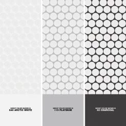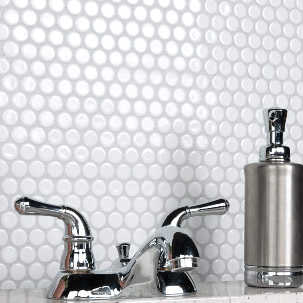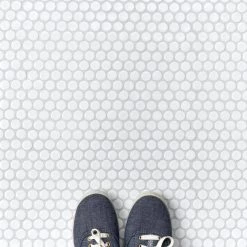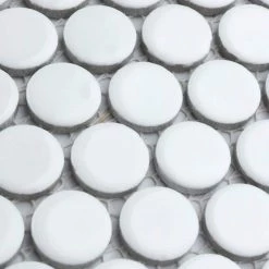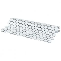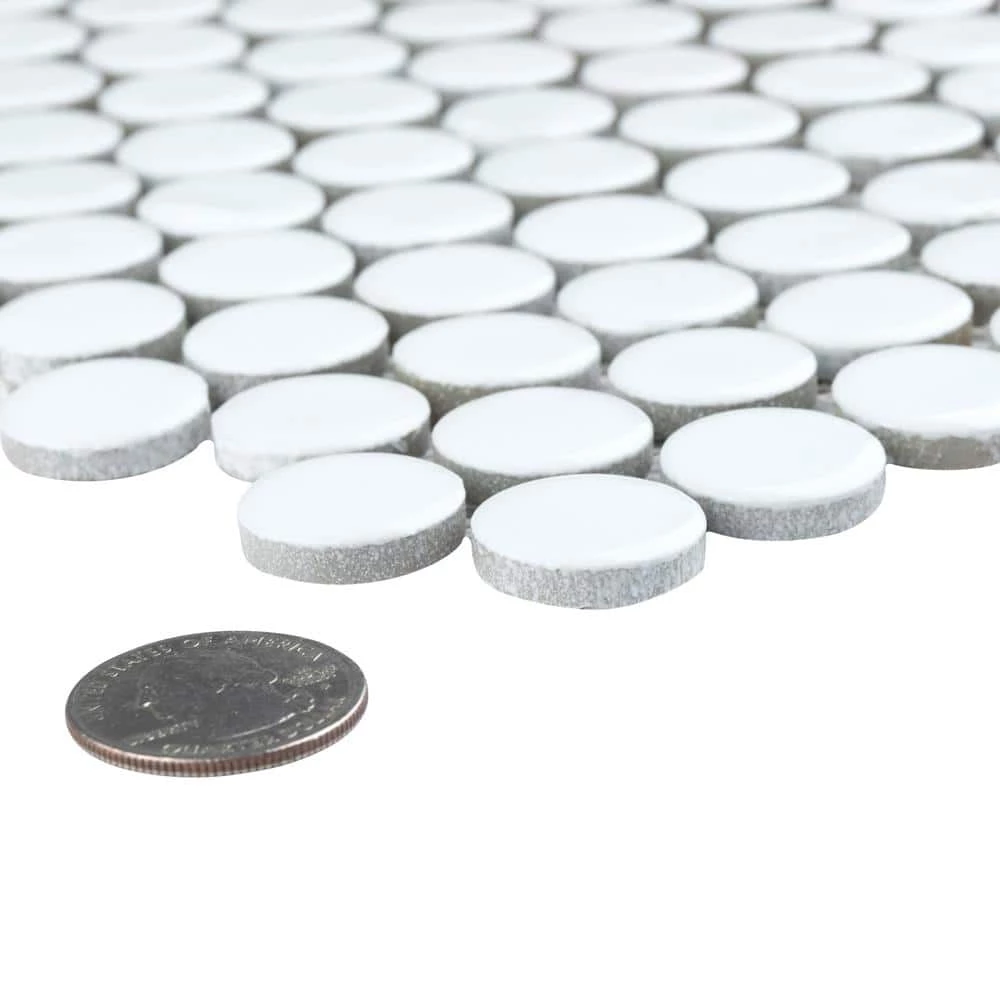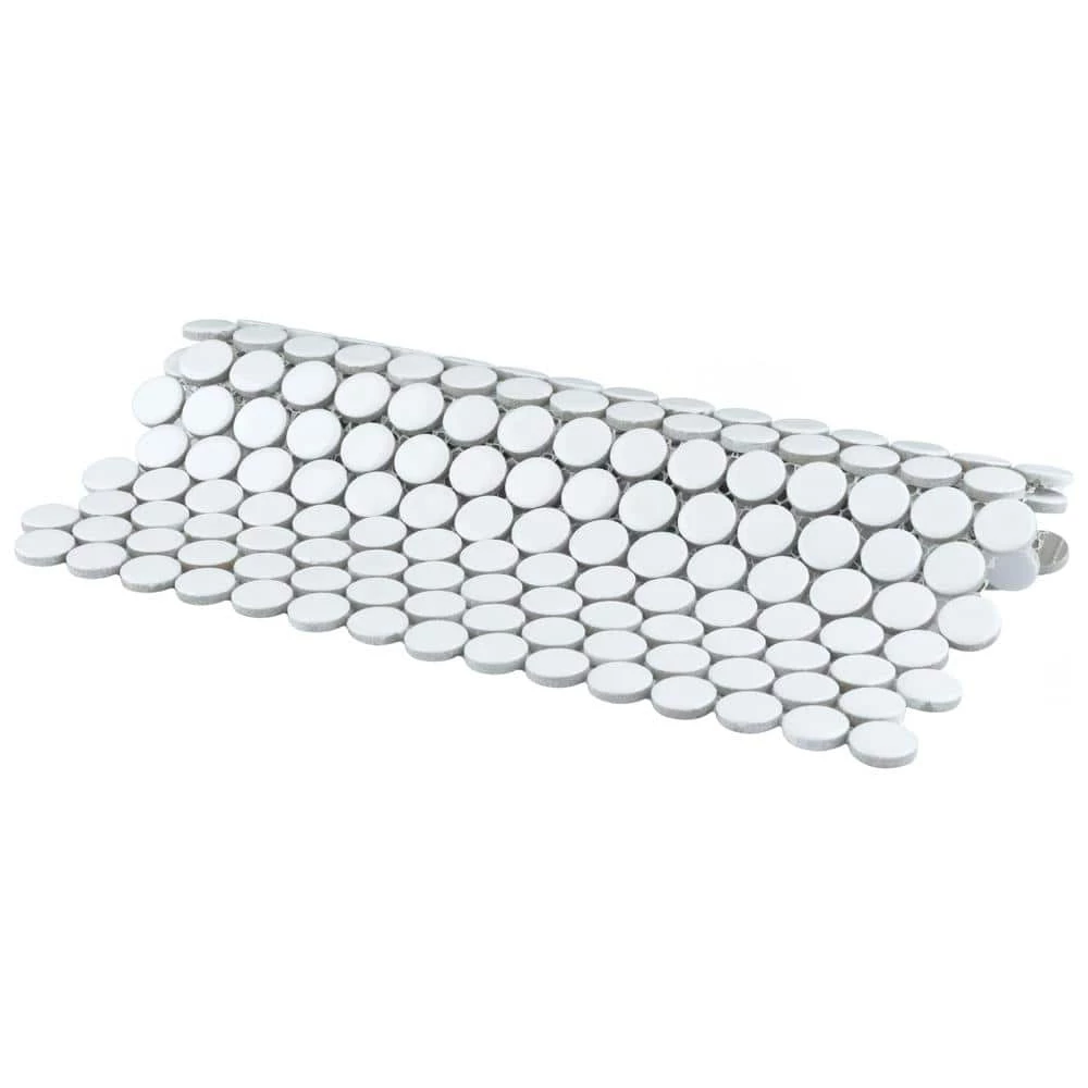 Merola Tile’s Hudson Penny Round Glossy White 12 in. x 12-5/8 in. Porcelain Mosaic Tile lends a refreshing aesthetic to the classic penny round shape. This mosaic tile features a uniformly glazed surface with a smooth texture and a glossy white color tone. It offers a versatile appearance that is unique yet simplistic enough to integrate into any design, ranging from traditional style renovations to modern home projects. Its impervious and frost-resistant features make this penny tile an ideal choice for indoor and outdoor floor and wall installations including, kitchen backsplashes, bathroom showers and accent walls. This penny round tile can be used as a whole sheet or cut into smaller strips as an accent piece. It is a perfect choice on its own or coordinated with other colors in our Hudson Penny Round series.