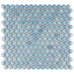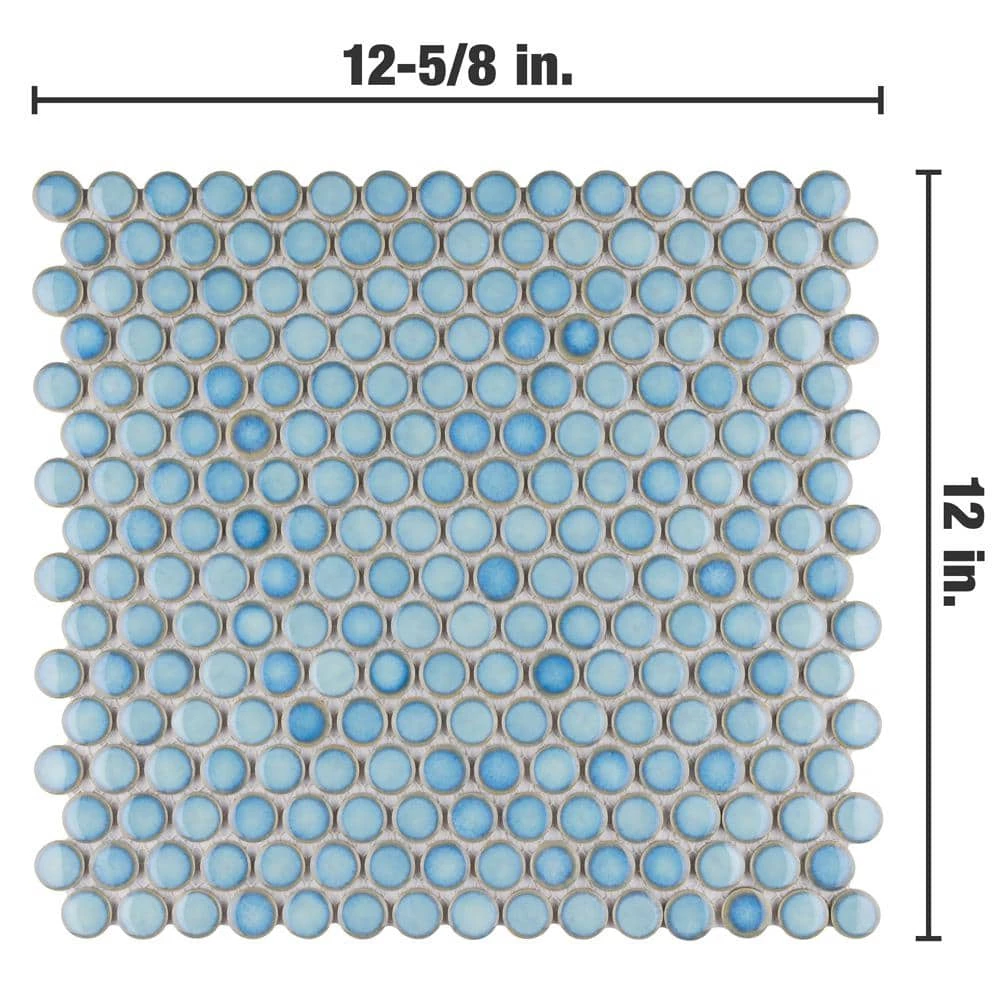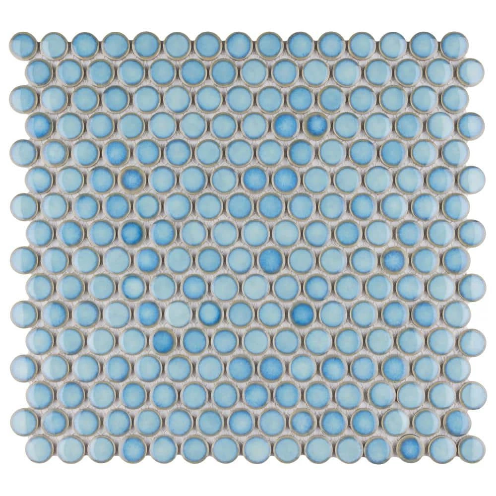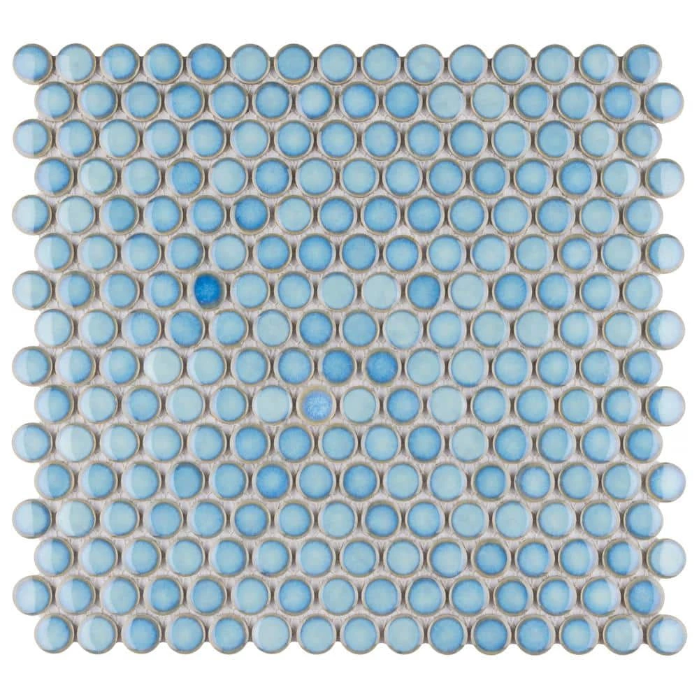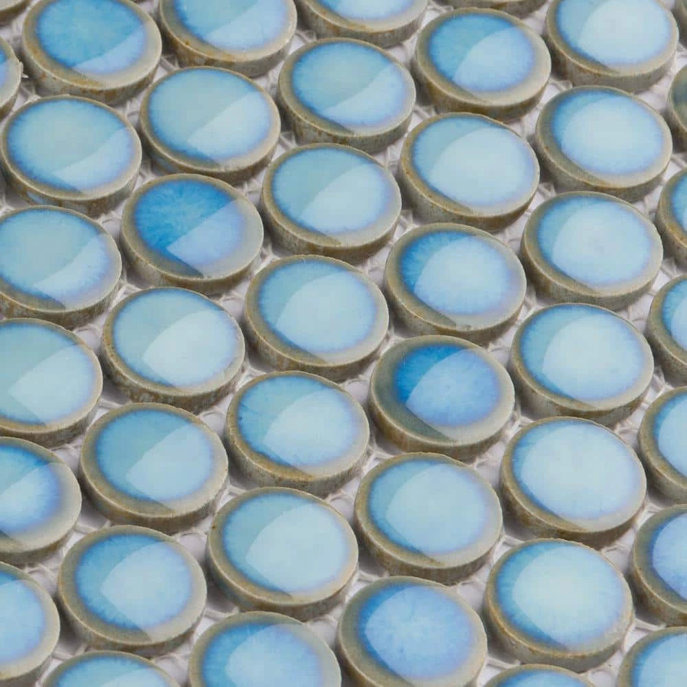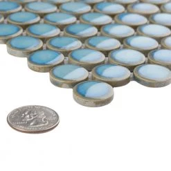 Merola Tile’s Hudson Penny Round Marine 12 in. x 12-5/8 in. x 5 mm Porcelain Mosaic Tile is a beautifully tranquil update on the timeless penny round design. Featuring a reactive glaze with an eye-drop effect, these tiles have varying shades of light and dark sky blue that blend to taupe around the edges. This mosaic creates a uniquely sporadic design through a pleasing mixture of cool-toned tints with additional dimension added by the smooth, high-gloss finish. Its impervious and frost-resistant features make this penny tile an ideal choice for indoor and outdoor floor and wall installations including, kitchen backsplashes, bathroom showers and accent walls. This penny round tile can be used as a whole sheet or cut into smaller strips as an accent piece. It is a perfect choice on its own or coordinated with other colors in our Hudson Penny Round series.