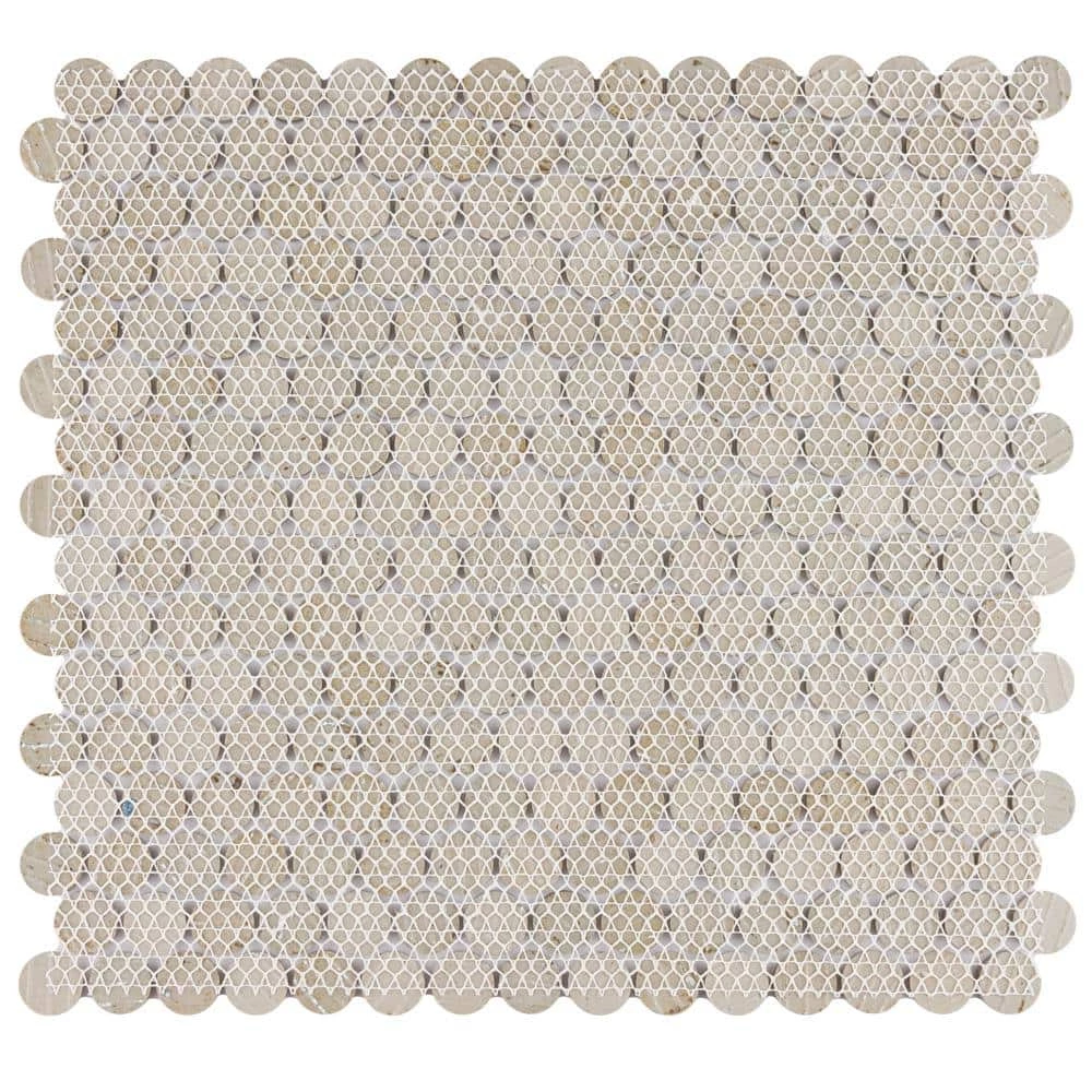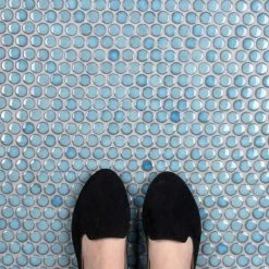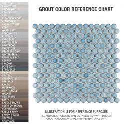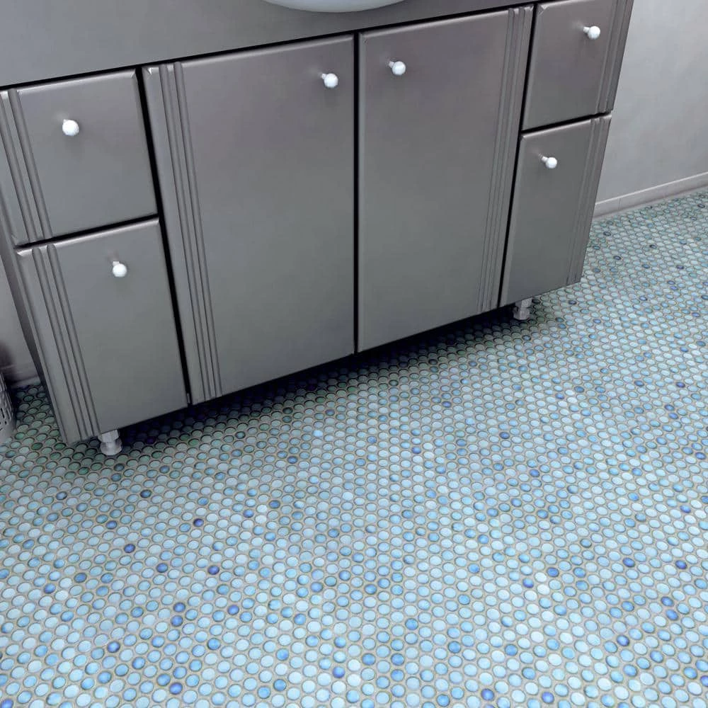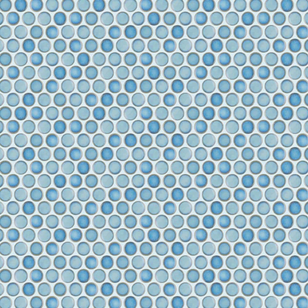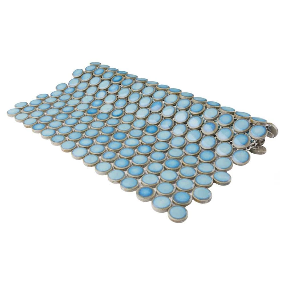 Merola Tile’s Hudson Penny Round Marine 12 in. x 12-5/8 in. x 5 mm Porcelain Mosaic Tile is a beautifully tranquil update on the timeless penny round design. Featuring a reactive glaze with an eye-drop effect, these tiles have varying shades of light and dark sky blue that blend to taupe around the edges. This mosaic creates a uniquely sporadic design through a pleasing mixture of cool-toned tints with additional dimension added by the smooth, high-gloss finish. Its impervious and frost-resistant features make this penny tile an ideal choice for indoor and outdoor floor and wall installations including, kitchen backsplashes, bathroom showers and accent walls. This penny round tile can be used as a whole sheet or cut into smaller strips as an accent piece. It is a perfect choice on its own or coordinated with other colors in our Hudson Penny Round series.