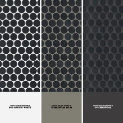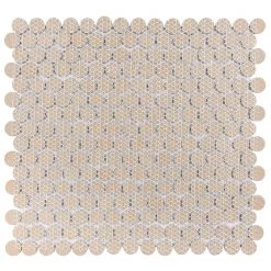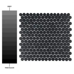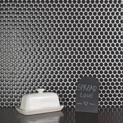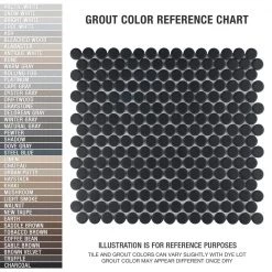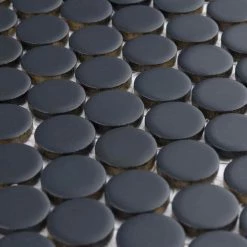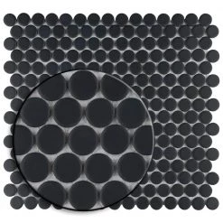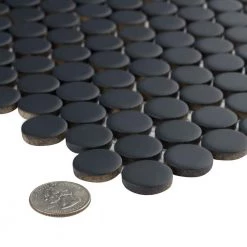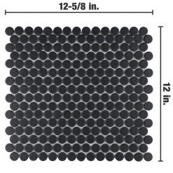 Merola Tile’s Hudson Penny Round Matte Black 12 in. x 12-5/8 in. x 5 mm Porcelain Mosaic Tile is a reinvented version of Victorian-era beauty. As a modern deviation from the classic mosaic, this fresh option is a throwback to traditional retro design with a contemporary feel. Smooth matte black penny rounds are precisely arranged on an interlocking mesh to create a seamless installation. This minimalistic geometric porcelain mosaic is unique yet simplistic enough to integrate into any design, ranging from traditional style renovations to modern home projects. Its impervious, ADA-compliant and frost-resistant features make this penny tile an ideal choice for indoor and outdoor floor and wall installations including, kitchen backsplashes, bathroom showers and accent walls. This penny round tile can be used as a whole sheet or cut into smaller strips as an accent piece. It is a perfect choice on its own or coordinated with other colors in our Hudson Penny Round series.