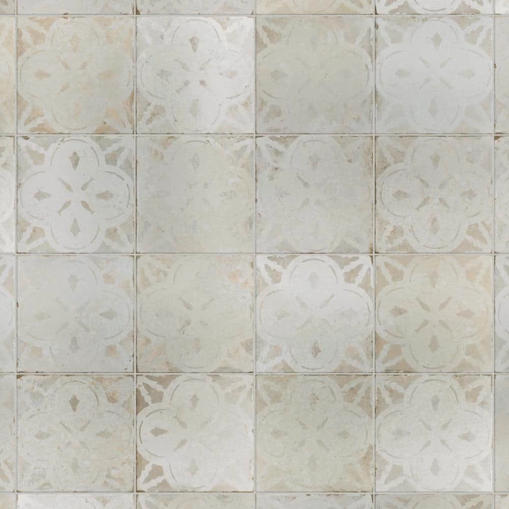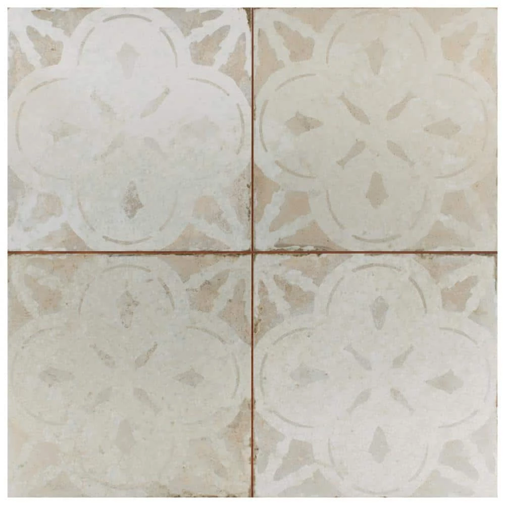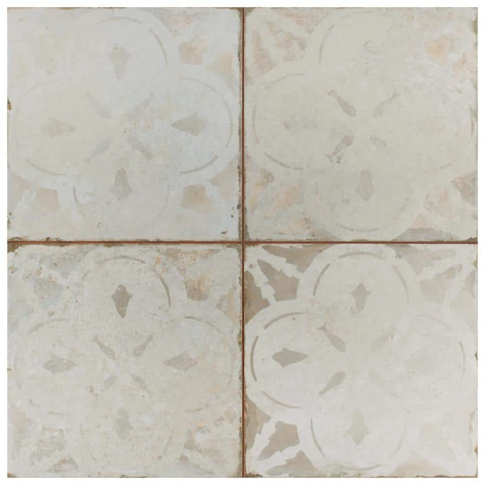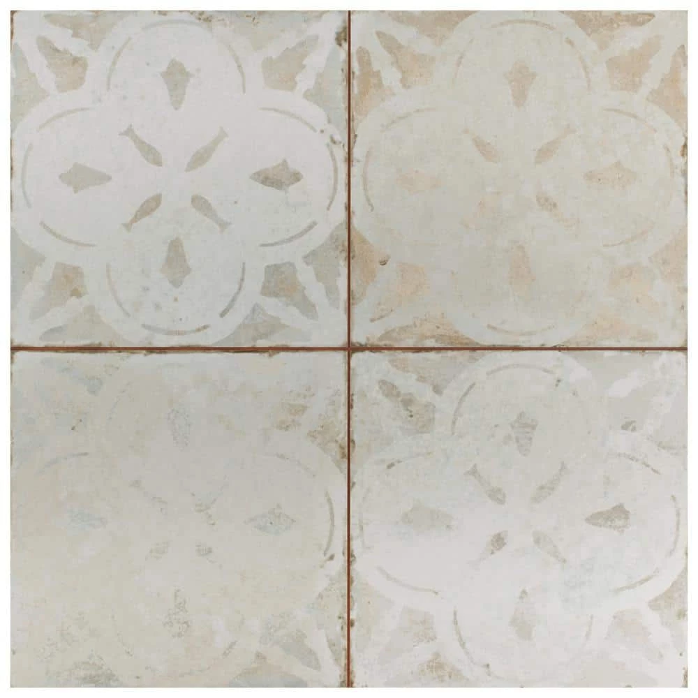 Modern and vintage design elements blend together to create our Merola Tile Kings Aurora Encaustic 17-5/8 in. x 17-5/8 in. White Ceramic Floor and Wall Tile. Featuring a worn cement appearance, this tile is a subtle statement piece created by floral motifs in faded shades of beige set on an antique white base glaze. Designed by interior architect and furniture designer Francisco Segarra, this tile is a true reflection of vintage industrial design. Realistic imitations of scuffs and spots that are the marks of well-loved, worn, century-old tile bring rustic charm to any interior setting. These rustic scuffs and spots convince that this tile is truly aged. Available in 7 print variations that are randomly scattered throughout each case, the variation throughout each tile mimics an authentic aged appearance. Save time and labor spent arranging smaller square tiles and instead install these durable porcelain slabs, which have four 8-3/4 in. squares separated by scored grout lines. The scored grout lines can be grouted with the color of your choice, or left ungrouted for a rugged finish. Its durable, ADA-compliant and glazed features make this tile an ideal choice for indoor residential use, including kitchen backsplashes, bathrooms and showers. Tile is the better choice for your space. This tile is made from natural ingredients, making it a healthy choice as it is free from allergens, VOCs, formaldehyde and PVC.