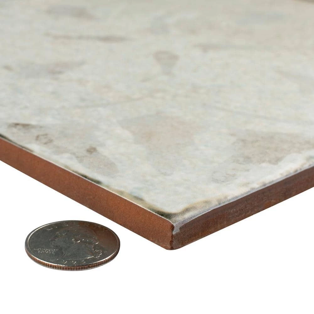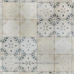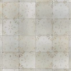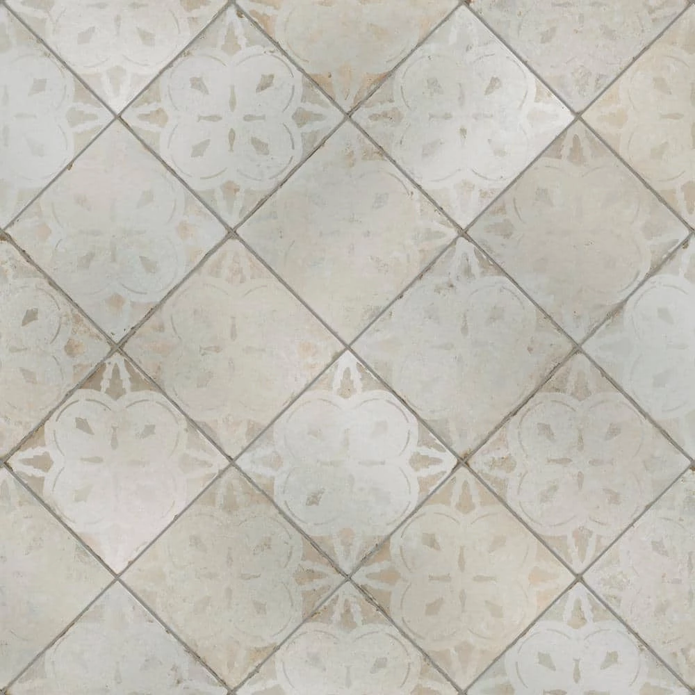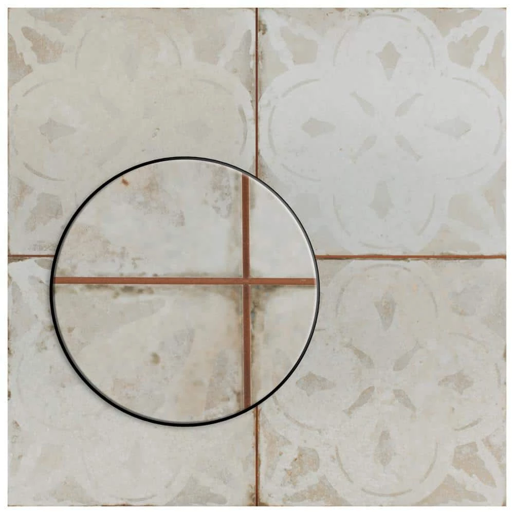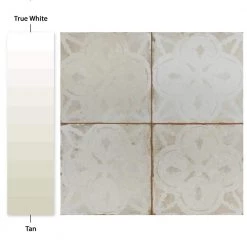 Modern and vintage design elements blend together to create our Merola Tile Kings Aurora Encaustic 17-5/8 in. x 17-5/8 in. White Ceramic Floor and Wall Tile. Featuring a worn cement appearance, this tile is a subtle statement piece created by floral motifs in faded shades of beige set on an antique white base glaze. Designed by interior architect and furniture designer Francisco Segarra, this tile is a true reflection of vintage industrial design. Realistic imitations of scuffs and spots that are the marks of well-loved, worn, century-old tile bring rustic charm to any interior setting. These rustic scuffs and spots convince that this tile is truly aged. Available in 7 print variations that are randomly scattered throughout each case, the variation throughout each tile mimics an authentic aged appearance. Save time and labor spent arranging smaller square tiles and instead install these durable porcelain slabs, which have four 8-3/4 in. squares separated by scored grout lines. The scored grout lines can be grouted with the color of your choice, or left ungrouted for a rugged finish. Its durable, ADA-compliant and glazed features make this tile an ideal choice for indoor residential use, including kitchen backsplashes, bathrooms and showers. Tile is the better choice for your space. This tile is made from natural ingredients, making it a healthy choice as it is free from allergens, VOCs, formaldehyde and PVC.