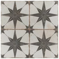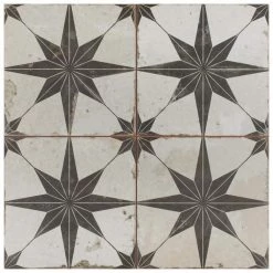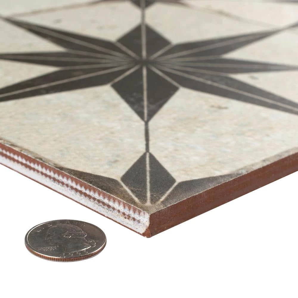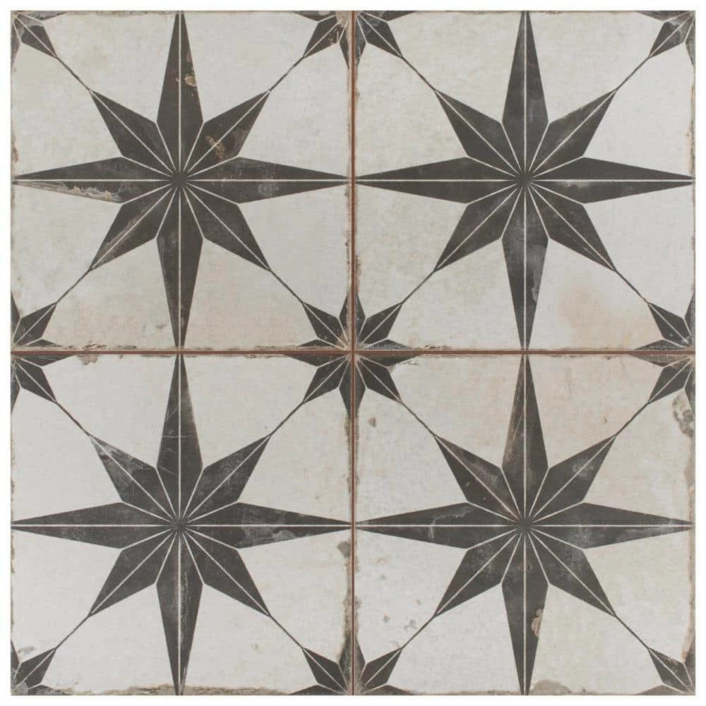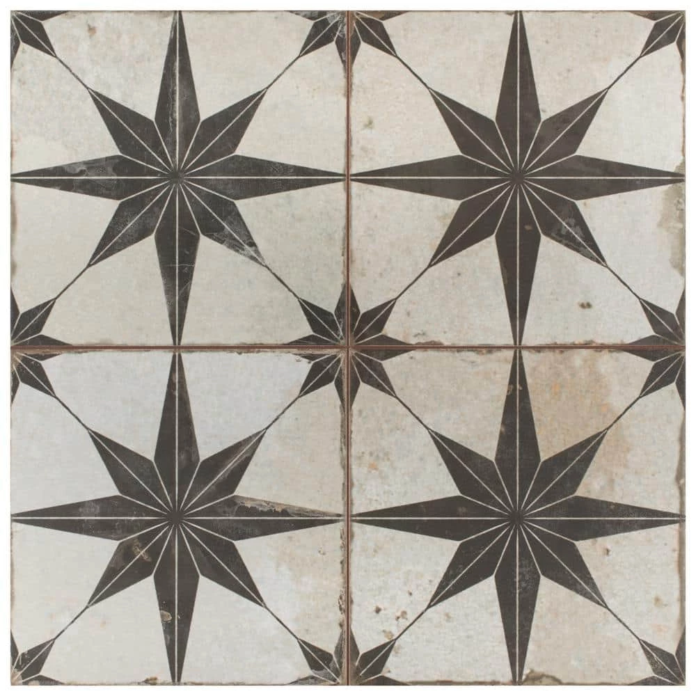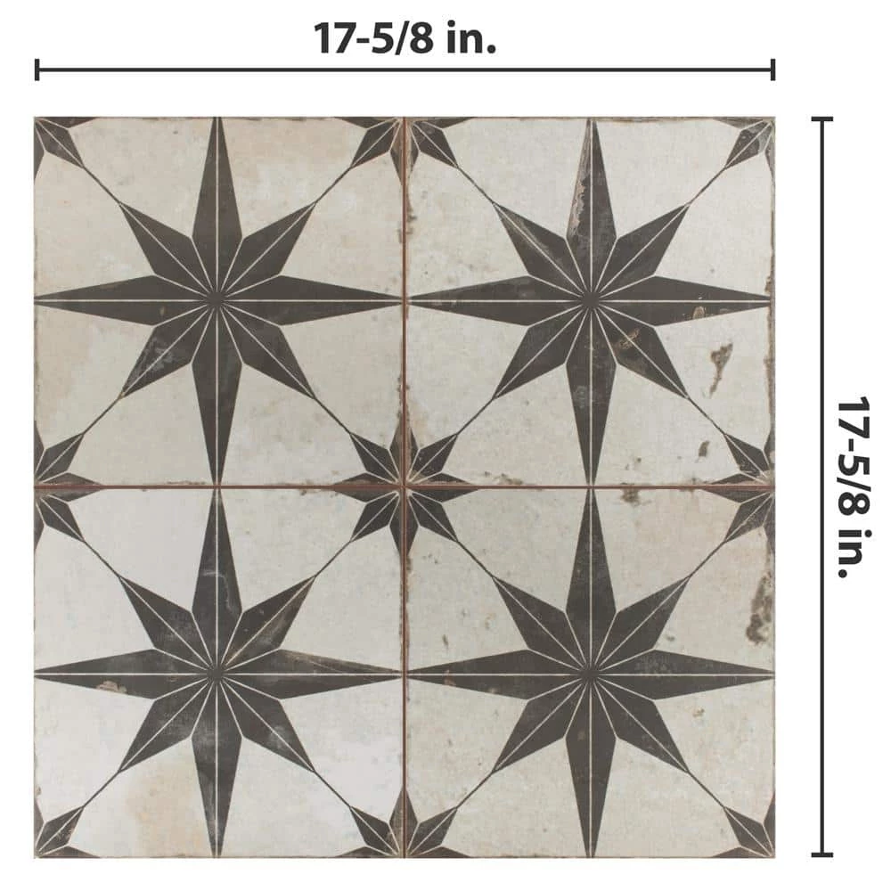 Old-world European elegance radiates from the Merola Tile Kings Star Nero Encaustic 17-5/8 in. x 17-5/8 in. Ceramic Floor and Wall Tile imported from Spain. Save time and labor spent arranging smaller square tiles and instead install these durable ceramic slabs, which have four 8-3/4 in. squares separated by scored grout lines. The defining feature of this encaustic-inspired tile is the unique, low-sheen glaze in beige tones with centered black stars in each square. Variation throughout each tile mimics an authentic aged appearance. Designed by interior architect and furniture designer Francisco Segarra, this tile is a true reflection of vintage industrial design. Realistic imitations of scuffs and spots that are the marks of well-loved, worn, century-old tile bring rustic charm to your interior. There are 9 different variations available that are randomly scattered throughout each case. The scored grout lines can be grouted with the color of your choice or left un-grouted for a rugged finish.
