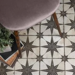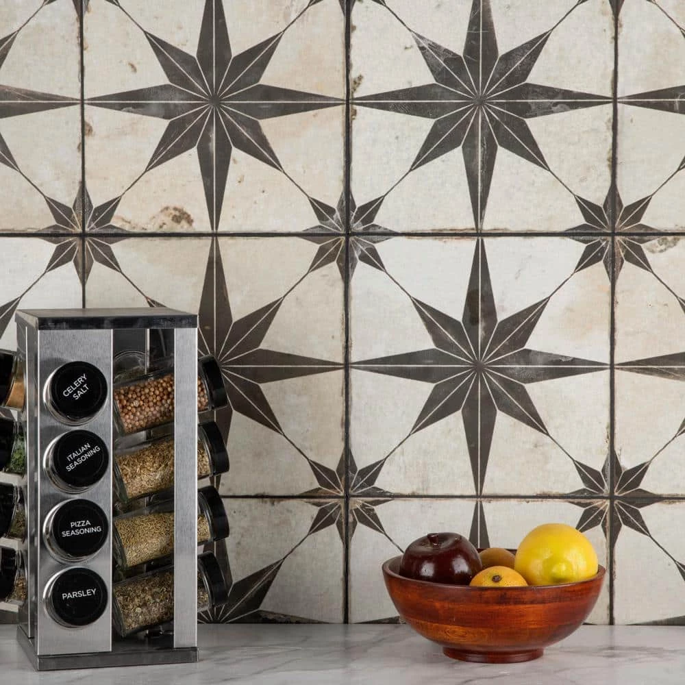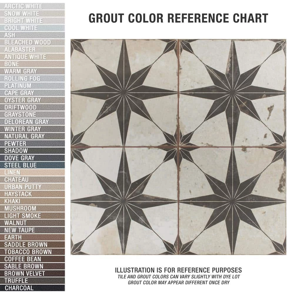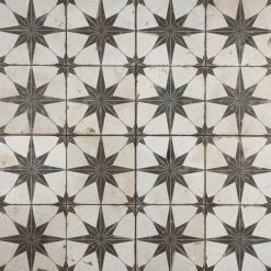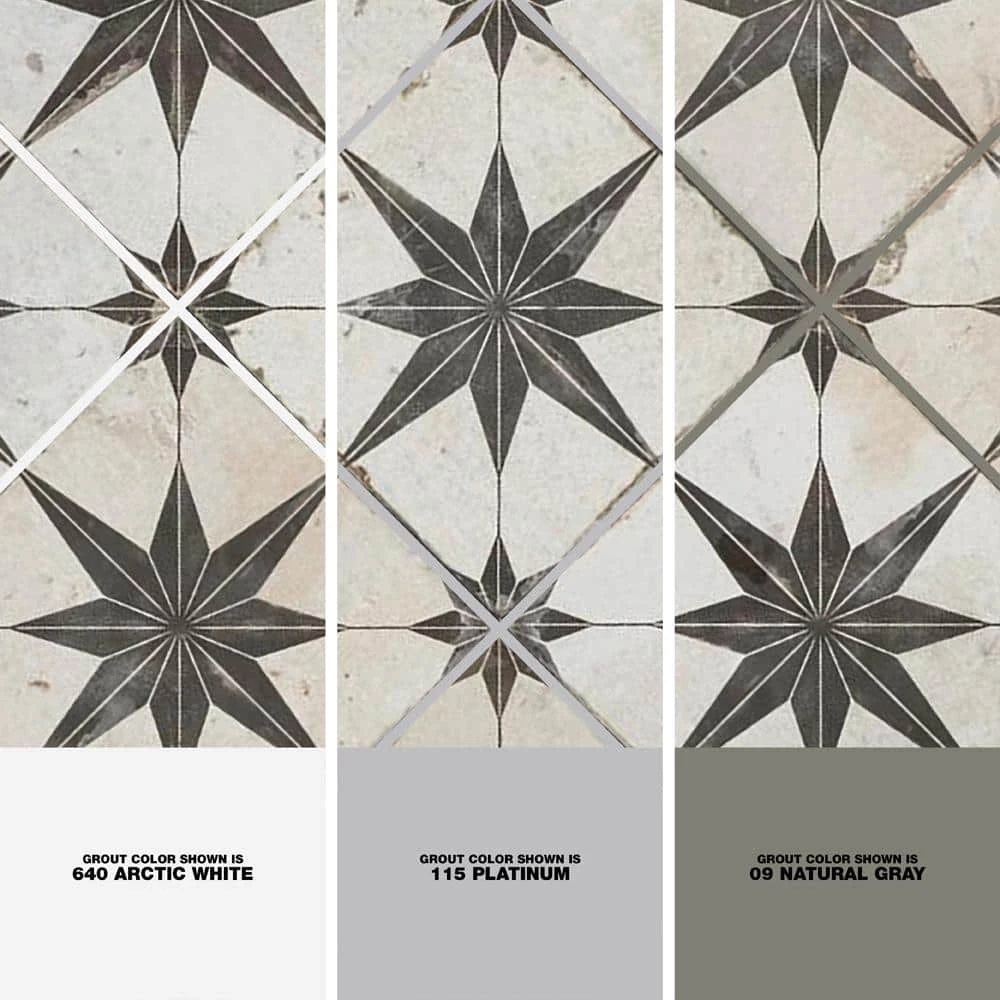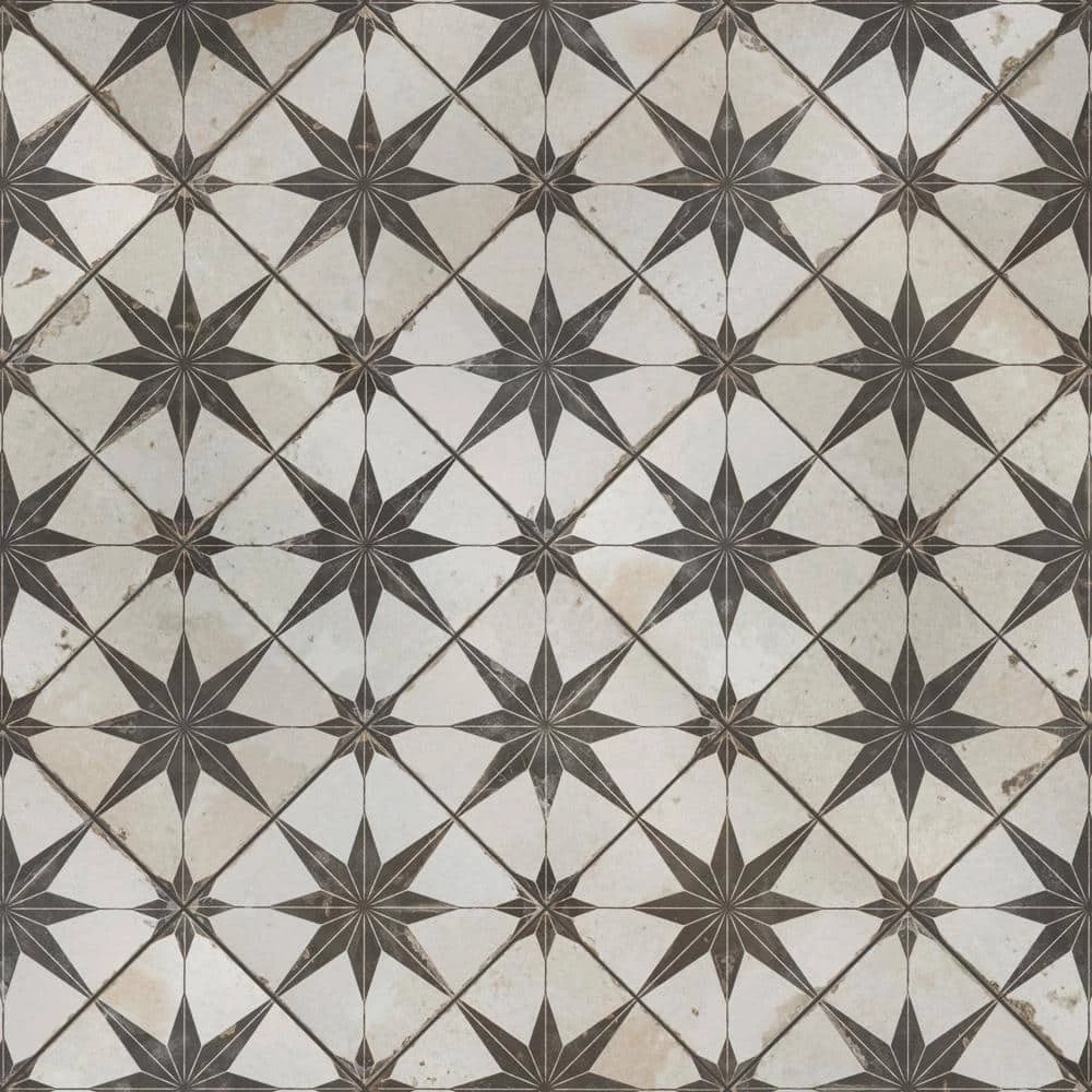 Old-world European elegance radiates from the Merola Tile Kings Star Nero Encaustic 17-5/8 in. x 17-5/8 in. Ceramic Floor and Wall Tile imported from Spain. Save time and labor spent arranging smaller square tiles and instead install these durable ceramic slabs, which have four 8-3/4 in. squares separated by scored grout lines. The defining feature of this encaustic-inspired tile is the unique, low-sheen glaze in beige tones with centered black stars in each square. Variation throughout each tile mimics an authentic aged appearance. Designed by interior architect and furniture designer Francisco Segarra, this tile is a true reflection of vintage industrial design. Realistic imitations of scuffs and spots that are the marks of well-loved, worn, century-old tile bring rustic charm to your interior. There are 9 different variations available that are randomly scattered throughout each case. The scored grout lines can be grouted with the color of your choice or left un-grouted for a rugged finish.