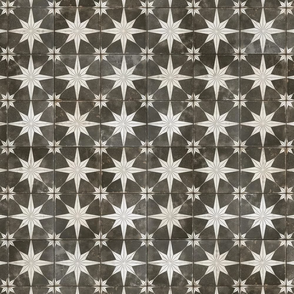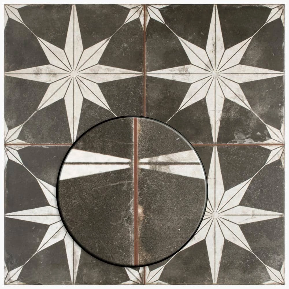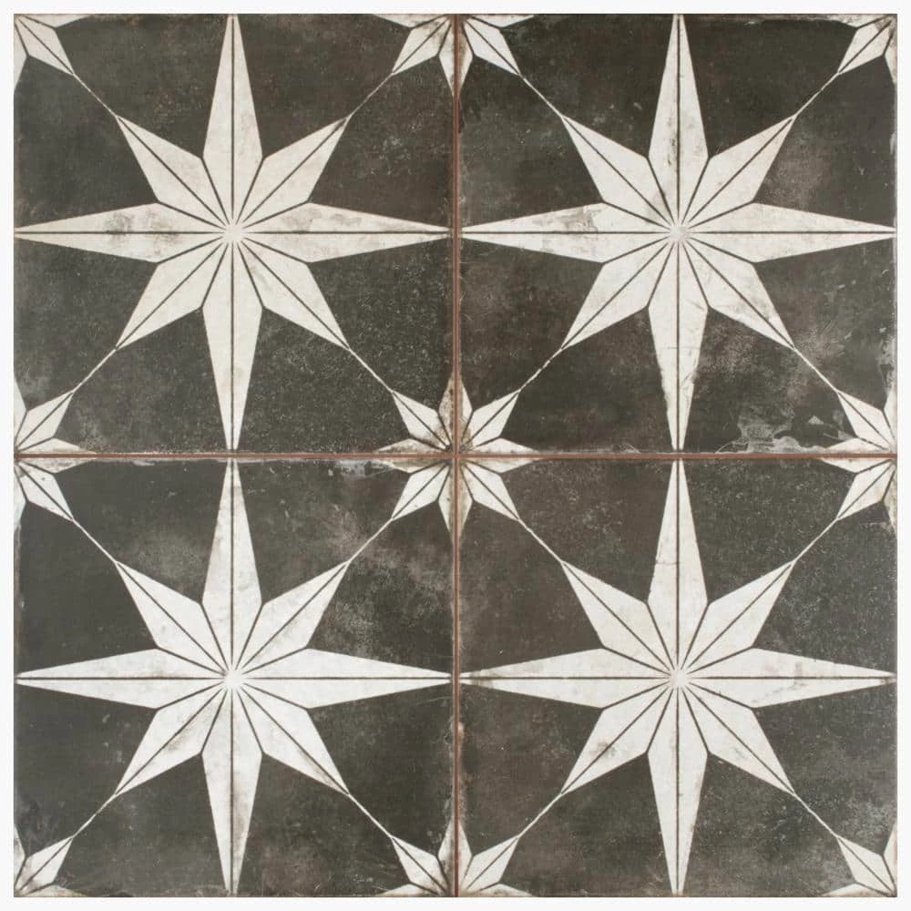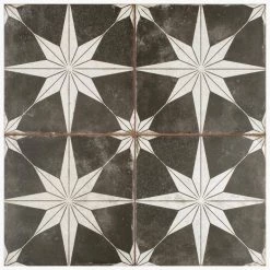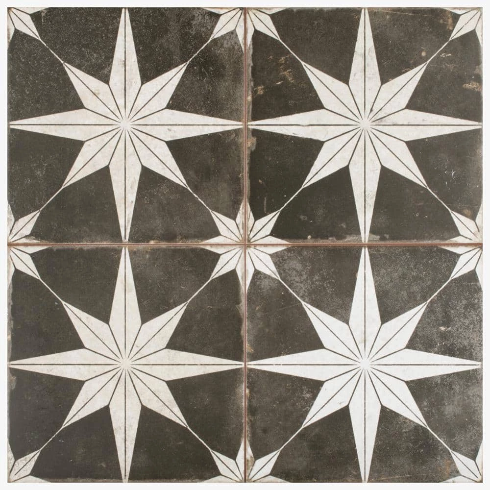 Imported from Spain, our Merola Tile Kings Star Encaustic 17-5/8 in. x 17-5/8 in. Night Ceramic Floor and Wall Tile radiates old-world European elegance. This encaustic-inspired tile features a unique, low-sheen glaze in faded charcoal black tones with centered antique white star patterns in each square. Designed by interior architect and furniture designer Francisco Segarra, this tile is a true reflection of vintage industrial design. Realistic imitations of scuffs and spots that are the marks of well-loved, worn, century-old tile bring rustic charm to any interior setting. These rustic scuffs and spots convince that this tile is truly aged. Available in 7 print variations that are randomly scattered throughout each case, the variation throughout each tile mimics an authentic aged appearance. Save time and labor spent arranging smaller square tiles and instead install these durable porcelain slabs, which have four 8-3/4 in. squares separated by scored grout lines. The scored grout lines can be grouted with the color of your choice, or left ungrouted for a rugged finish. It’s durable, ADA-compliant and glazed features make this tile an ideal choice for indoor residential use, including kitchen backsplashes, bathrooms and showers. Tile is the better choice for your space. This tile is made from natural ingredients, making it a healthy choice as it is free from allergens, VOCs, formaldehyde and PVC.