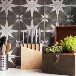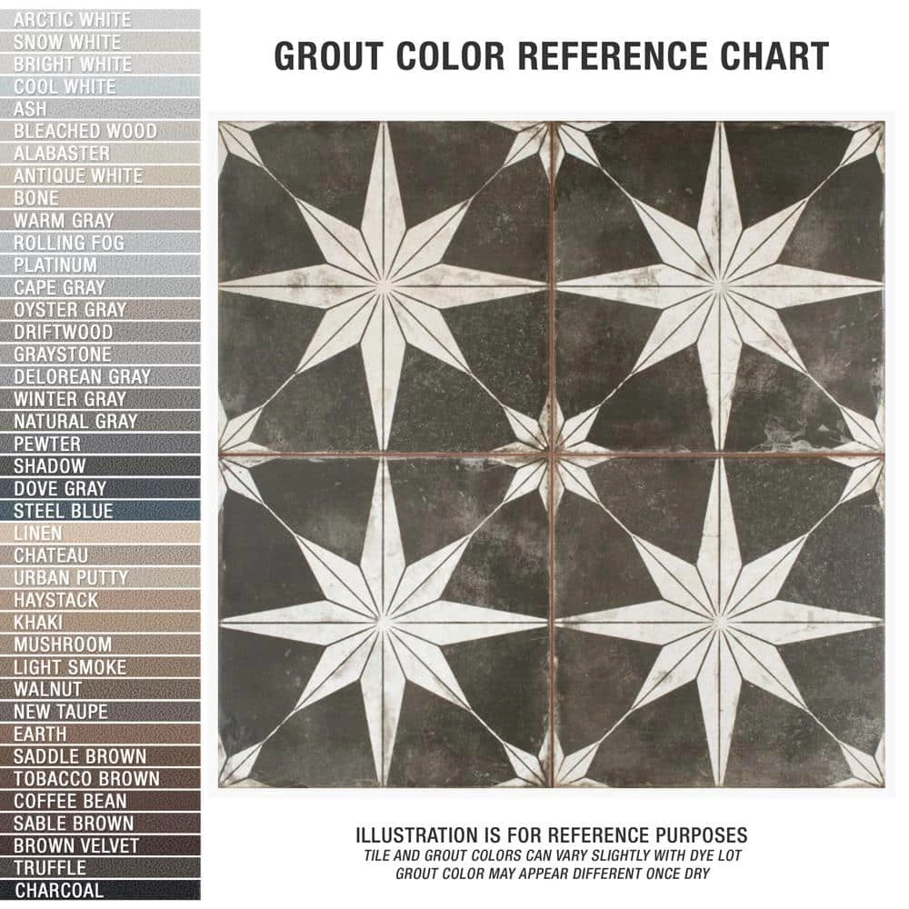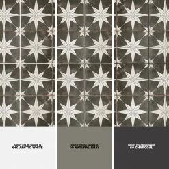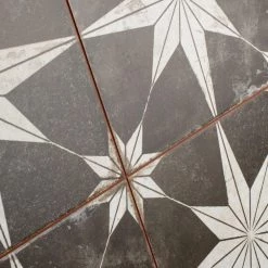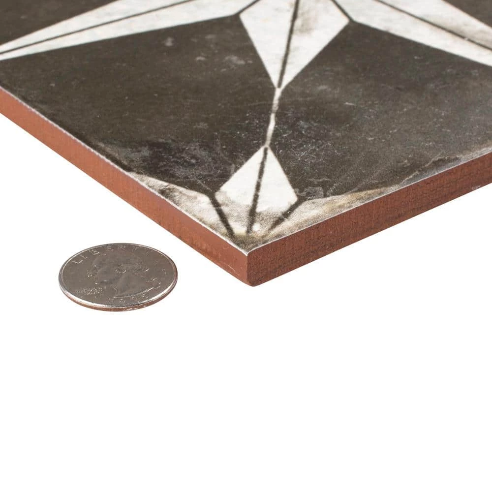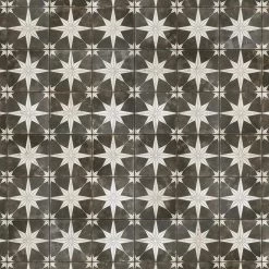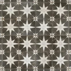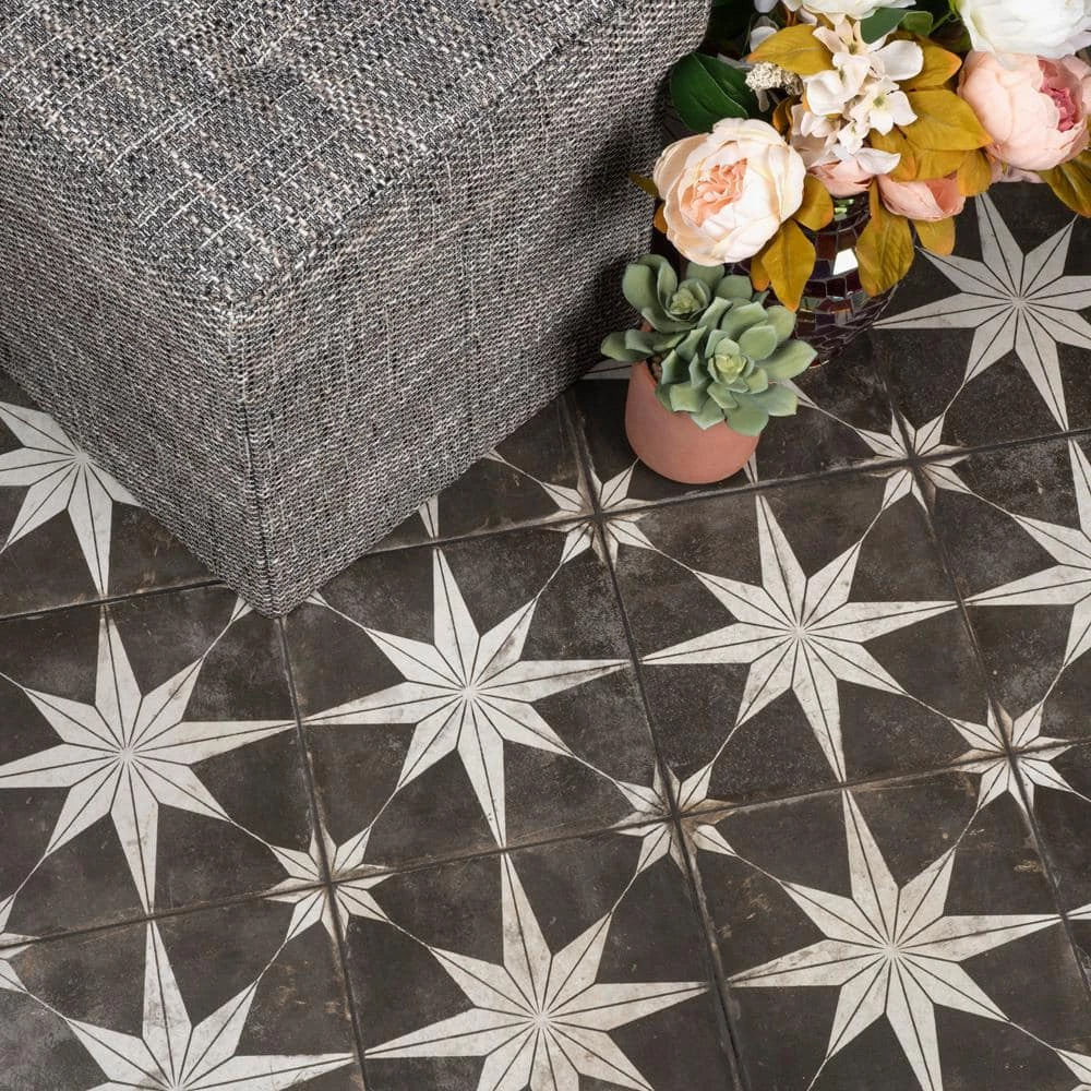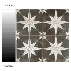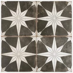 Imported from Spain, our Merola Tile Kings Star Encaustic 17-5/8 in. x 17-5/8 in. Night Ceramic Floor and Wall Tile radiates old-world European elegance. This encaustic-inspired tile features a unique, low-sheen glaze in faded charcoal black tones with centered antique white star patterns in each square. Designed by interior architect and furniture designer Francisco Segarra, this tile is a true reflection of vintage industrial design. Realistic imitations of scuffs and spots that are the marks of well-loved, worn, century-old tile bring rustic charm to any interior setting. These rustic scuffs and spots convince that this tile is truly aged. Available in 7 print variations that are randomly scattered throughout each case, the variation throughout each tile mimics an authentic aged appearance. Save time and labor spent arranging smaller square tiles and instead install these durable porcelain slabs, which have four 8-3/4 in. squares separated by scored grout lines. The scored grout lines can be grouted with the color of your choice, or left ungrouted for a rugged finish. It’s durable, ADA-compliant and glazed features make this tile an ideal choice for indoor residential use, including kitchen backsplashes, bathrooms and showers. Tile is the better choice for your space. This tile is made from natural ingredients, making it a healthy choice as it is free from allergens, VOCs, formaldehyde and PVC.