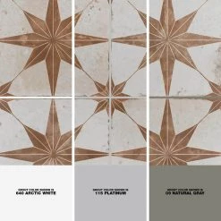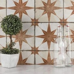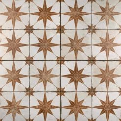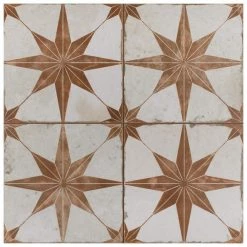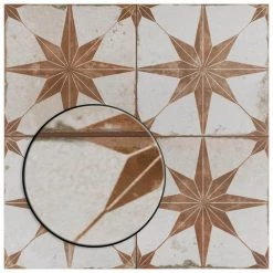 Imported from Spain, Old-world European elegance radiates from the Merola Tile Kings Star Oxide Encaustic 17-5/8 in. x 17-5/8 in. Ceramic Floor and Wall Tile. Save time and labor spent arranging smaller square tiles and instead install these durable ceramic slabs, which have four 8-3/4 squares separated by scored grout lines. The defining feature of this encaustic-inspired tile is the unique, low-sheen glaze in beige tones with centered rusted copper-colored stars in each square. Variation throughout each tile mimics an authentic aged appearance. Designed by interior architect and furniture designer Francisco Segarra, this tile is a true reflection of vintage industrial design. Realistic imitations of scuffs and spots are the marks of well-loved, worn, century-old tile bring rustic charm to your interior. There are nine different variations available that are randomly scattered throughout each case. The scored grout lines can be grouted with the color of your choice, or left ungrouted for a rugged finish.