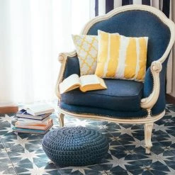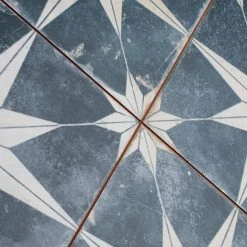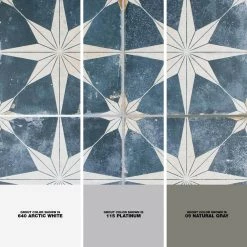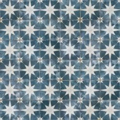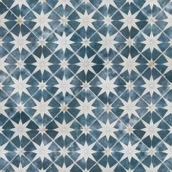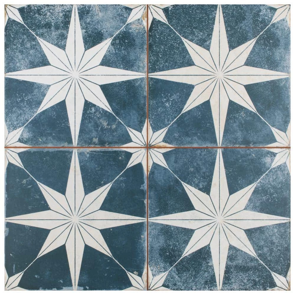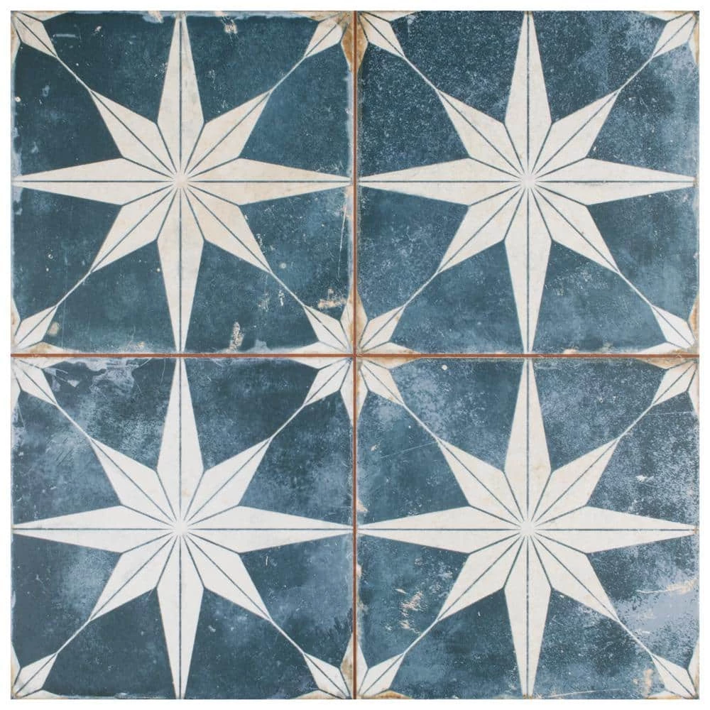 Imported from Spain, our Merola Tile Kings Star Sky Encaustic 17-5/8 in. x 17-5/8 in. Ceramic Floor and Wall Tile radiates old-world European elegance. This encaustic-inspired tile features a unique, low-sheen glaze in faded denim blue tones with centered antique white star patterns in each square. Designed by interior architect and furniture designer Francisco Segarra, this tile is a true reflection of vintage industrial design. Realistic imitations of scuffs and spots that are the marks of well-loved, worn, century-old tile bring rustic charm to any interior setting. These rustic scuffs and spots convince that this tile is truly aged. Available in 7 print variations that are randomly scattered throughout each case, the variation throughout each tile mimics an authentic aged appearance. Save time and labor spent arranging smaller square tiles and instead install these durable porcelain slabs, which have four 8-3/4 in. squares separated by scored grout lines. The scored grout lines can be grouted with the color of your choice, or left ungrouted for a rugged finish. It’s durable, ADA-compliant and glazed features make this tile an ideal choice for indoor residential use, including kitchen backsplashes, bathrooms and showers. Tile is the better choice for your space. This tile is made from natural ingredients, making it a healthy choice as it is free from allergens, VOCs, formaldehyde and PVC.