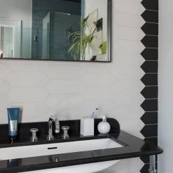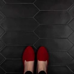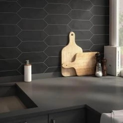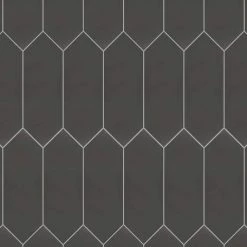 The Merola Tile Kite Black 4 in. x 11-3/4 in. Porcelain Floor and Wall Subway Tile offers a unique, picket shape format that is great for bringing a contemporary look to any living space. This elongated hexagon tile has a rich black satin glazed finish that brings a modern feel to your floor or wall installation. There is slight undulation throughout each piece for added dimension. With a wide variety of layout and color options that can be incorporated with one another, this tile is perfect for expressing your creativity. This tile offers a medium resistance to abrasion, making it great for any residential floor use, including kitchens, showers and even patios.