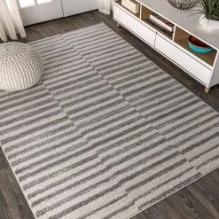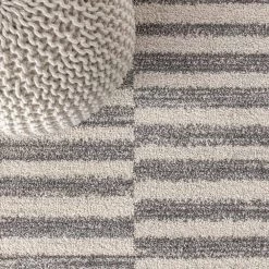 Inspired by vintage kilims and Moroccan rugs, our modern striped rug is power-loomed with a short pile. The offset stripe pattern is woven in ivory and gray; the mingled threads recall traditional handwoven rugs. Add some Bohemian style to your home with this easy-care rug.