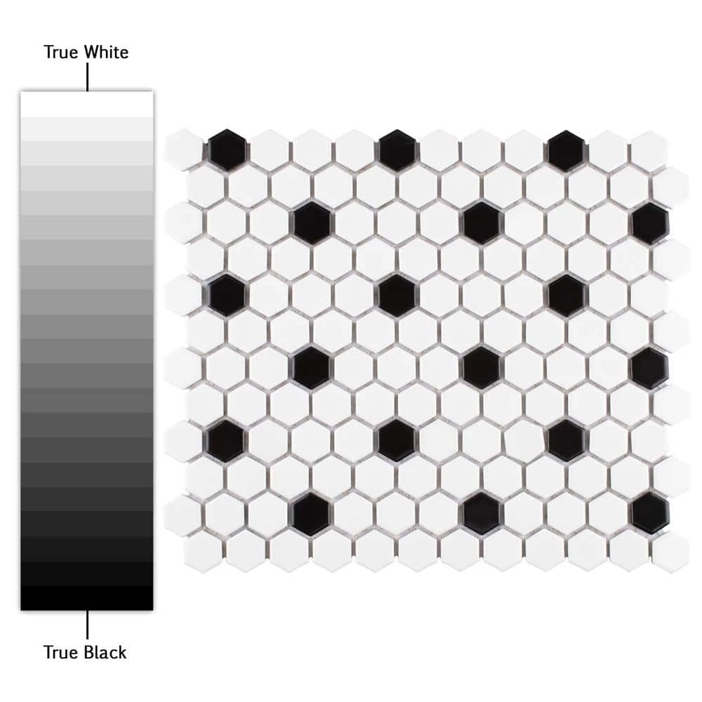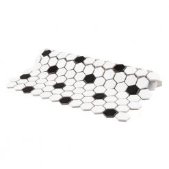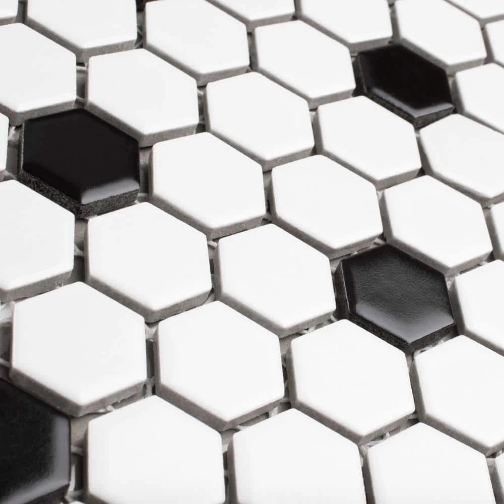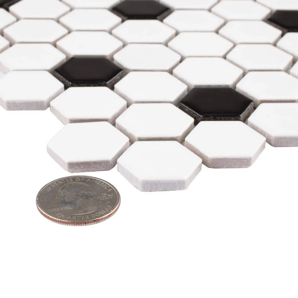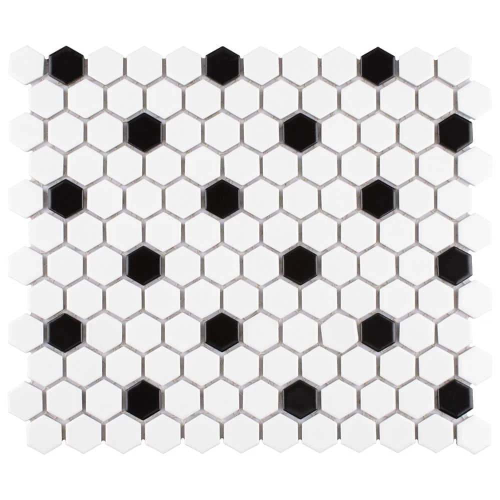 Transform your home into a tribute to retro design with the Merola Tile Madison Hex Matte Cool White with Black Dot Porcelain Mosaic Tile. This time-tested classic 1 in. hexagon chip mosaic is a throwback to traditional retro design. Matte cool white hexagons are accented by contrasting matte black hexagons precisely arranged on an interlocking mesh to create a seamless installation. This hardy, easy-to-clean tile is frost resistant, making it ideal for your light-traffic spaces whether they’re indoors or out.
