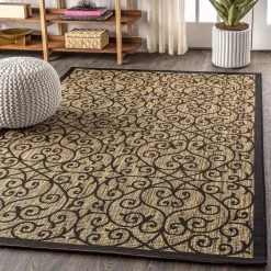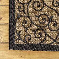 With its filigree design inspired by Spanish wrought iron, our Boho-chic rug adds eclectic style to an outdoor porch or patio. Varied tones of beige and brown mingled with a black pattern give this rug a hand-woven, vintage vibe. The flatweave design is great for high-traffic spaces indoors too.